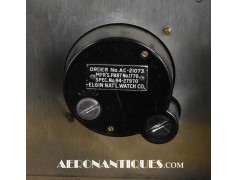 Superbe montre de bord Type A-11 de fabrication ELGIN, circa 1942-43, mouvement 8 jours à remontage manuel, en parfait état de marche. Boîtier bakélite noire, trotteuse, bouton de mise à l'heure/remontage positionné à 7h. Bien marquée "A.C (Air Corps) U.S. ARMY" sur le cadran. Présentée sur un superbe support d'époque en aluminium poli (130 mm X 120 mm). Ce type d'horloges équipaient la plupart des appareils de l'US Army Air Force durant la Seconde Guerre Mondiale, chasseurs, bombardiers et appareils de transport.