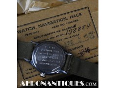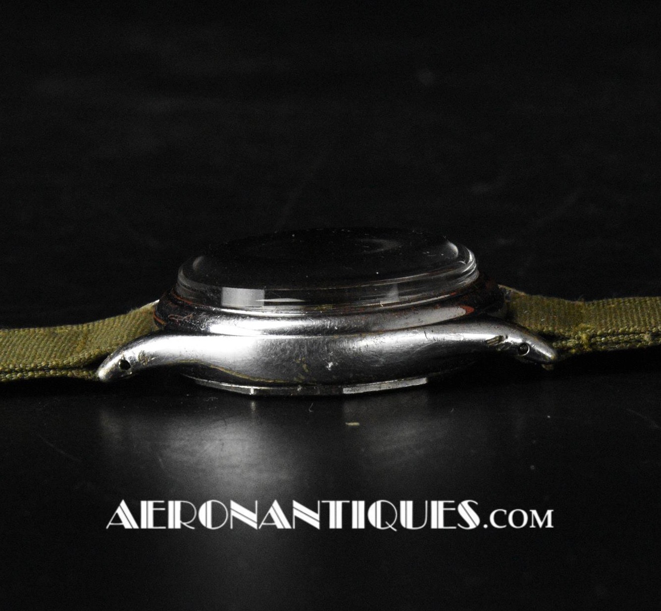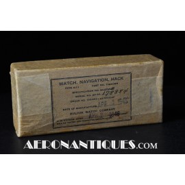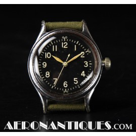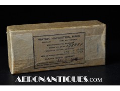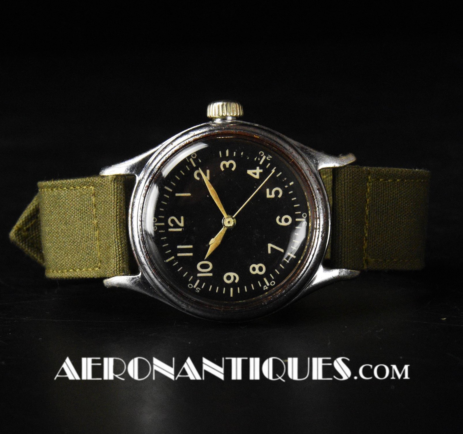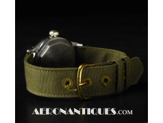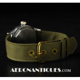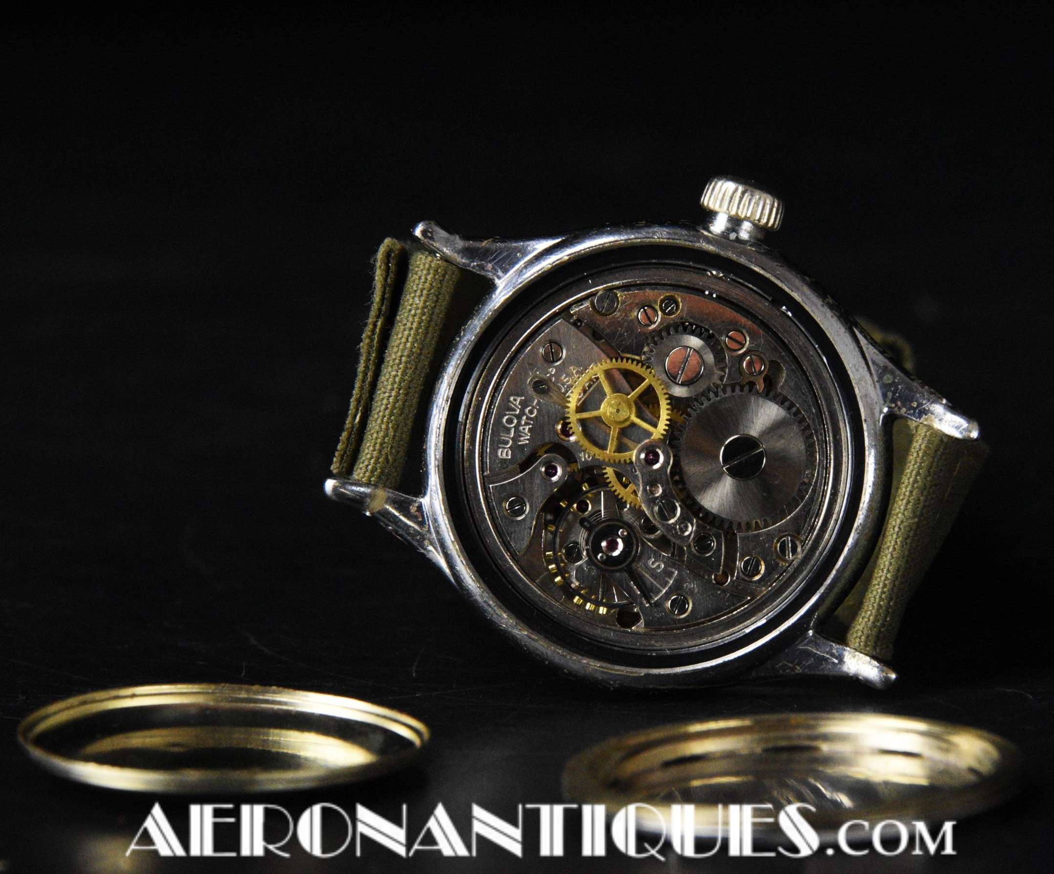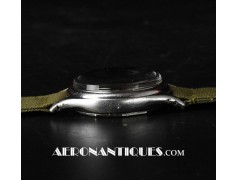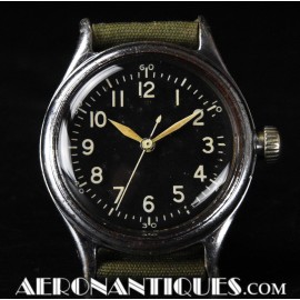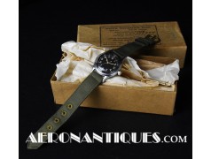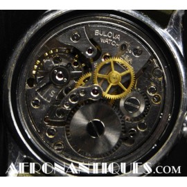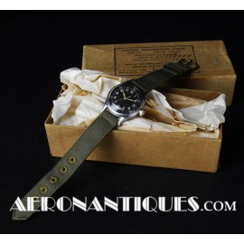 Montre bracelet Type A-11 de fabrication BULOVA, production de 1945, mouvement mécanique à remontage manuel type 10AKSH, révisée en 2025 par maître horloger et en parfait état de marche avec code de date correspondant à l'année 1945 (triangle). Boîtier acier nickelé, trotteuse, couronne de mise à l'heure/remontage positionnée à 3h. Bracelet original en coton OD#7. La très rare boîte d'origine correspond au modèle mais pas au numéro de série. Ce type de montres équipaient la plupart des pilotes de l'US Army Air Force durant la Seconde Guerre Mondiale.