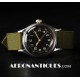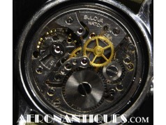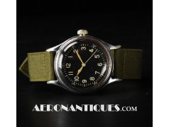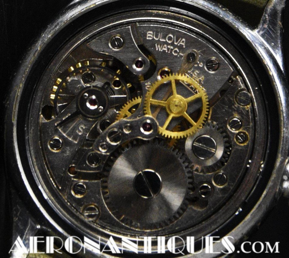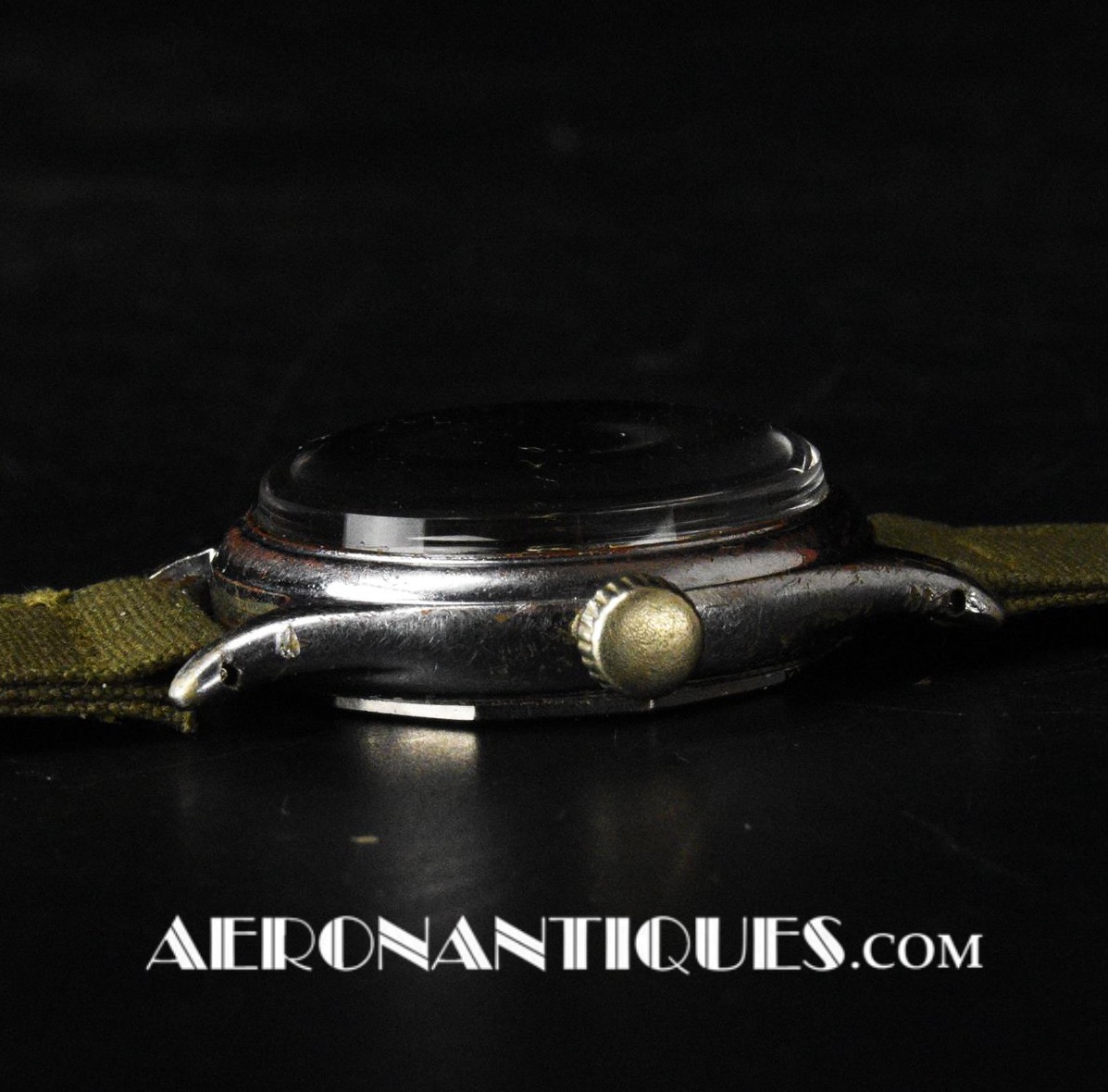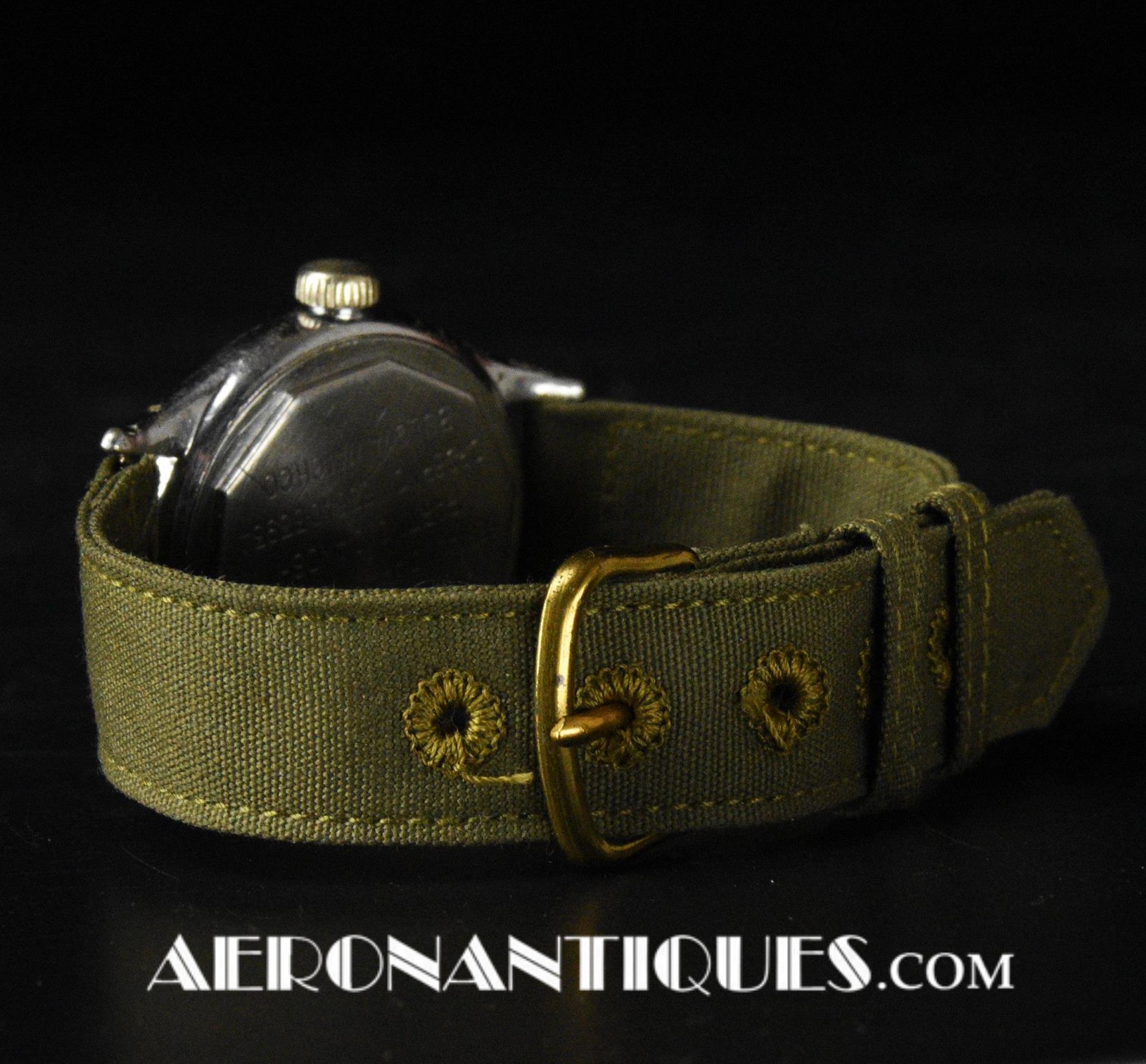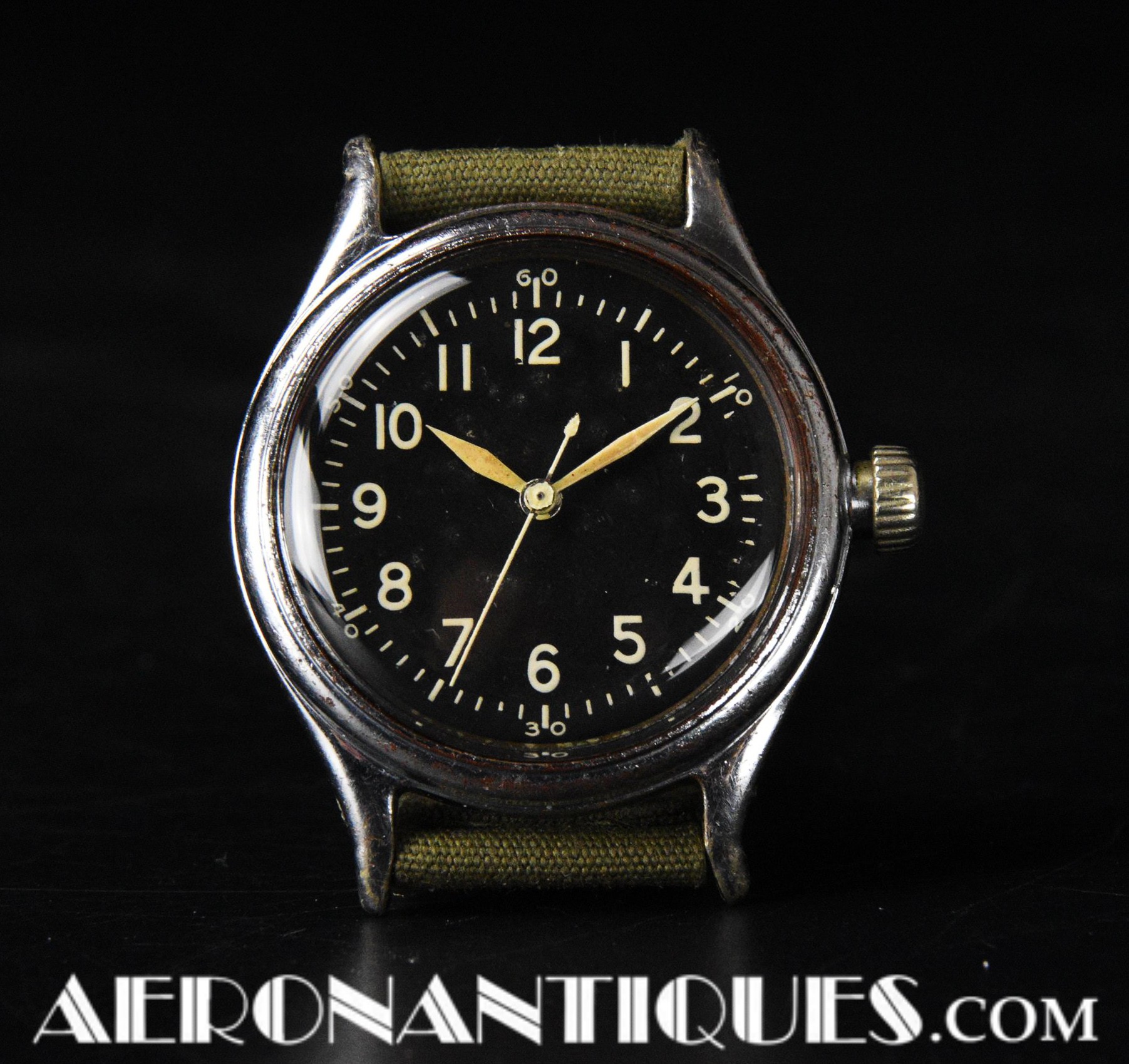 Montre bracelet Type A-11 de fabrication BULOVA, production de 1945, mouvement mécanique à remontage manuel type 10AKSH, révisée en 2025 par maître horloger et en parfait état de marche avec code de date correspondant à l'année 1945 (triangle). Boîtier acier nickelé, trotteuse, couronne de mise à l'heure/remontage positionnée à 3h. Bracelet original en coton OD#7. La très rare boîte d'origine correspond au modèle mais pas au numéro de série. Ce type de montres équipaient la plupart des pilotes de l'US Army Air Force durant la Seconde Guerre Mondiale.