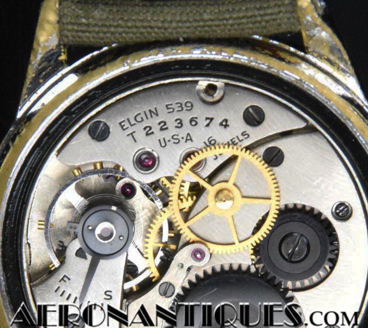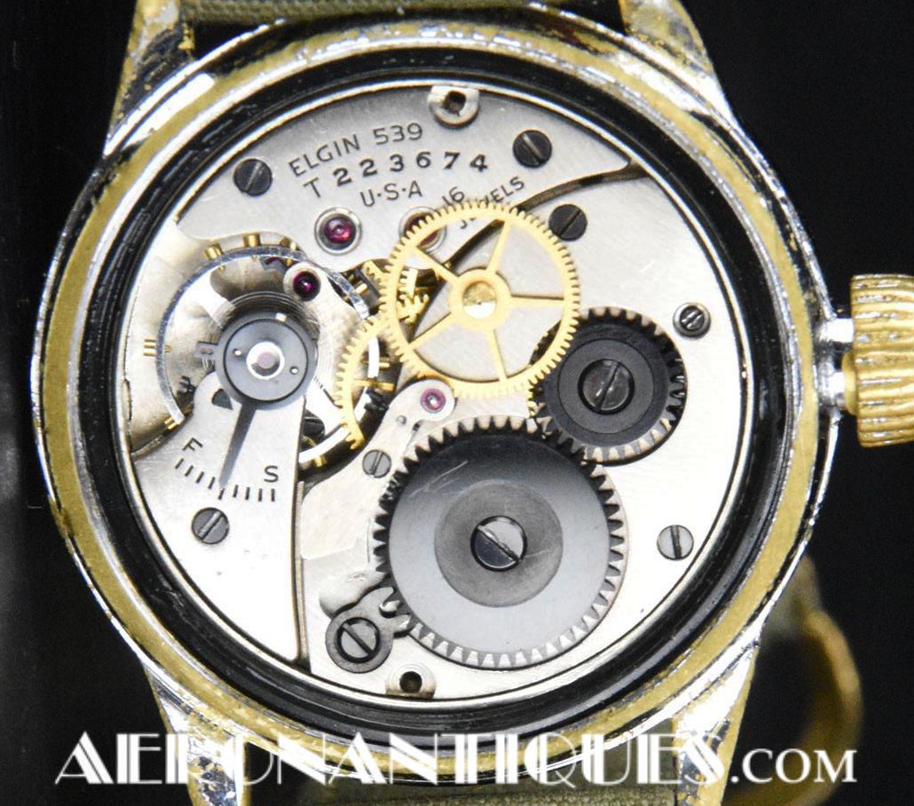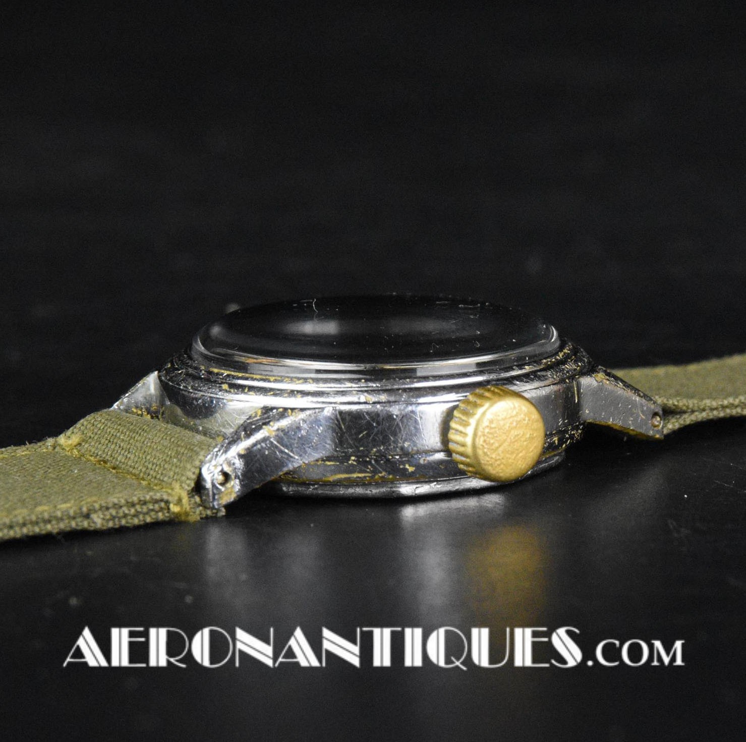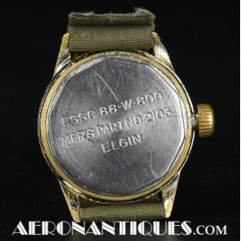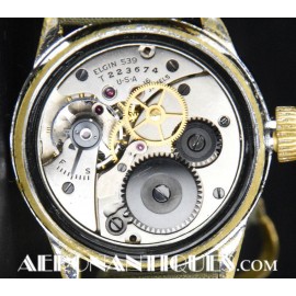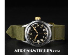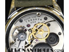 Montre bracelet US Navy Type A-11 de fabrication ELGIN, production de 1943, mouvement mécanique type 539 à remontage manuel, en parfait état de marche avec réserve de 36h. Boîtier acier nickelé, trotteuse, couronne de mise à l'heure/remontage positionnée à 3h. Numéro de référence US Navy R-88-W-800. Bracelet d'origine en coton OD#3 avec boucle laiton. Diamètre 34 mm avec couronne. Révisée par maître horloger en Octobre 2025. Ce type de montres équipaient la plupart des pilotes et équipages d'appareils de l'US Navy durant la Seconde Guerre Mondiale.