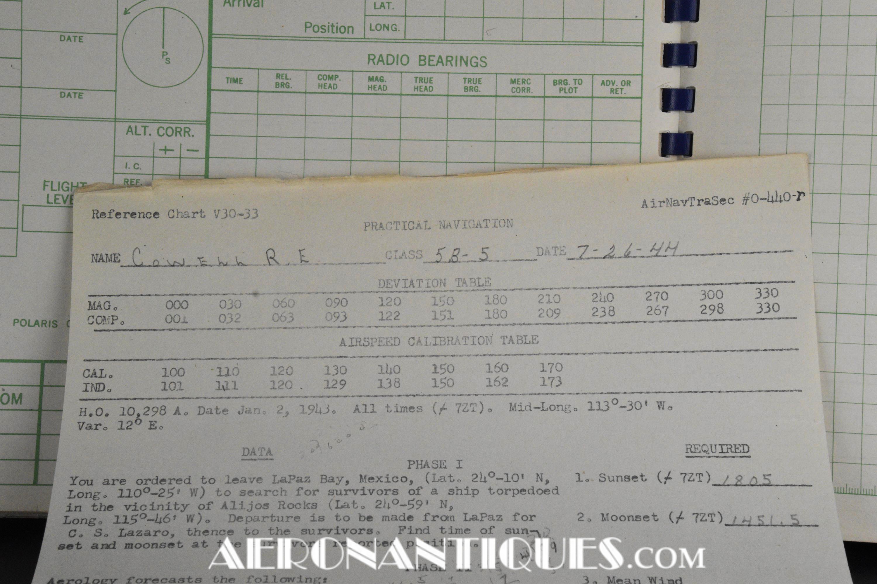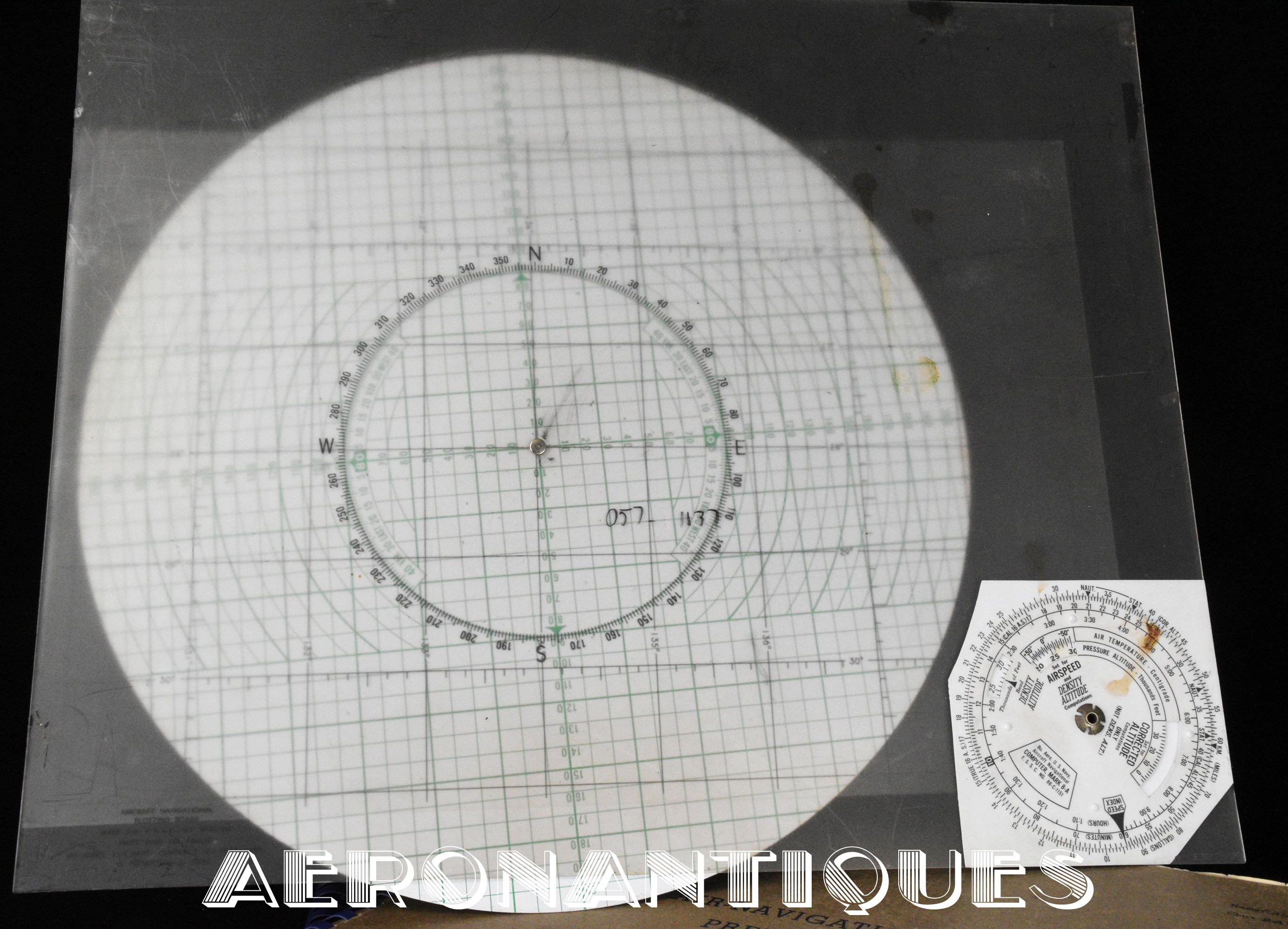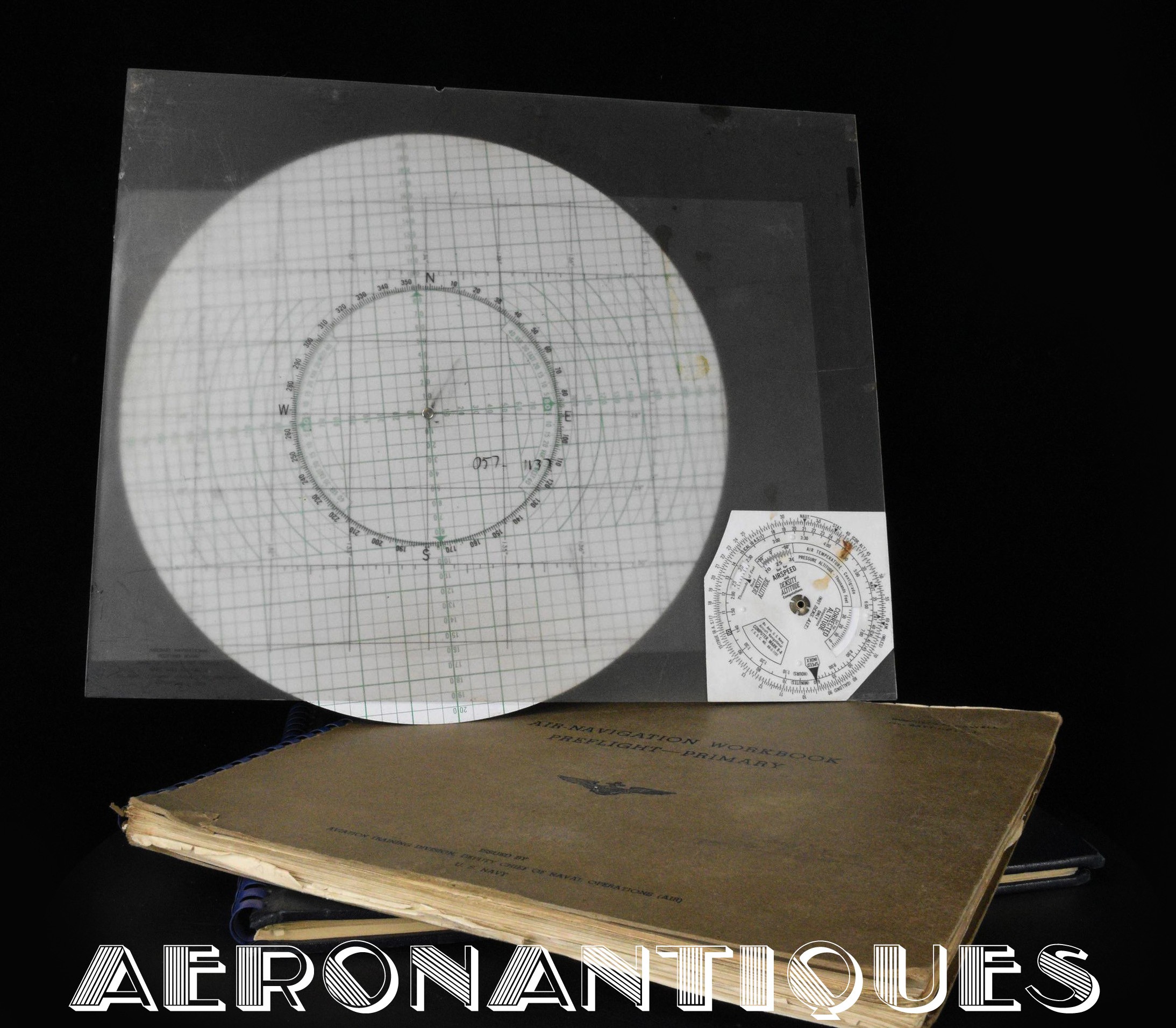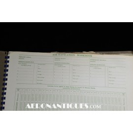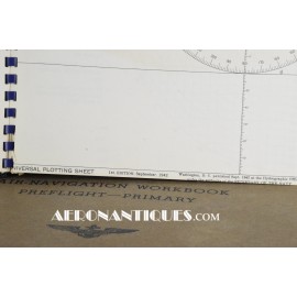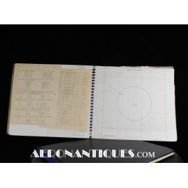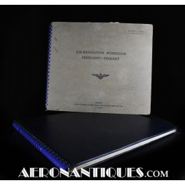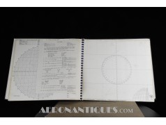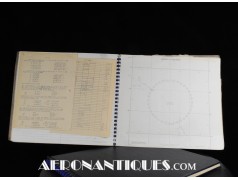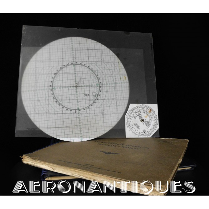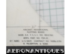 Très rare ensemble d'aides de navigation pour pilotes et navigateurs de l'US Navy. Il s'agit de la fameuse "plotting board" ou planche de calcul et repérage modèle Mark V A, contrat USN WWII. C'est un insert en celluloïd qui se glisse dans un support métallique que l'on peut utiliser comme table de travail dans le cockpit (support métallique non inclus). Il est accompagnée de ses deux cahiers, un de théorie et l'autre d'exercice pratique, datés 1942 et 1943. Utilisé dans les Grumman F6F Hellcats, TBF Avengers, etc..