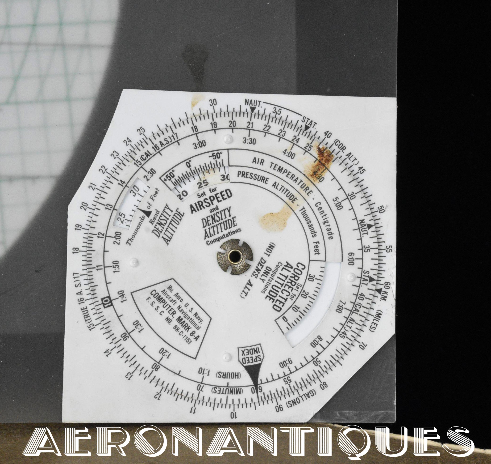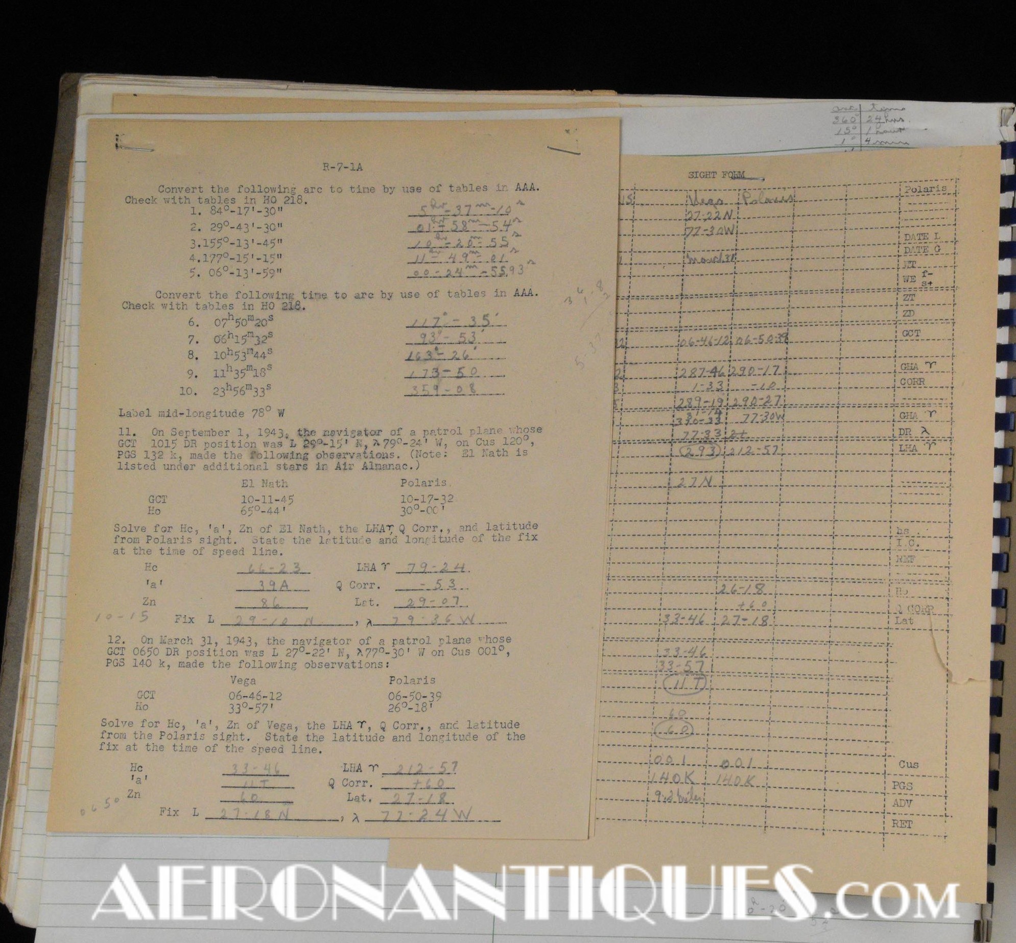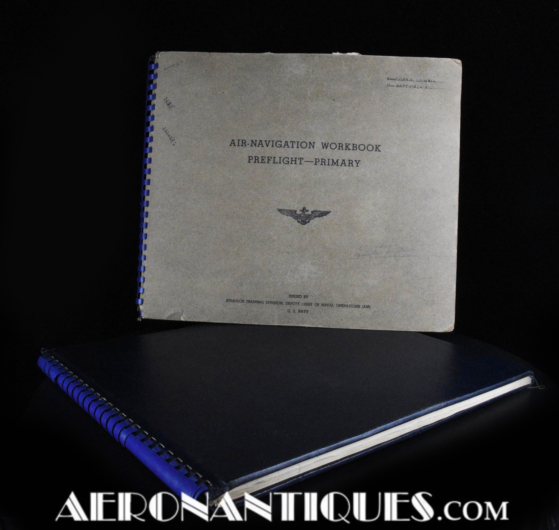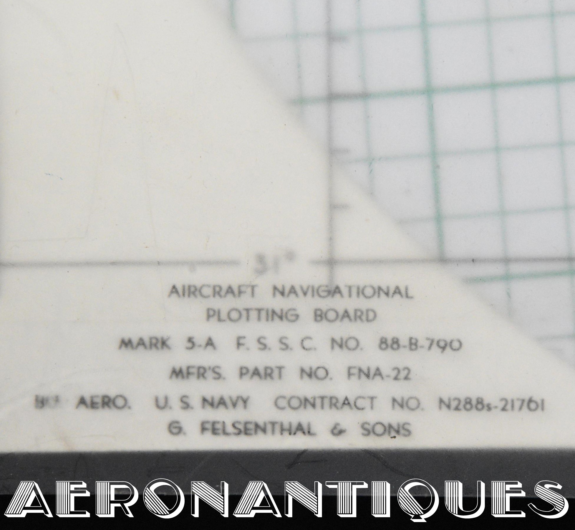 Très rare ensemble d'aides de navigation pour pilotes et navigateurs de l'US Navy. Il s'agit de la fameuse "plotting board" ou planche de calcul et repérage modèle Mark V A, contrat USN WWII. C'est un insert en celluloïd qui se glisse dans un support métallique que l'on peut utiliser comme table de travail dans le cockpit (support métallique non inclus). Il est accompagnée de ses deux cahiers, un de théorie et l'autre d'exercice pratique, datés 1942 et 1943. Utilisé dans les Grumman F6F Hellcats, TBF Avengers, etc..