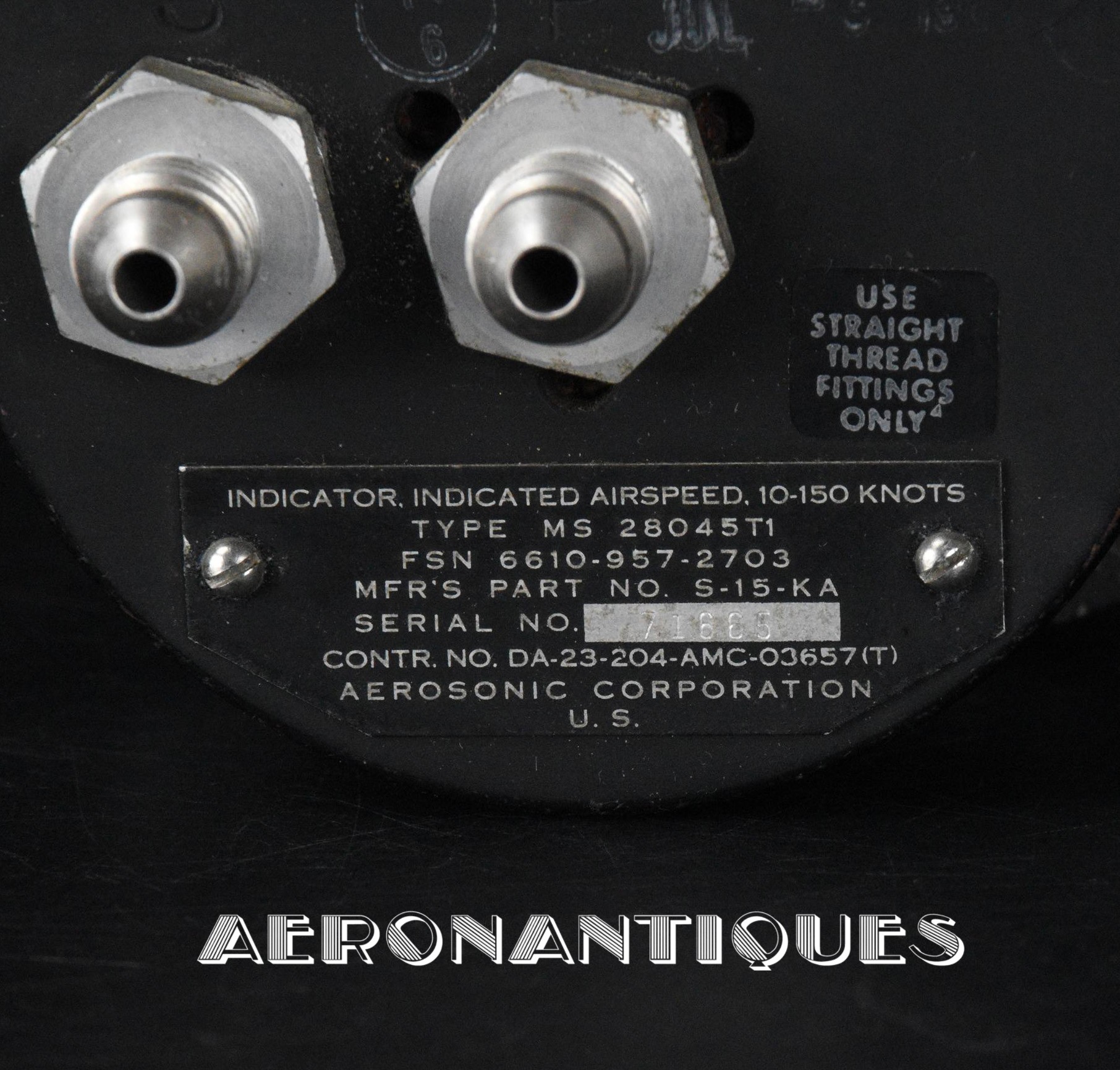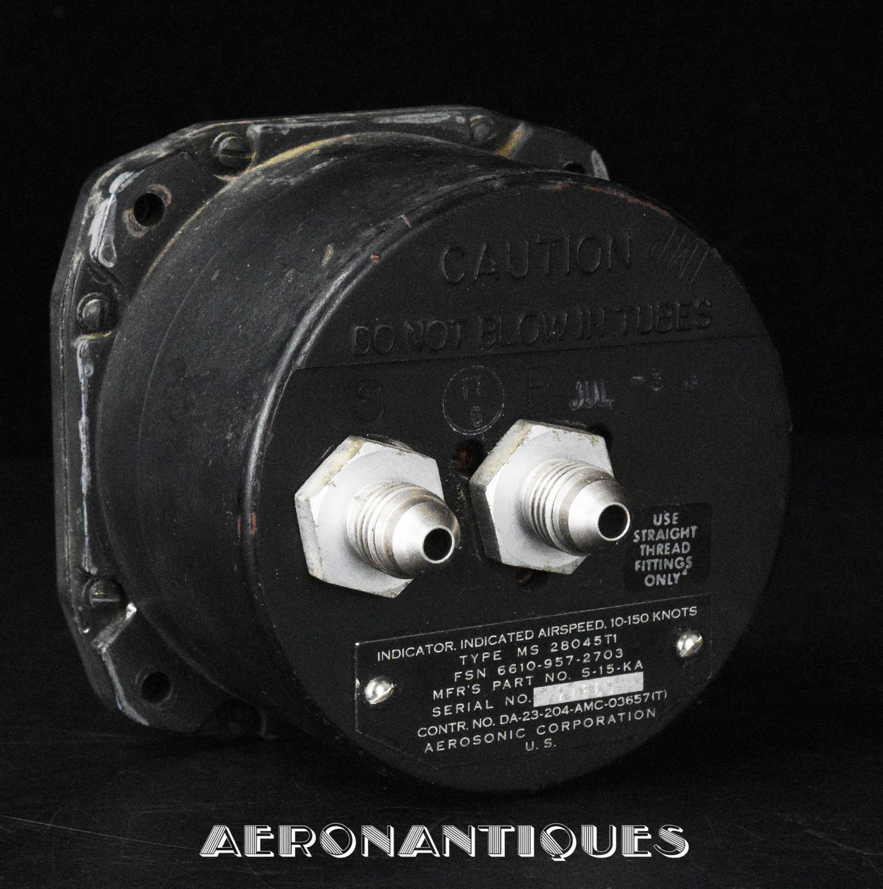 Compteur de vitesse monté sur Hélicoptères UH-1 période Vietnam. Diamètre 85 mm. Profondeur 75 mm. Très bon état. Belle pièce de vitrine.
