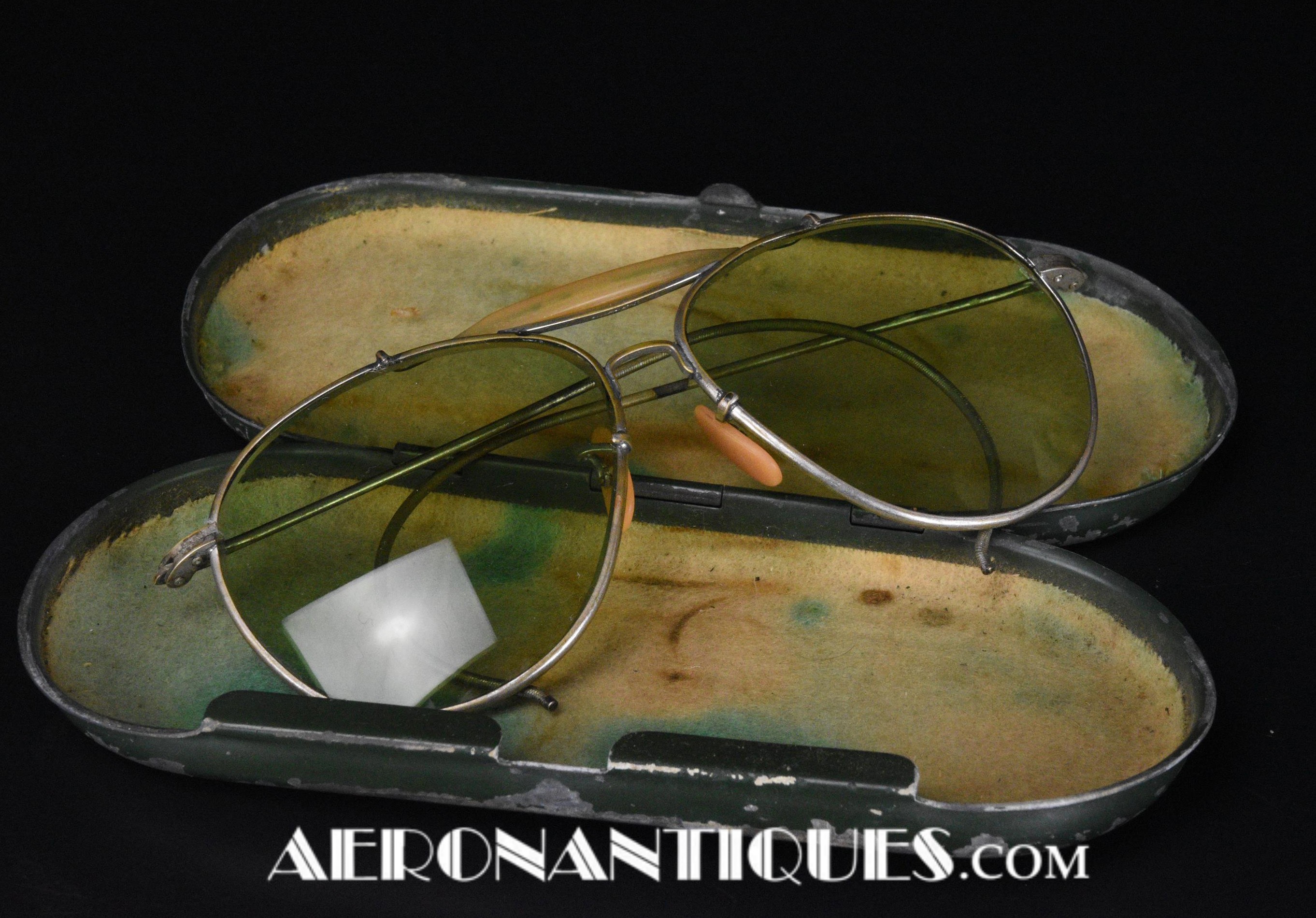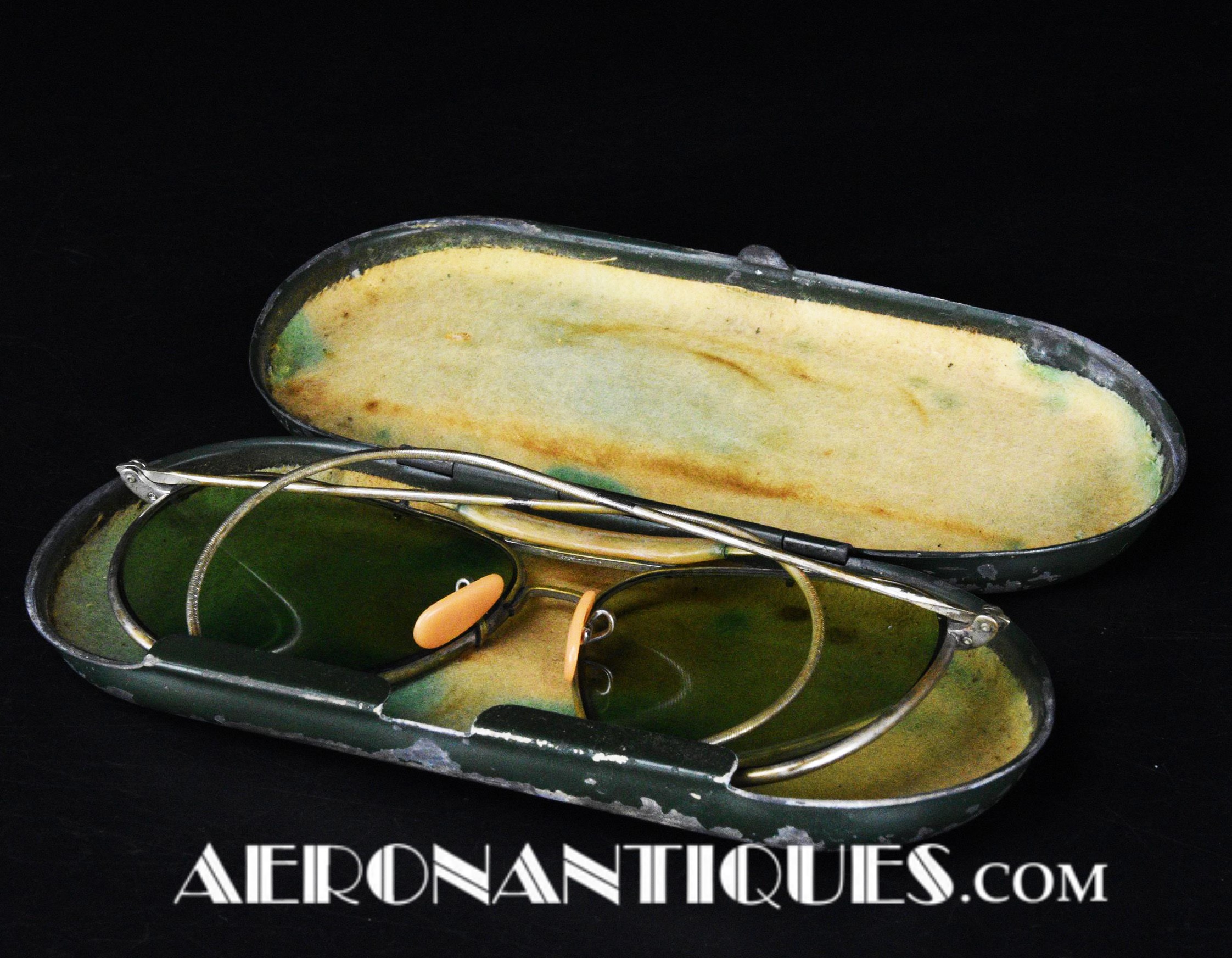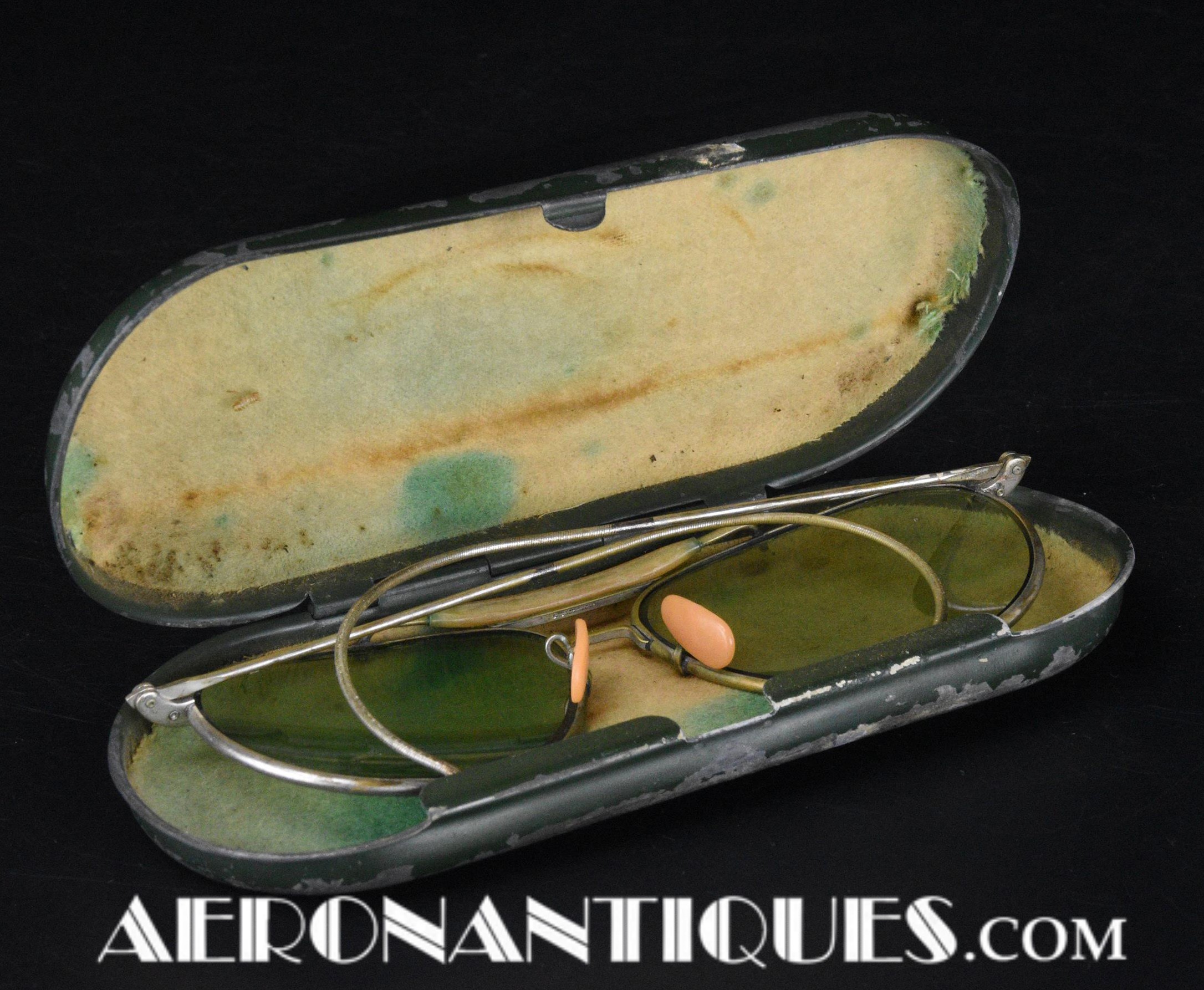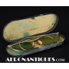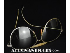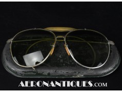 Paire de lunettes de soleil réglementaires de l'US Army Air Force fabrication Bausch & Lomb, circa 1938-43. Monture acier nickelé. Estampillées "BAUSCH & LOMB" sous le double pont et "B&L" sur les plaquettes. Verres minéraux teintés vert. Branches "comfort" flexibles pour faciliter le port des lunettes avec un serre-tête ou des écouteurs en vol. Écrin en aluminium peint en vert Army avec doublure intérieure en feutrine estampillé Bausch & Lomb sur l'abattant. Modèle idéal pour compléter une casquette type 50 missions. Très belle pièce à porter ou collectionner.