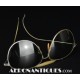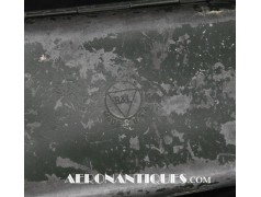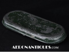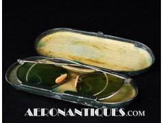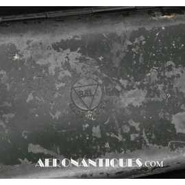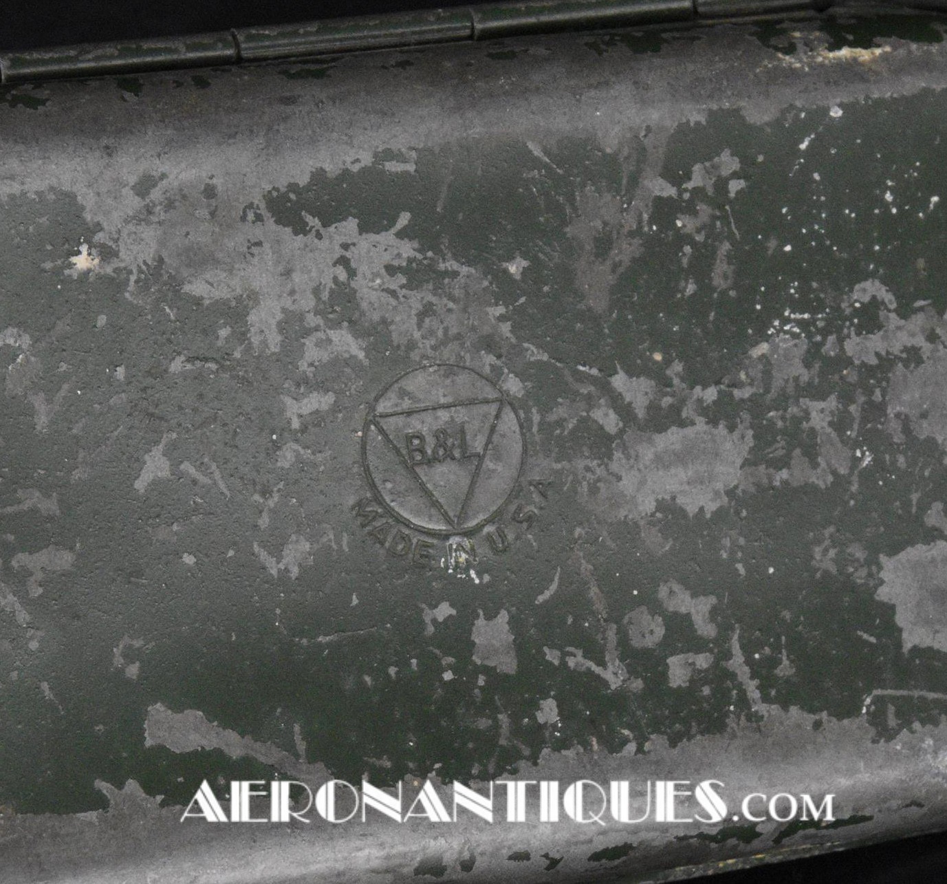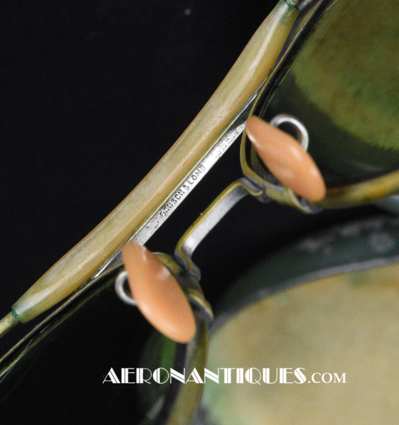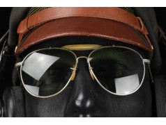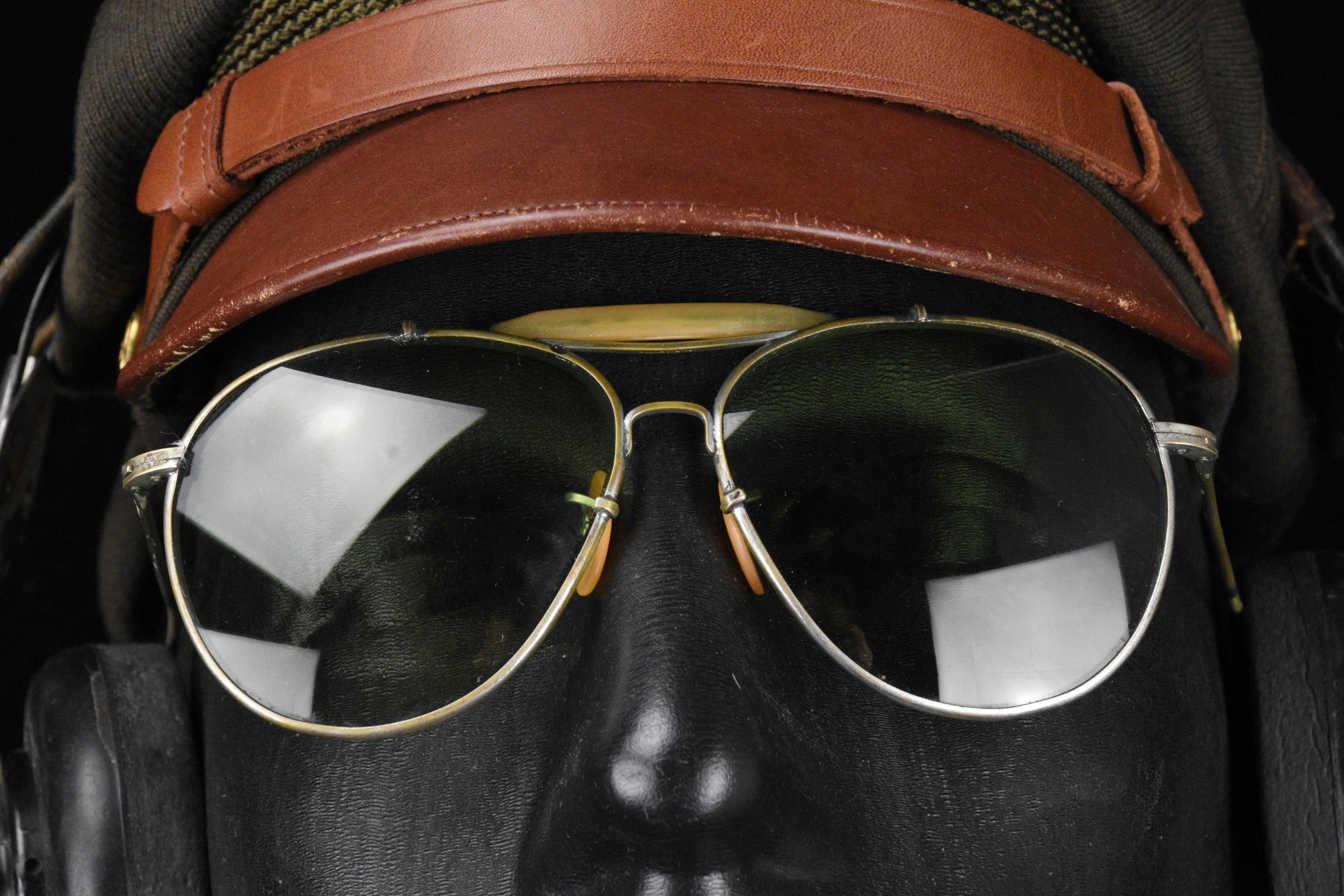Paire de lunettes de soleil réglementaires de l'US Army Air Force fabrication Bausch & Lomb, circa 1938-43. Monture acier nickelé. Estampillées "BAUSCH & LOMB" sous le double pont et "B&L" sur les plaquettes. Verres minéraux teintés vert. Branches "comfort" flexibles pour faciliter le port des lunettes avec un serre-tête ou des écouteurs en vol. Écrin en aluminium peint en vert Army avec doublure intérieure en feutrine estampillé Bausch & Lomb sur l'abattant. Modèle idéal pour compléter une casquette type 50 missions. Très belle pièce à porter ou collectionner.