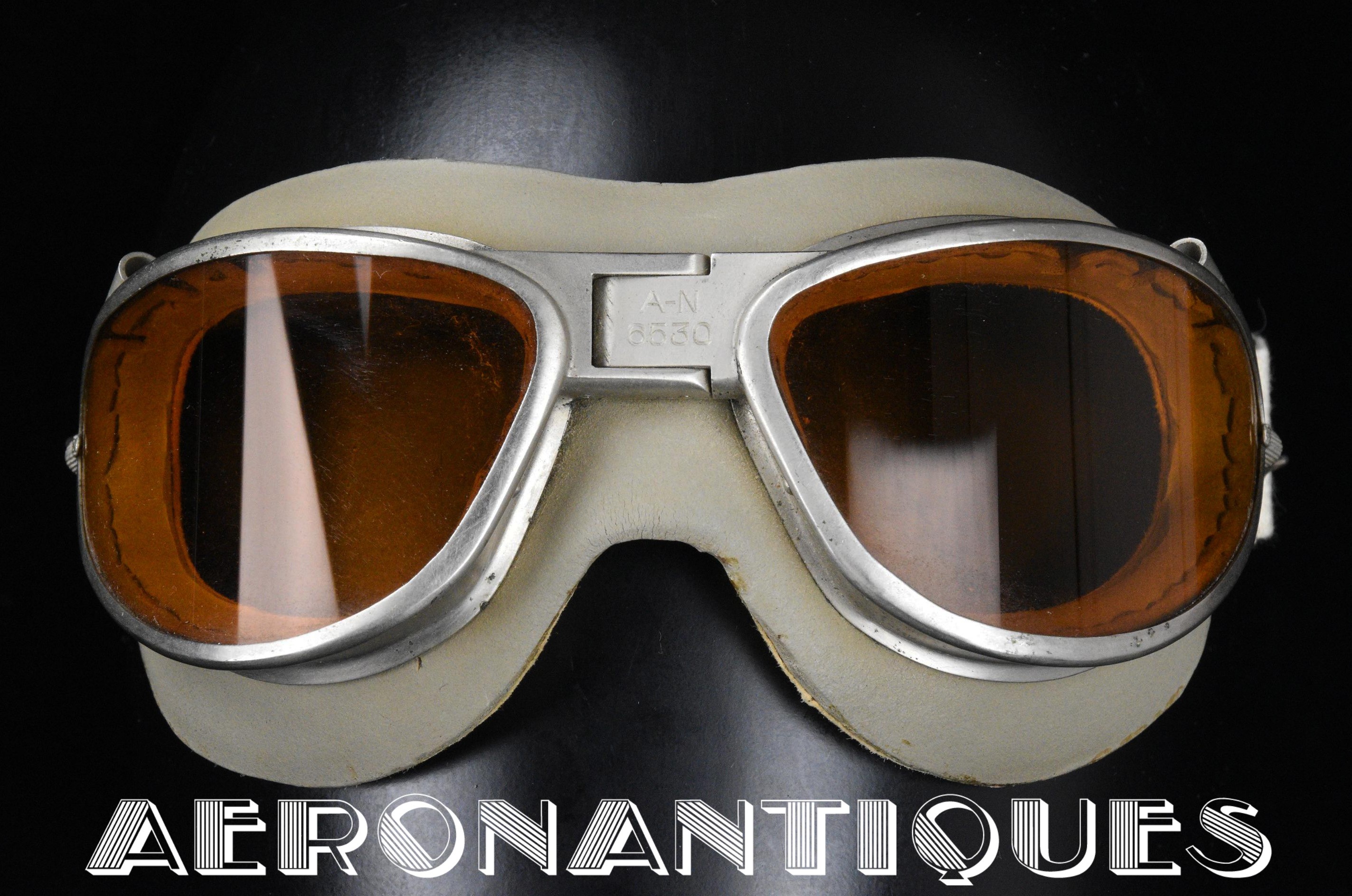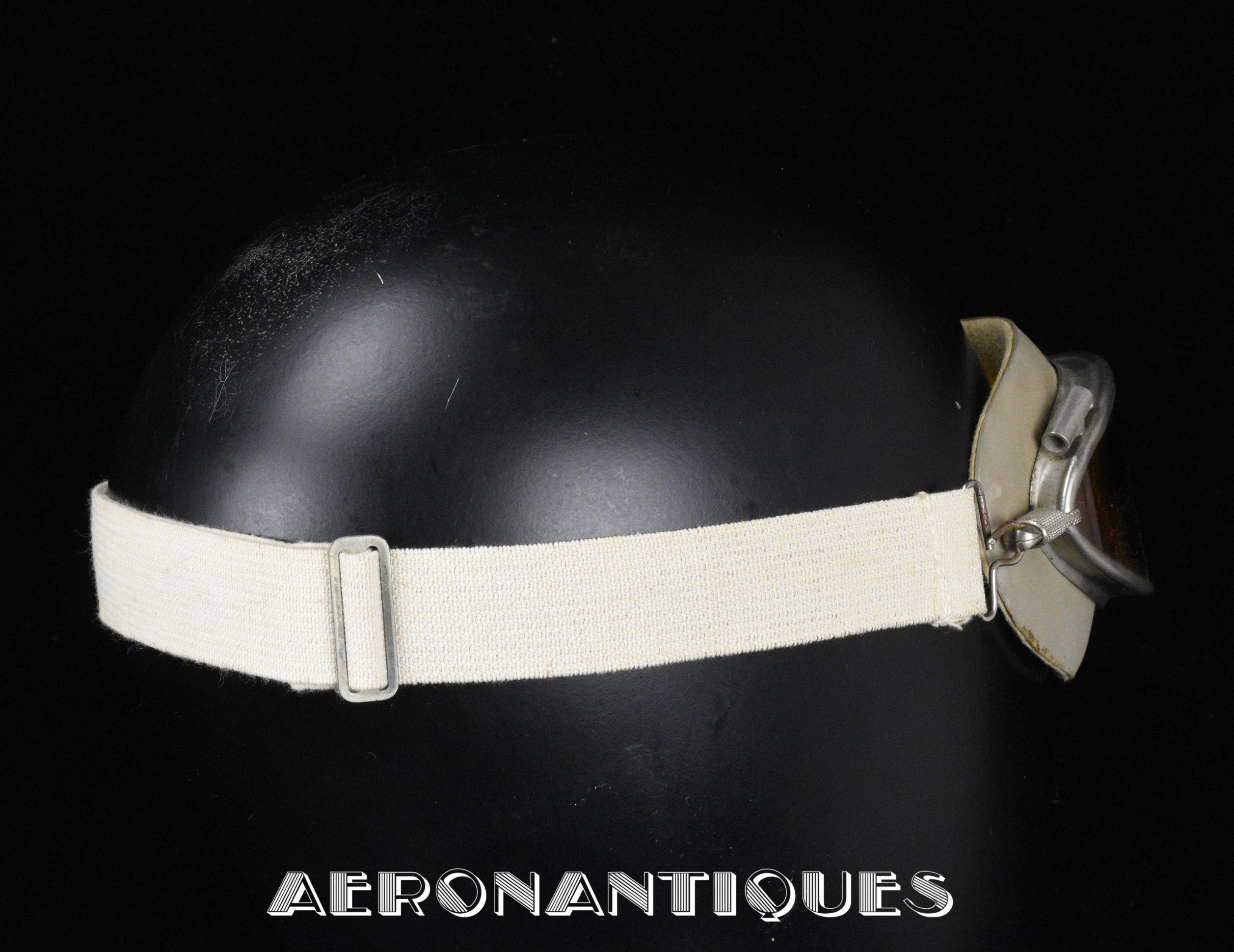 Lunettes de pilote US WWII modèle AN-6530, second modèle en une pièce, de fabrication AMERICAN OPTICAL. Verres teintés ambrés en verre minéral. Masque caoutchouc gris doublé chamois. Bande de serrage en toile élastique blanche avec boucle de réglage. Caoutchouc souple sans craquelures.