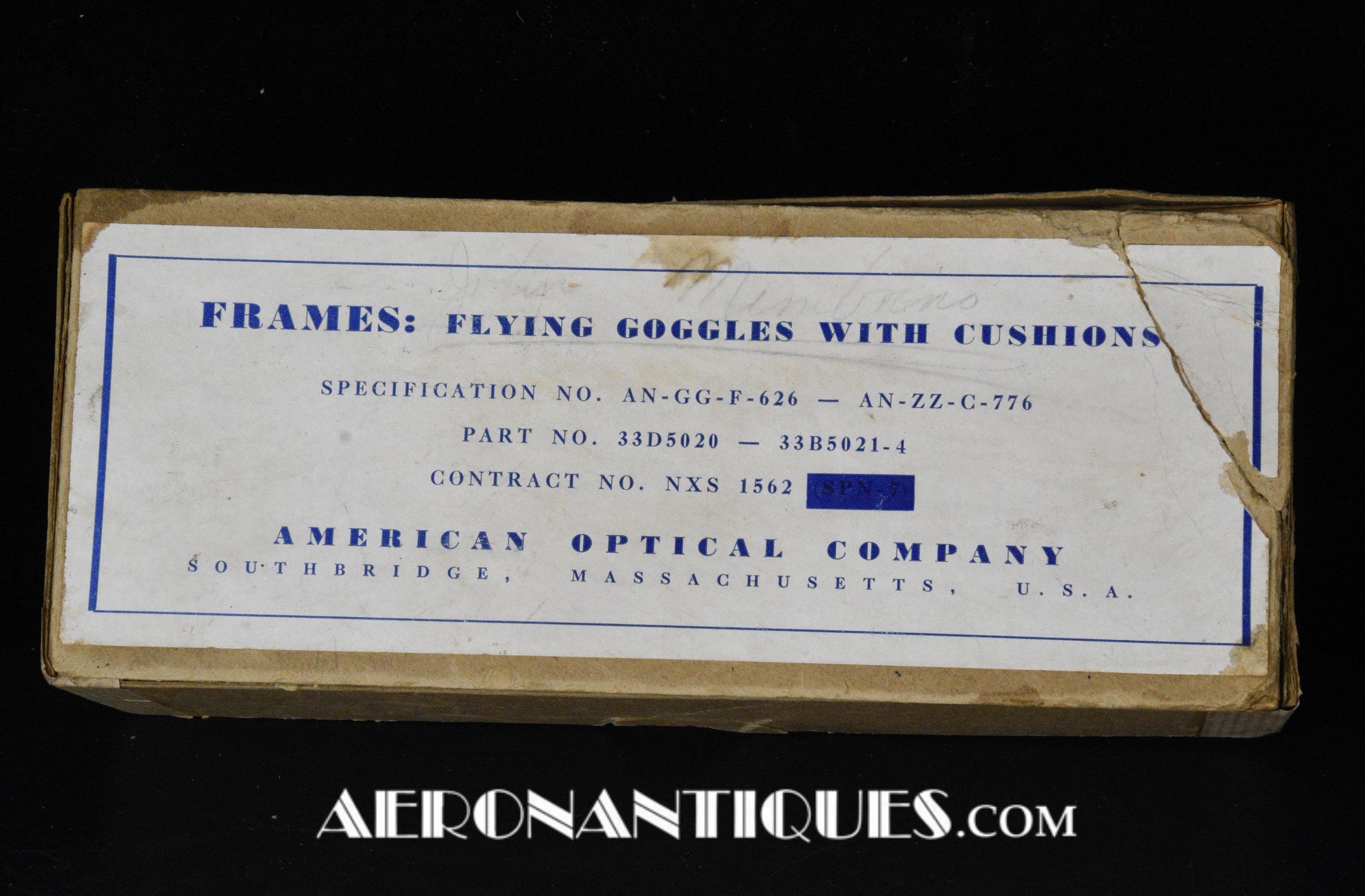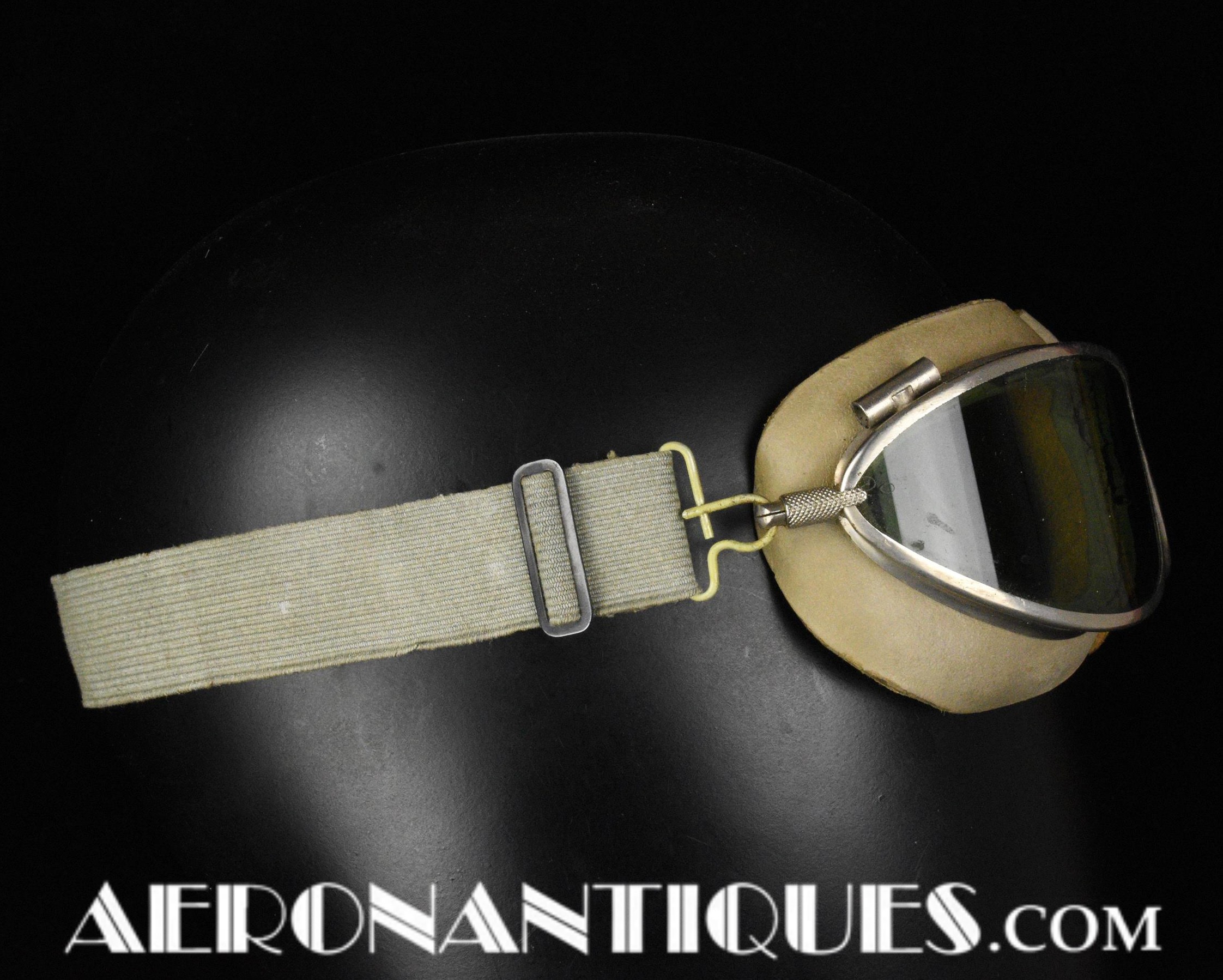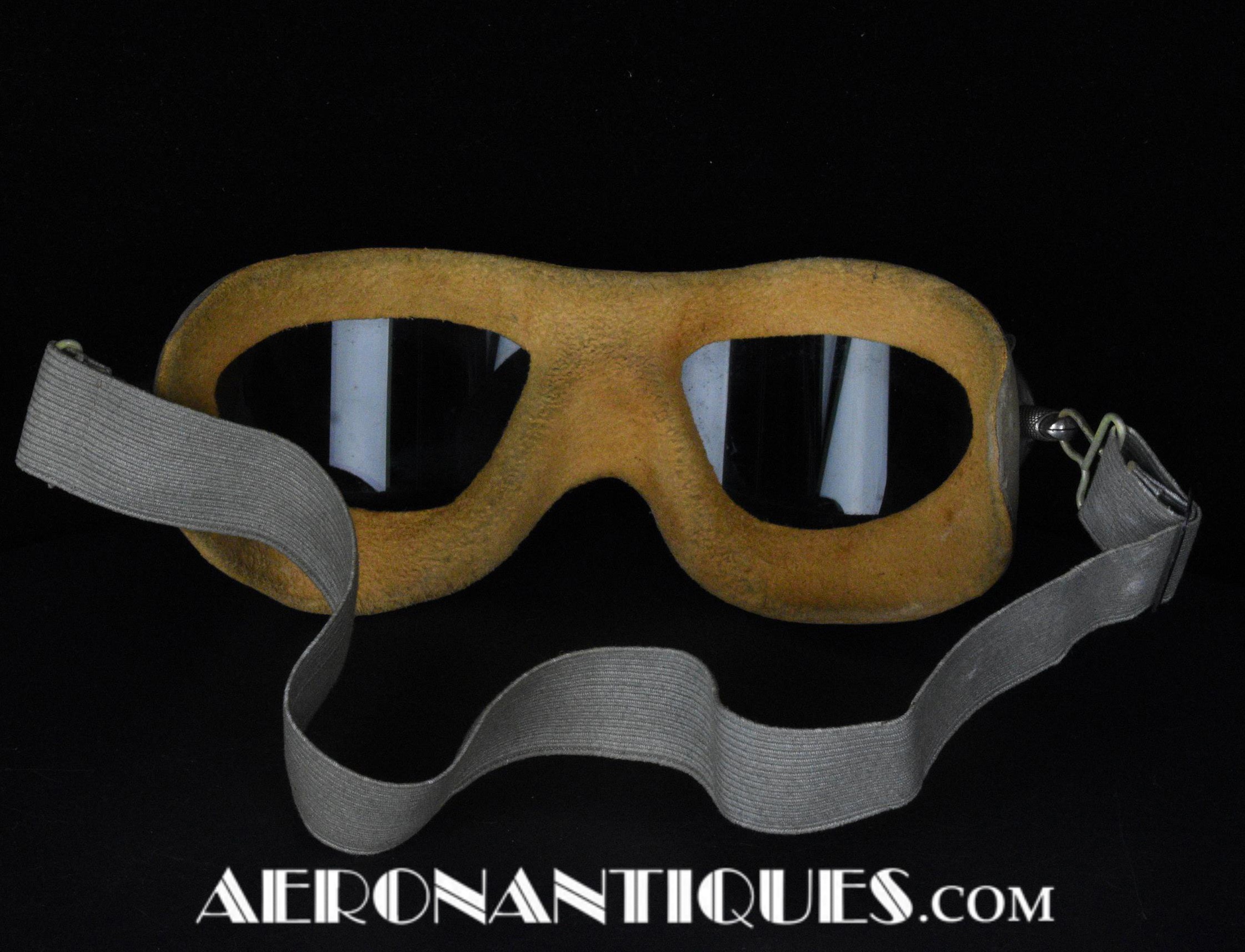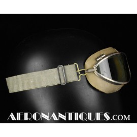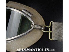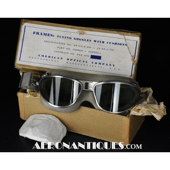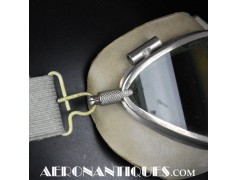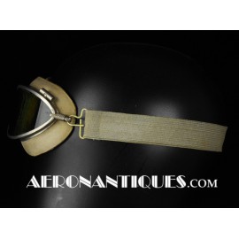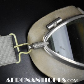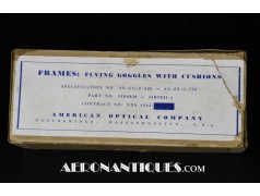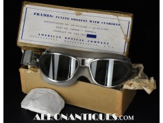 Lunettes de pilote US WWII modèle AN-6530, second modèle en une pièce, de fabrication AMERICAN OPTICAL. Verres teintés vert en verre minéral. Masque caoutchouc doublé chamois. Bande de serrage en toile élastique grise. Très bon état en boîte d'origine avec jeu de verres clairs de rechange.