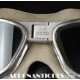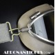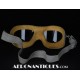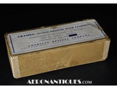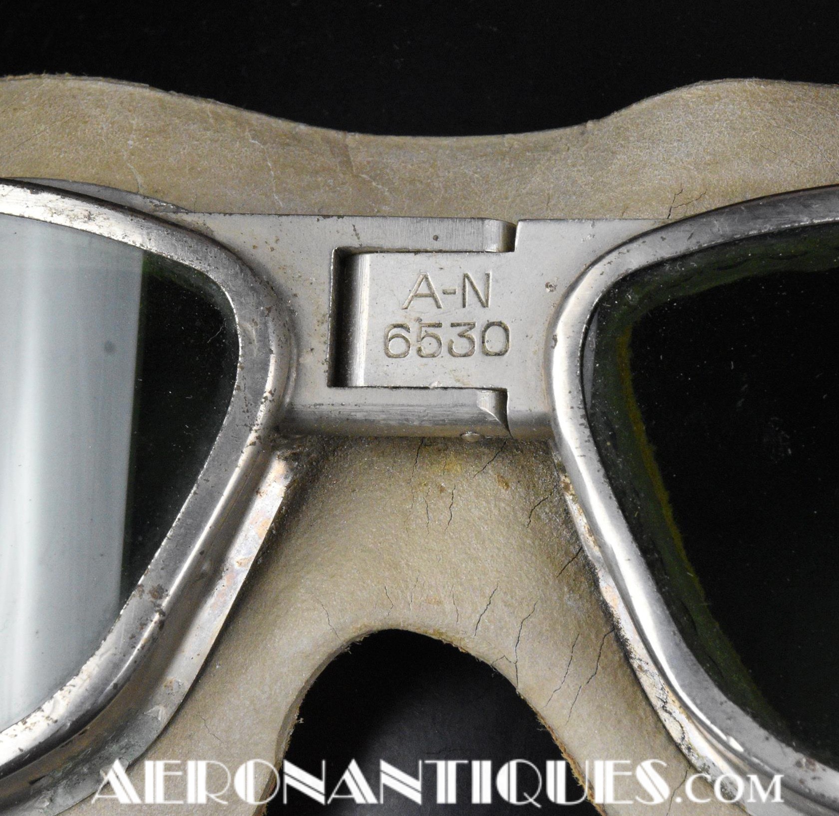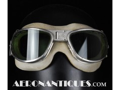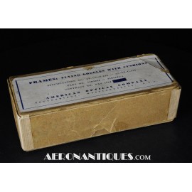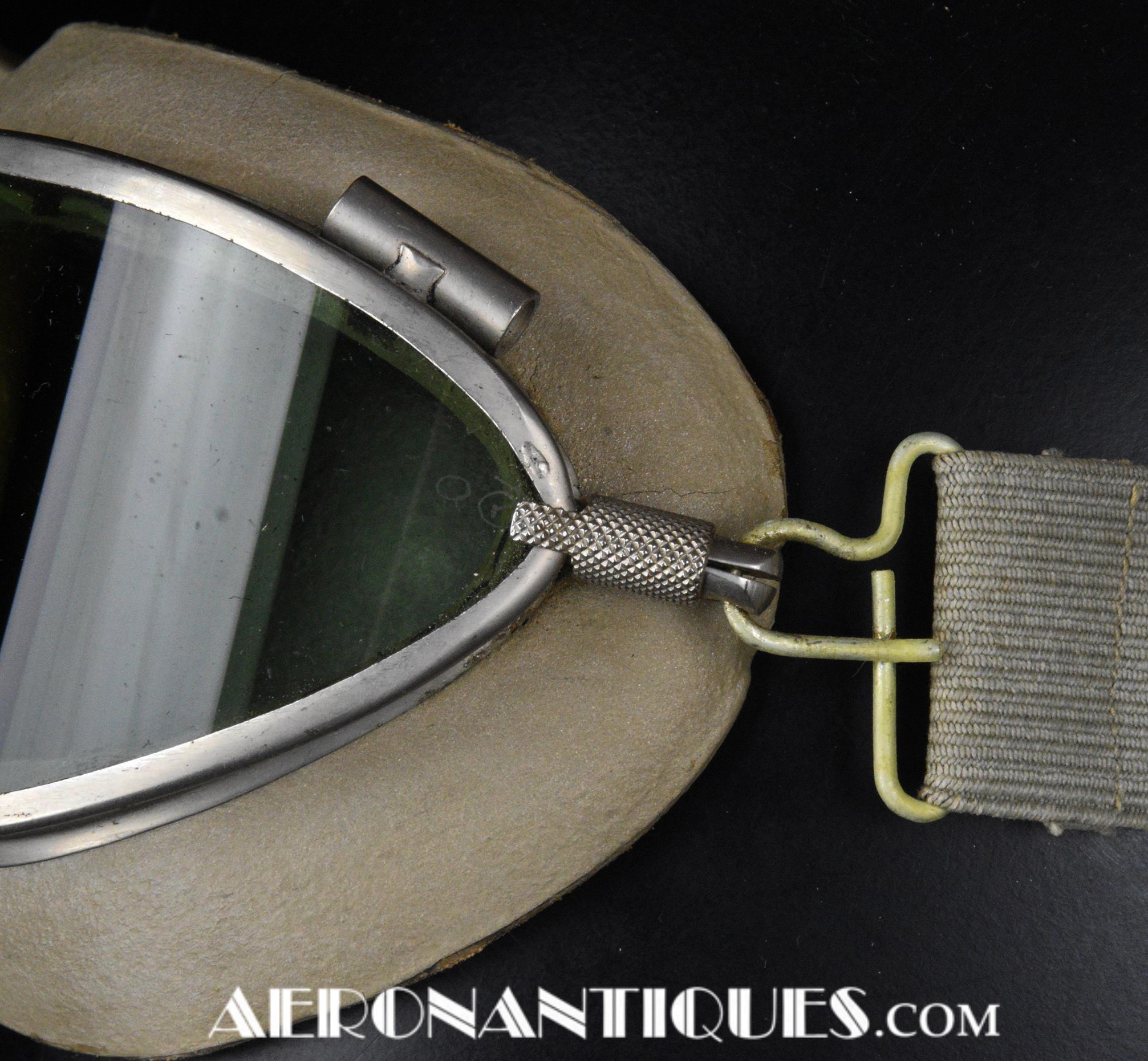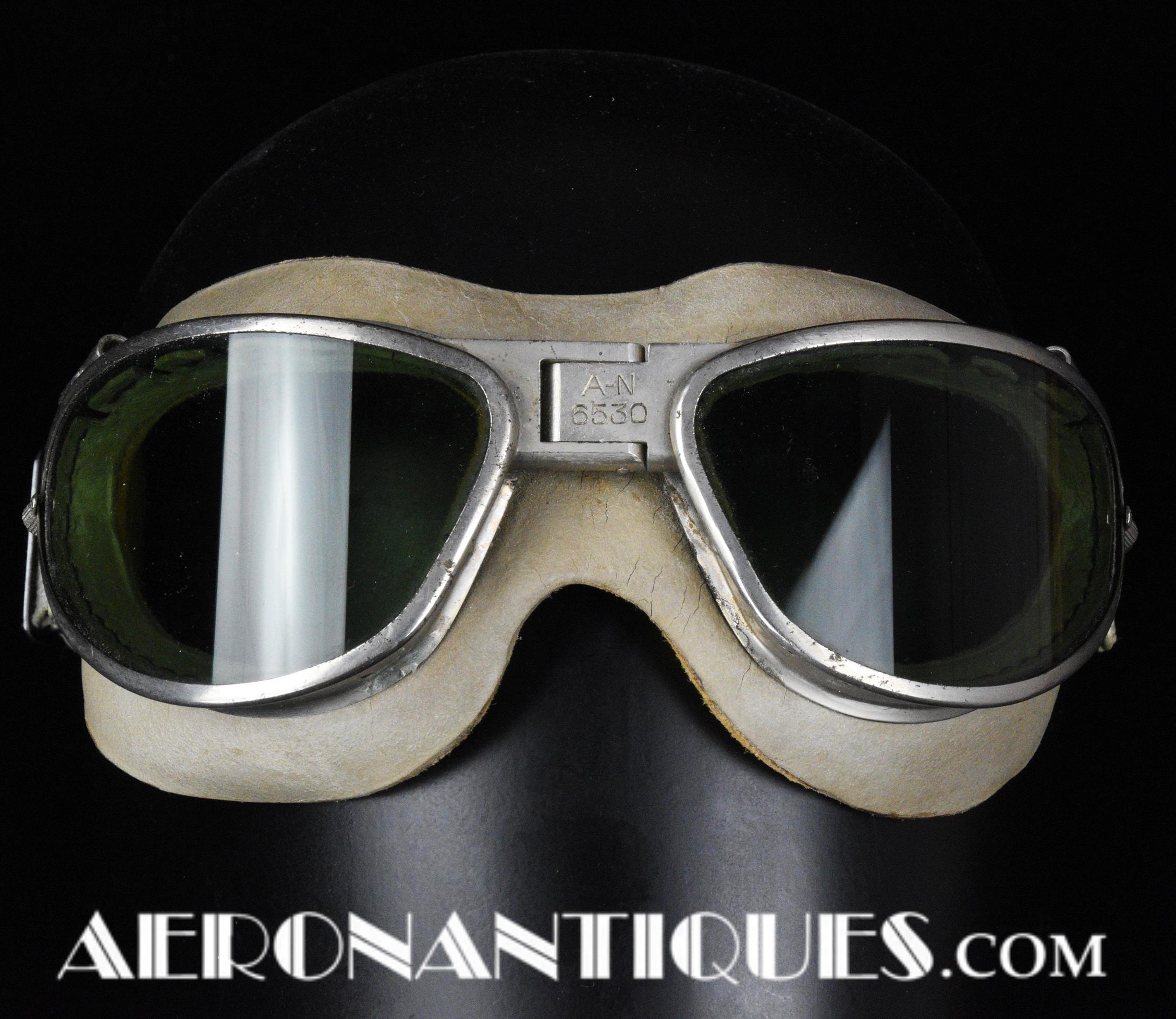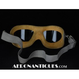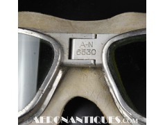 Lunettes de pilote US WWII modèle AN-6530, second modèle en une pièce, de fabrication AMERICAN OPTICAL. Verres teintés vert en verre minéral. Masque caoutchouc doublé chamois. Bande de serrage en toile élastique grise. Très bon état en boîte d'origine avec jeu de verres clairs de rechange.