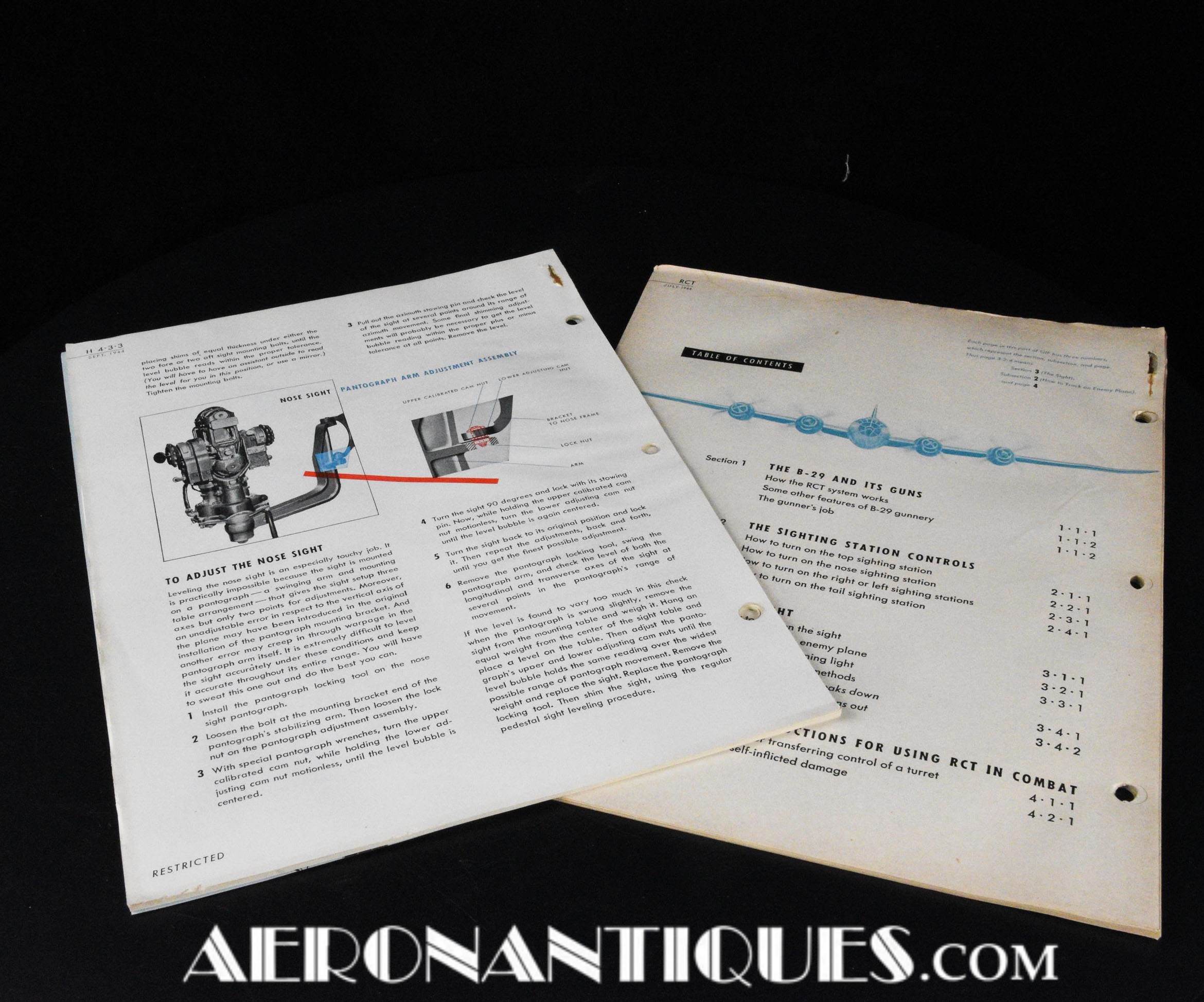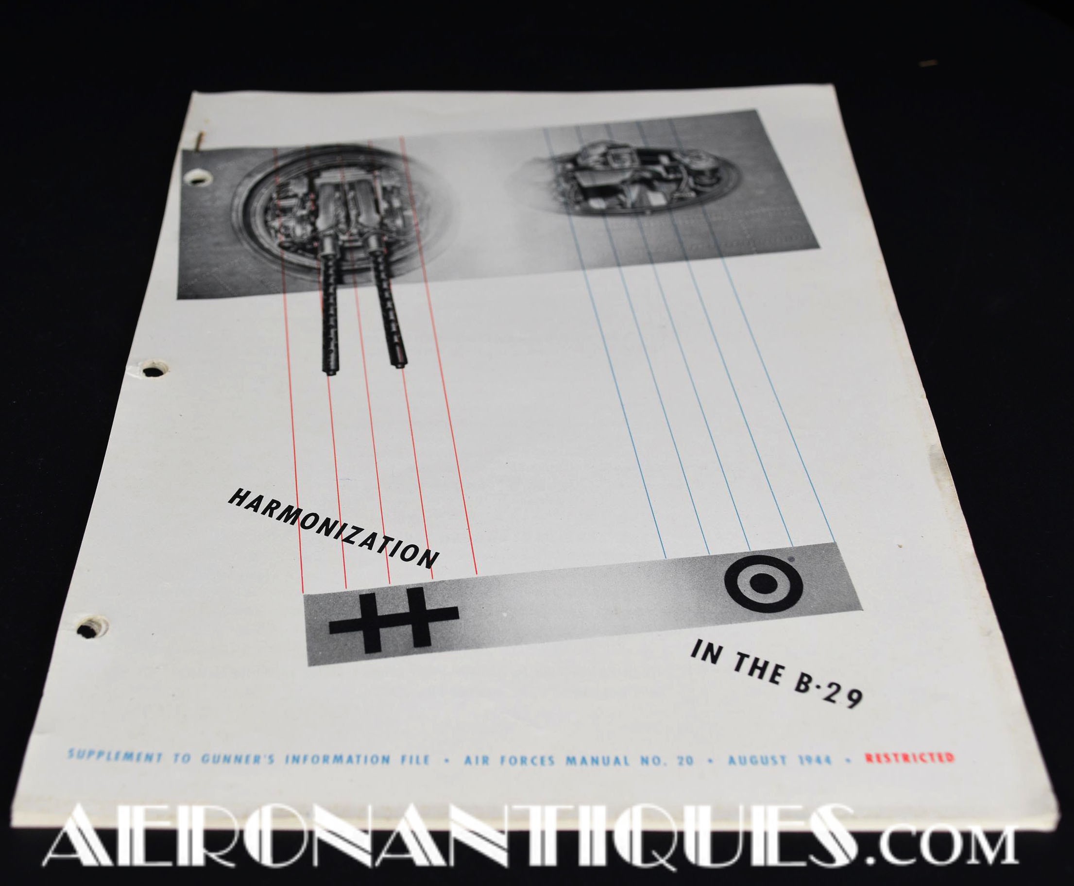 Éditions originales datée Juillet et Septembre 1944 des suppléments destinés au manuel d'information du mitrailleur (Gunner Information File) traitant des spécificités et modèles de tourelles équipant le bombardier Boeing B-29 Superfortress de l'US Army Air Force, dimensions 28 cm X 21 cm. Une centaine de pages encore attachées ensemble d'origine. Très beau manuel de référence et une source d'informations incontournable sur ce bombardier iconique de la Seconde Guerre Mondiale.