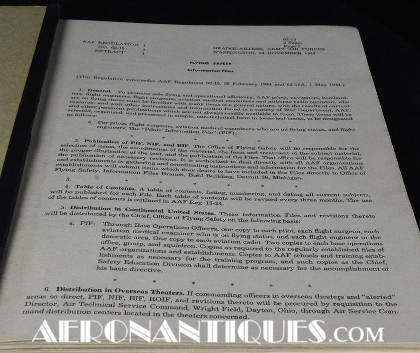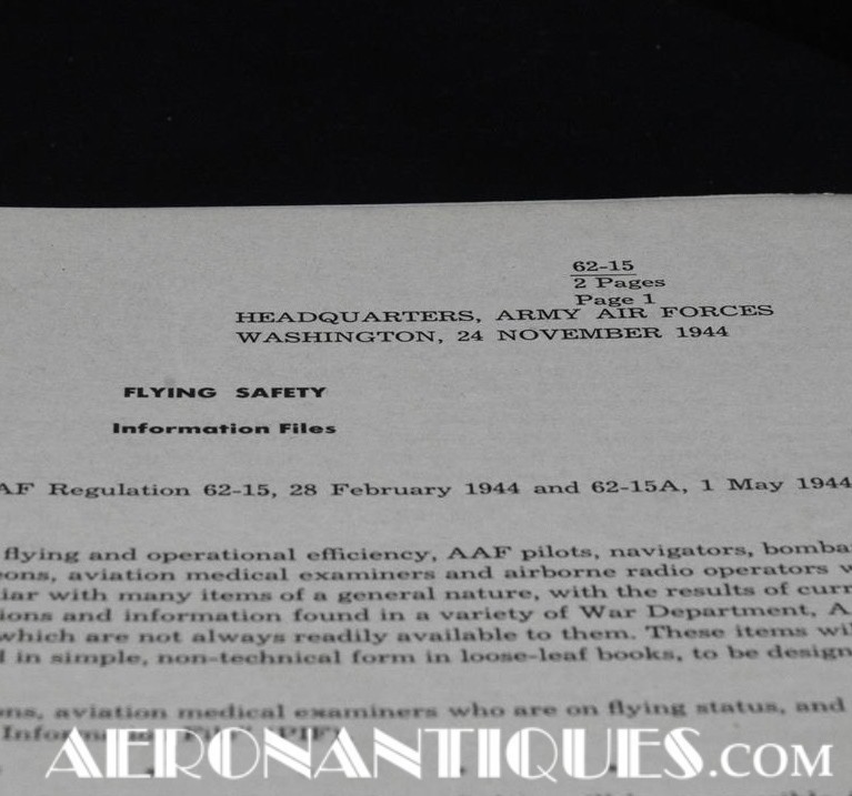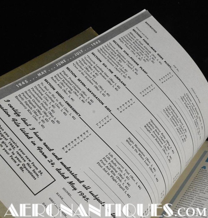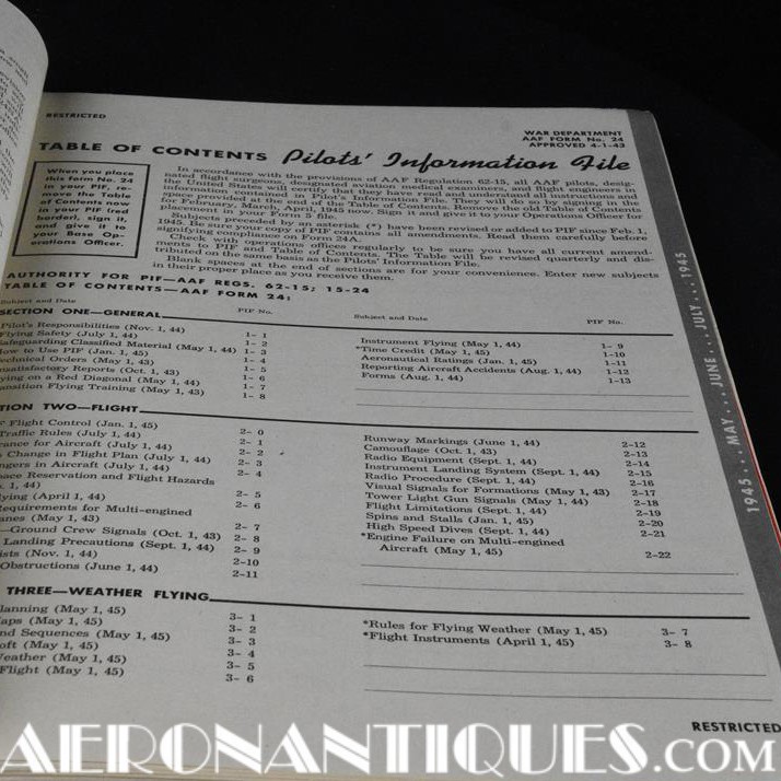 Édition originale de Novembre 1944 du manuel d'information pour les pilotes de l'US Army Air Force avec mises à jour jusqu'au mois de Mai 1945. Dimensions 21,5 cm X 28 cm X 2 cm. Plus de 250 pages traitant des différentes théories, techniques et équipements de vol de l'US Army Air Force avec de nombreuses illustrations en couleur. Très bon état. Parfait pour compléter une serviette de pilote ou simplement comme manuel de référence. Ce manuel sera mis à jour chaque mois à partir de 1944, du fait de l'évolution rapide des équipements à partir de cette année. Une source d'informations incontournables sur le sujet de l'USAAF.