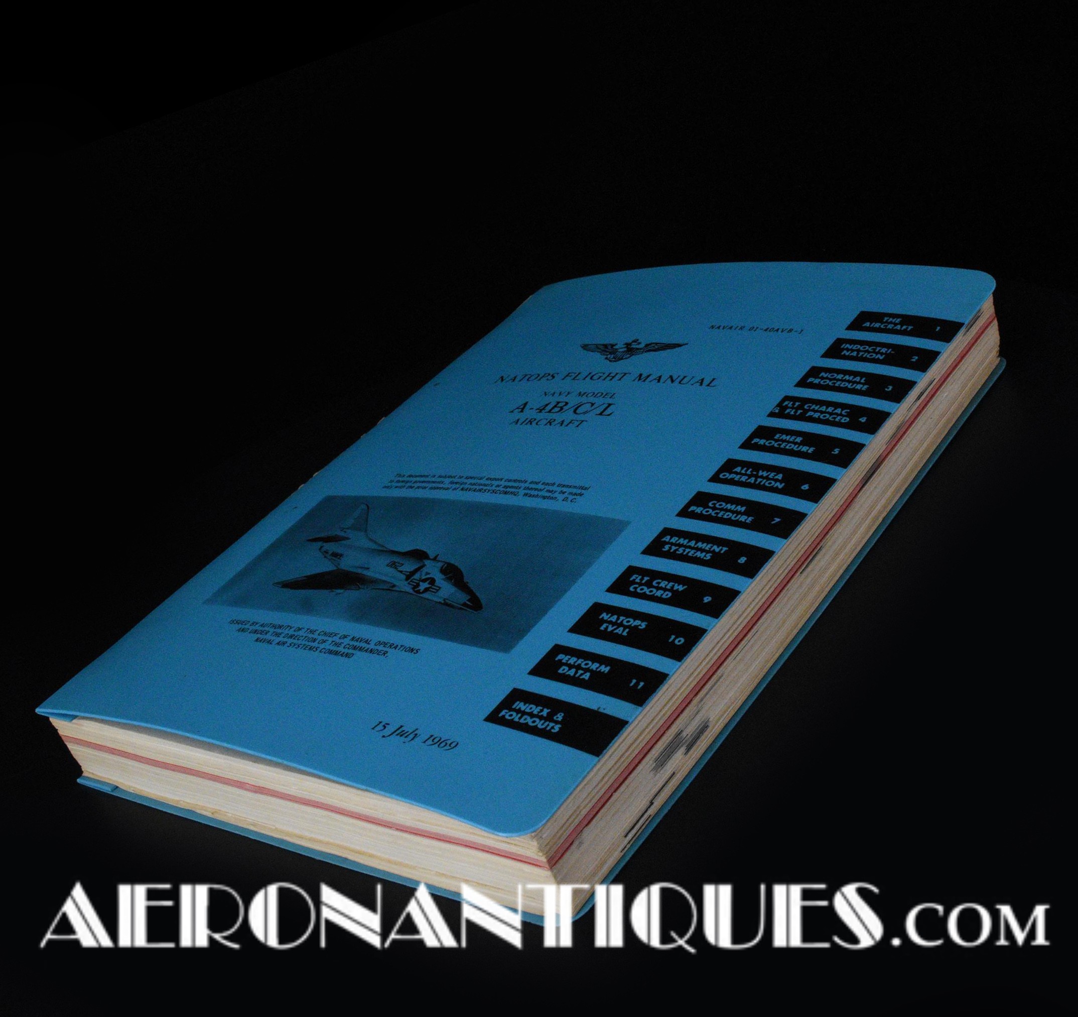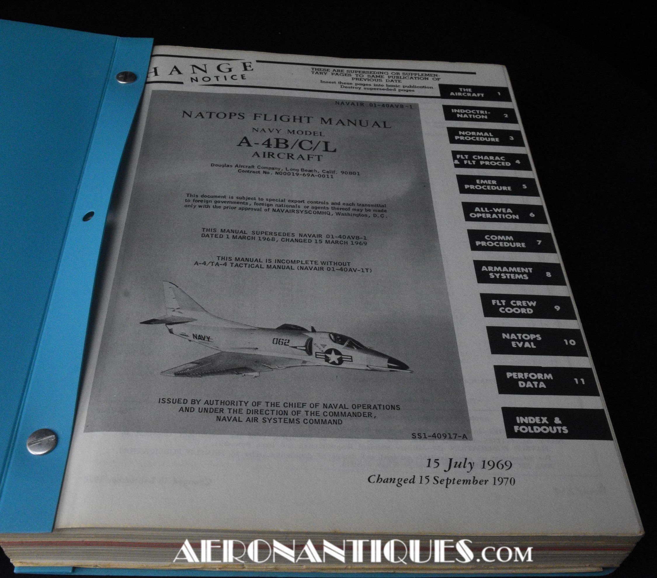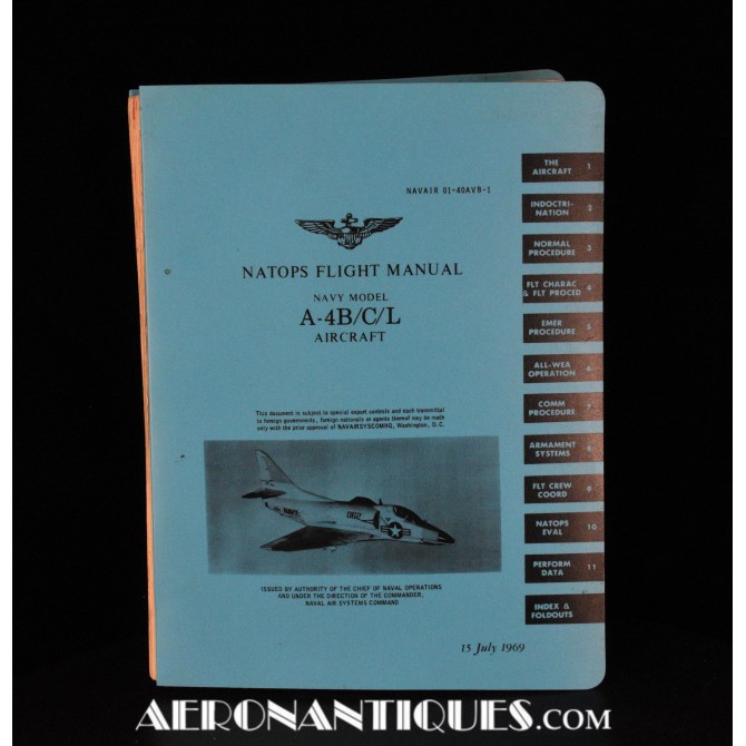 Manuel NATOPS de pilotage original pour pilotes de l'US Navy de l'appareil d'attaque McDonnel Douglas A-4 Skyhawk, version B/C & L. Environ 300 pages reliées avec couverture plastique. Nombreuses illustrations et planches dépliantes. Dimensions 28 cm X 21,5 cm et Datés 1969 et 1973. Une belle source d'informations incontournable sur cet appareil d'attaque mythique de l'US Navy.