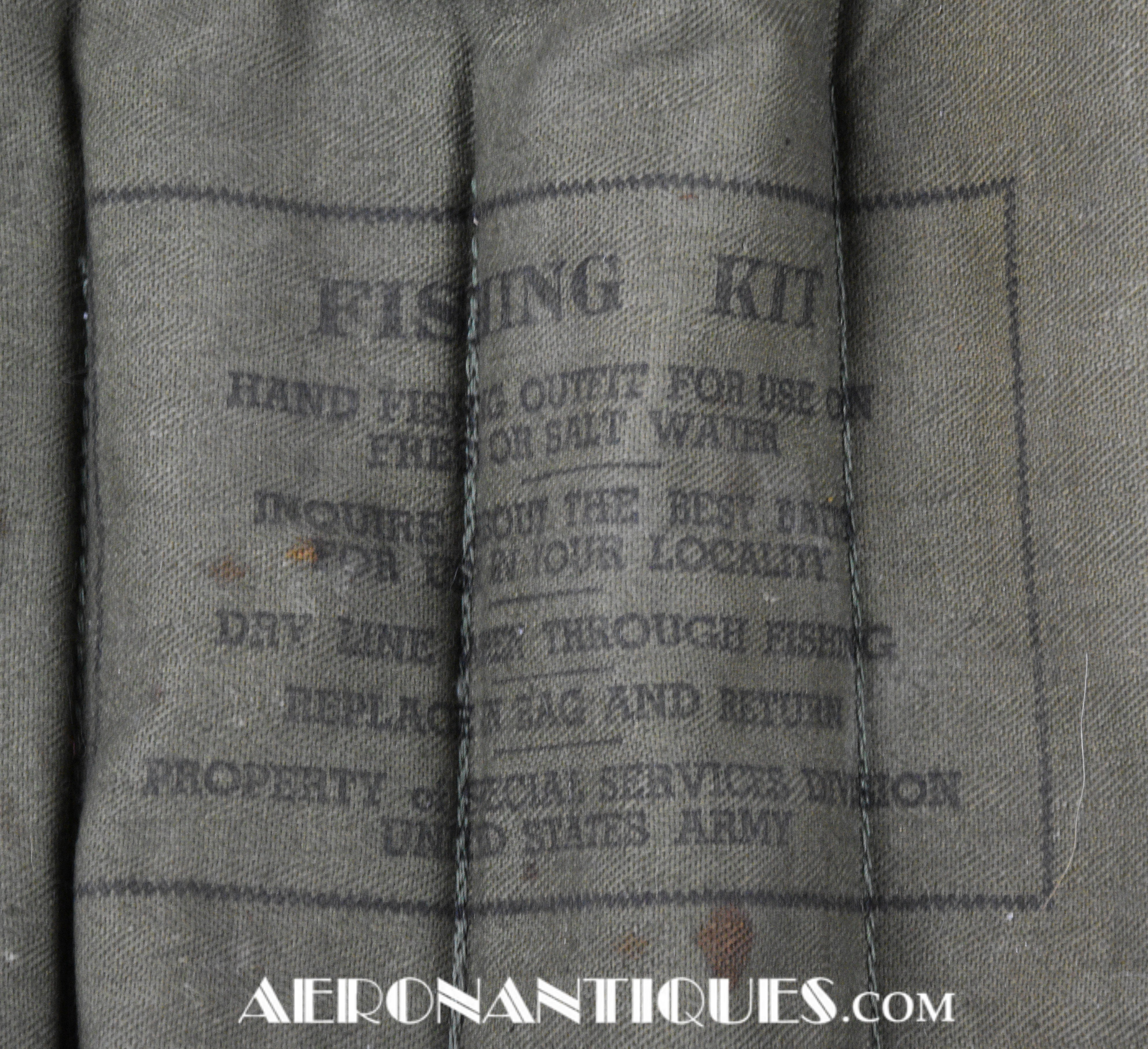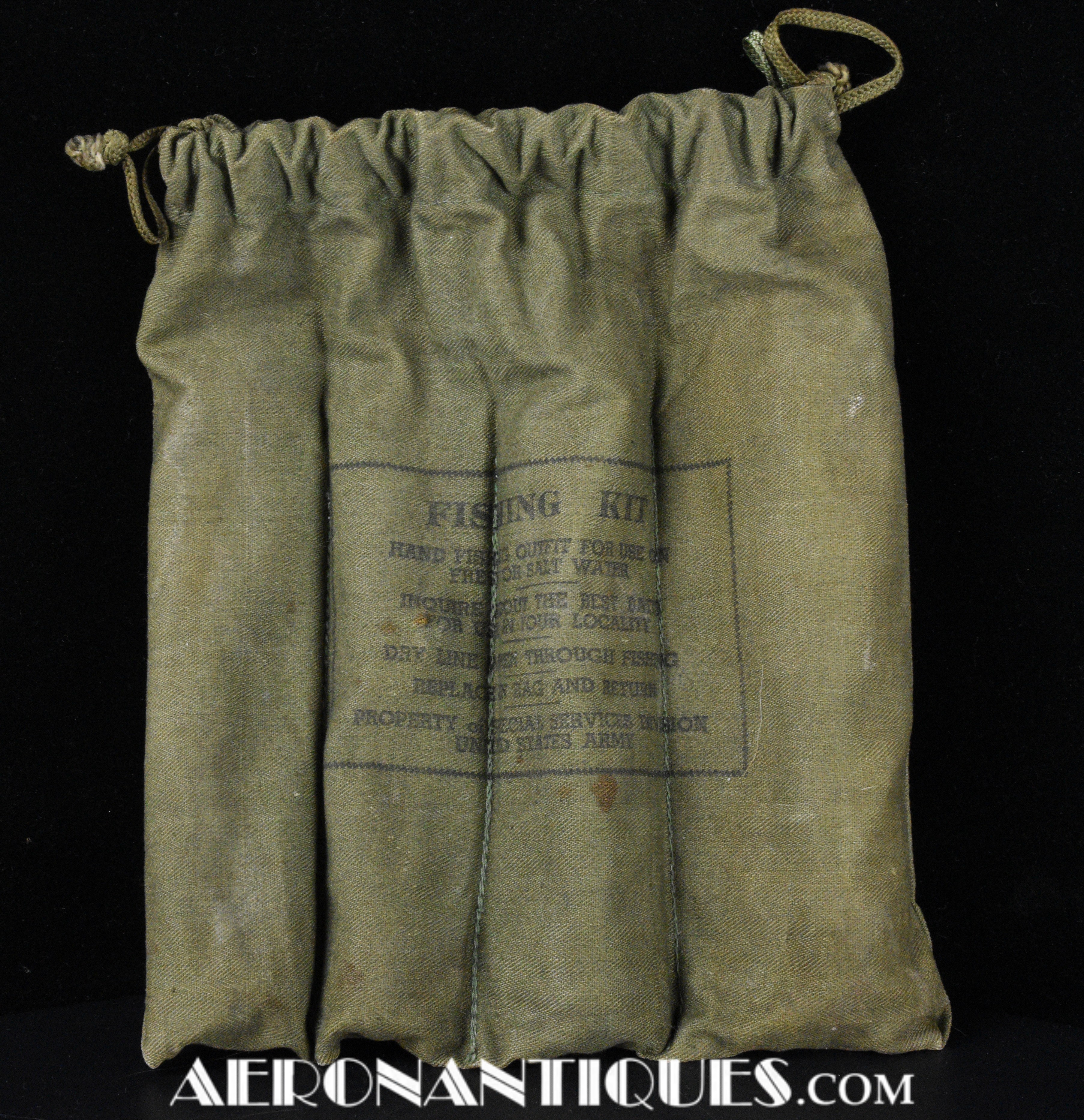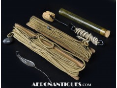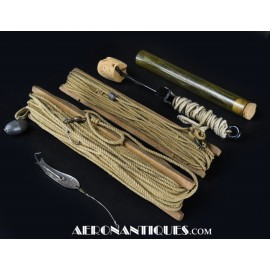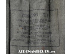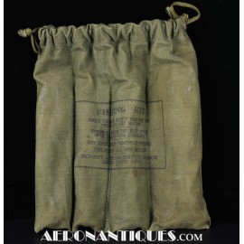 Kit de pêche de survie de l'armée américaine de la Seconde Guerre mondiale, dans son sac d'origine en toile OD#7. Ce kit comprend plusieurs lignes et hameçons. Distribué pendant l'année 1944 par les services spéciaux de l'armée américaine à des fins récréatives. Dimensions : 240 mm x 210 mm.