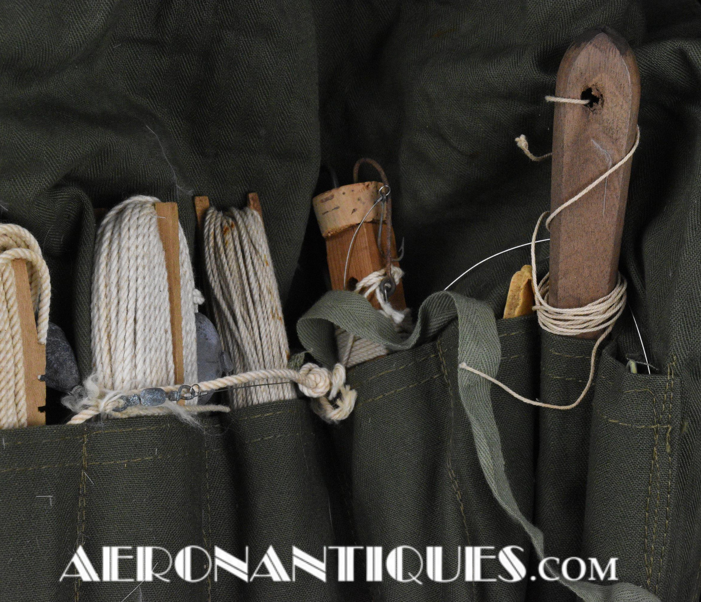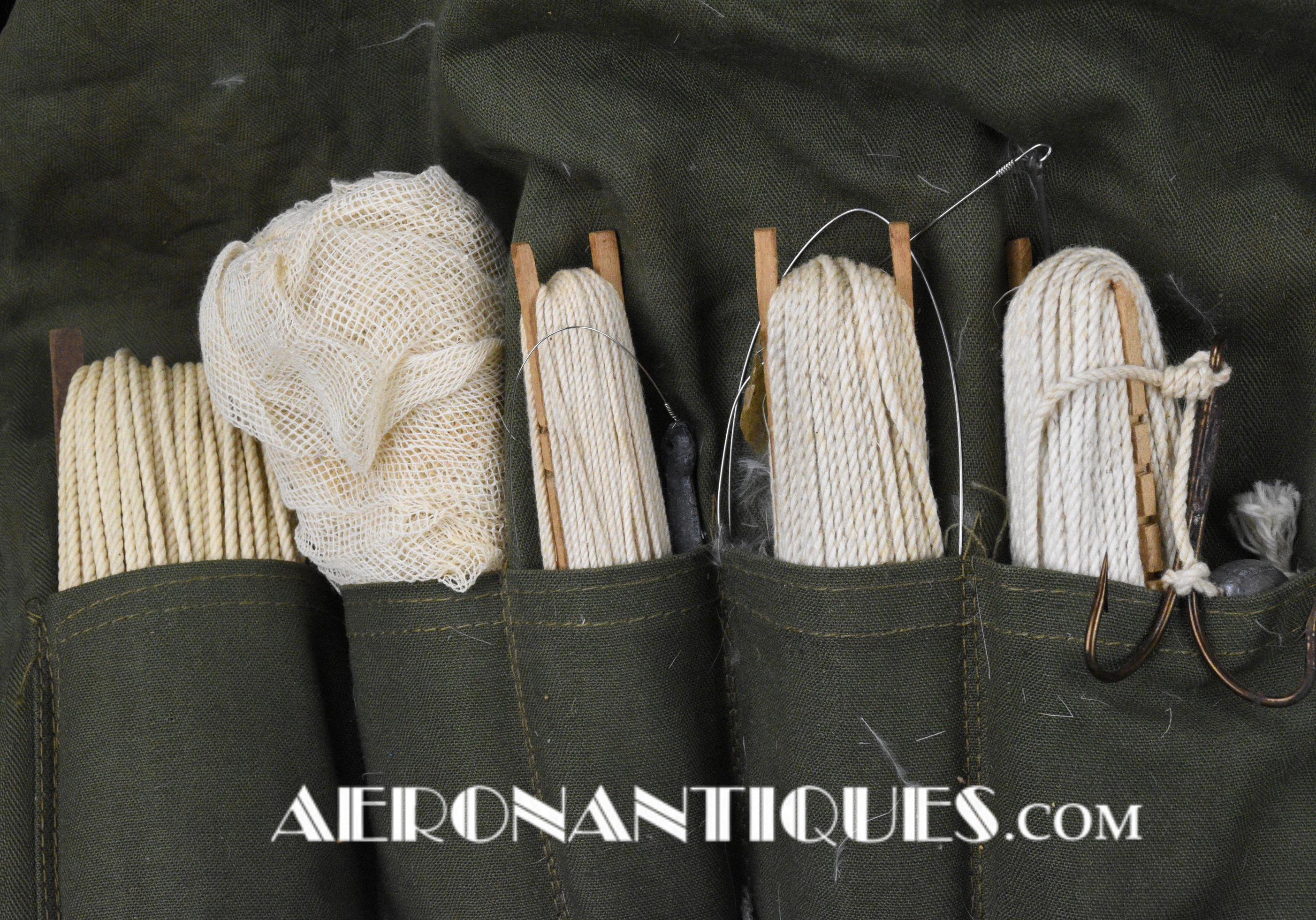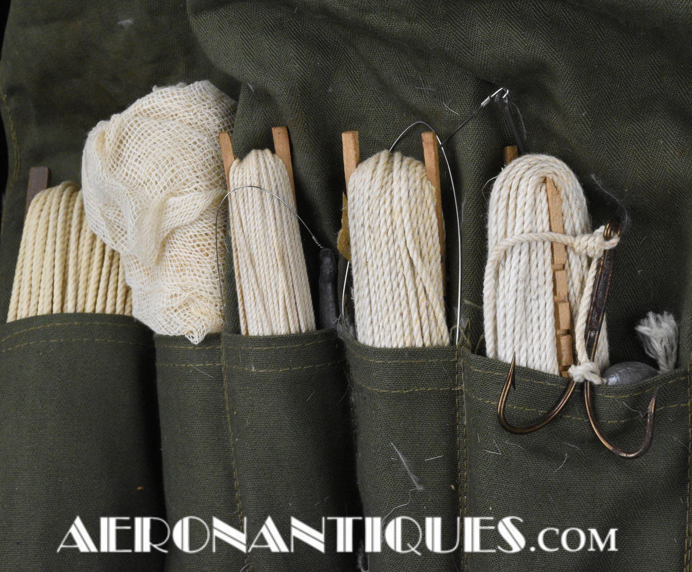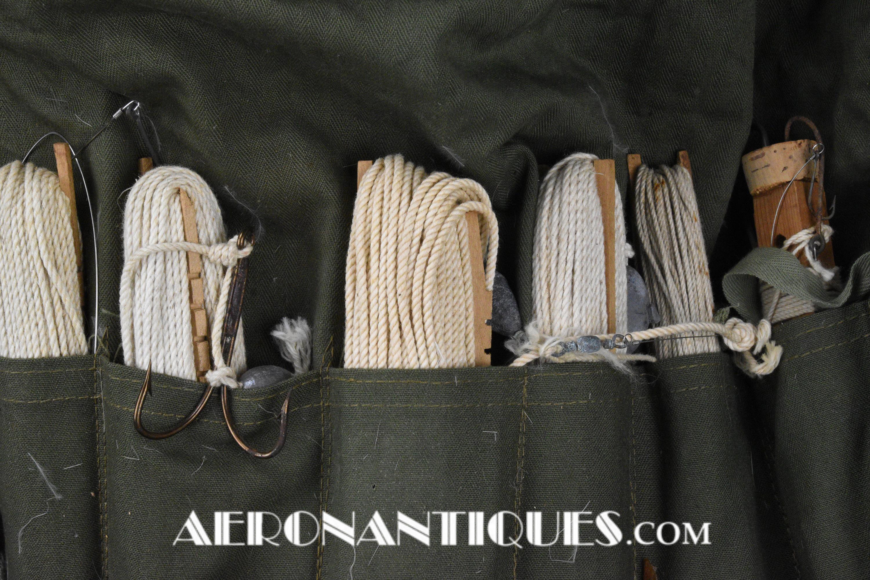 Kit de pêche de survie US Navy ou US Army Air Force. Type tablier. Fabrication US WWII. Excellent état avec tous ses accessoires et pochette de transport en toile de coton HBT #OD7.