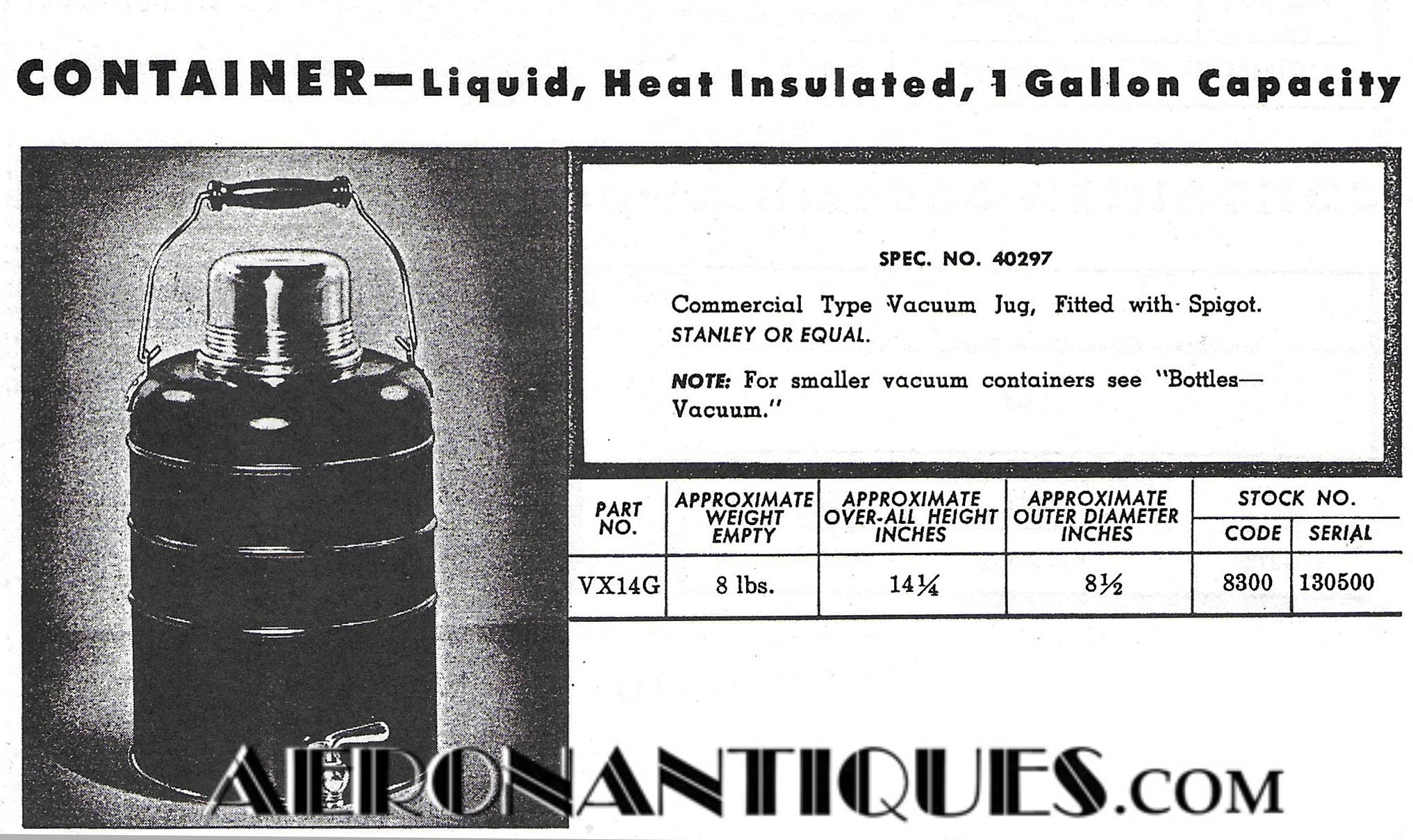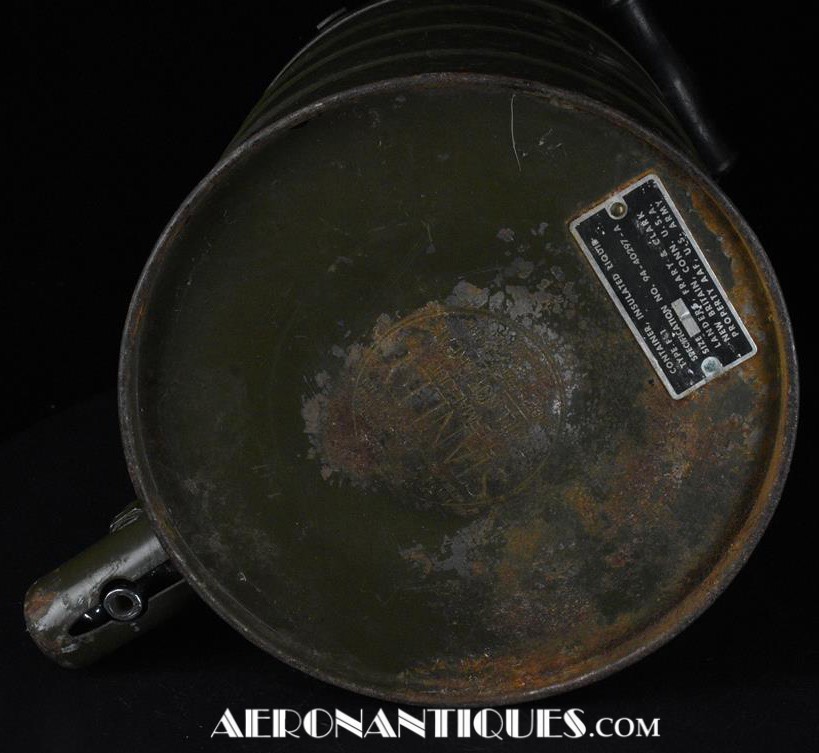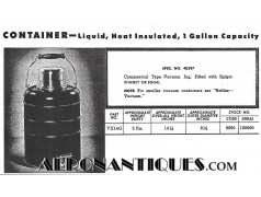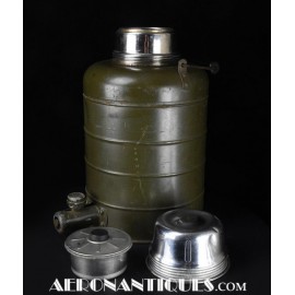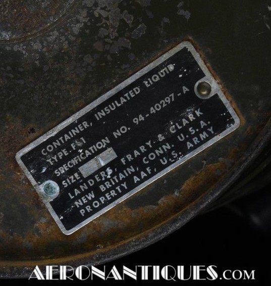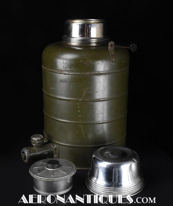 Grande bouteille thermos réglementaire US Army Air Force type F-1 pour équipages de bombardiers, fabrication Américaine WWII par LANDERS FRARY & CLARK avec plaque signalétique correspondante. Contenance 1 gallon. Complète avec poignée de transport, robinet, bouchon thermique et coupelle pouvant faire office de tasse. Hauteur 37 cm. Diamètre 20 cm. Très bon état d'origine.