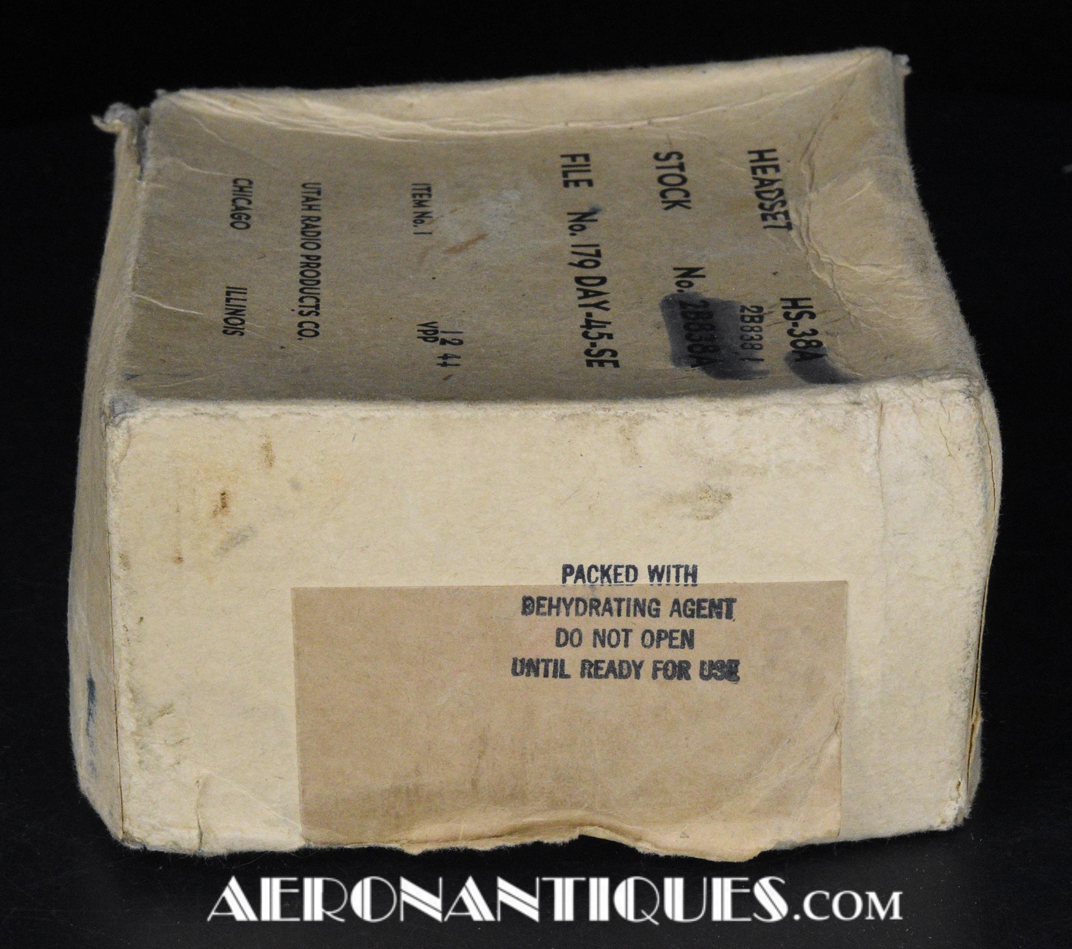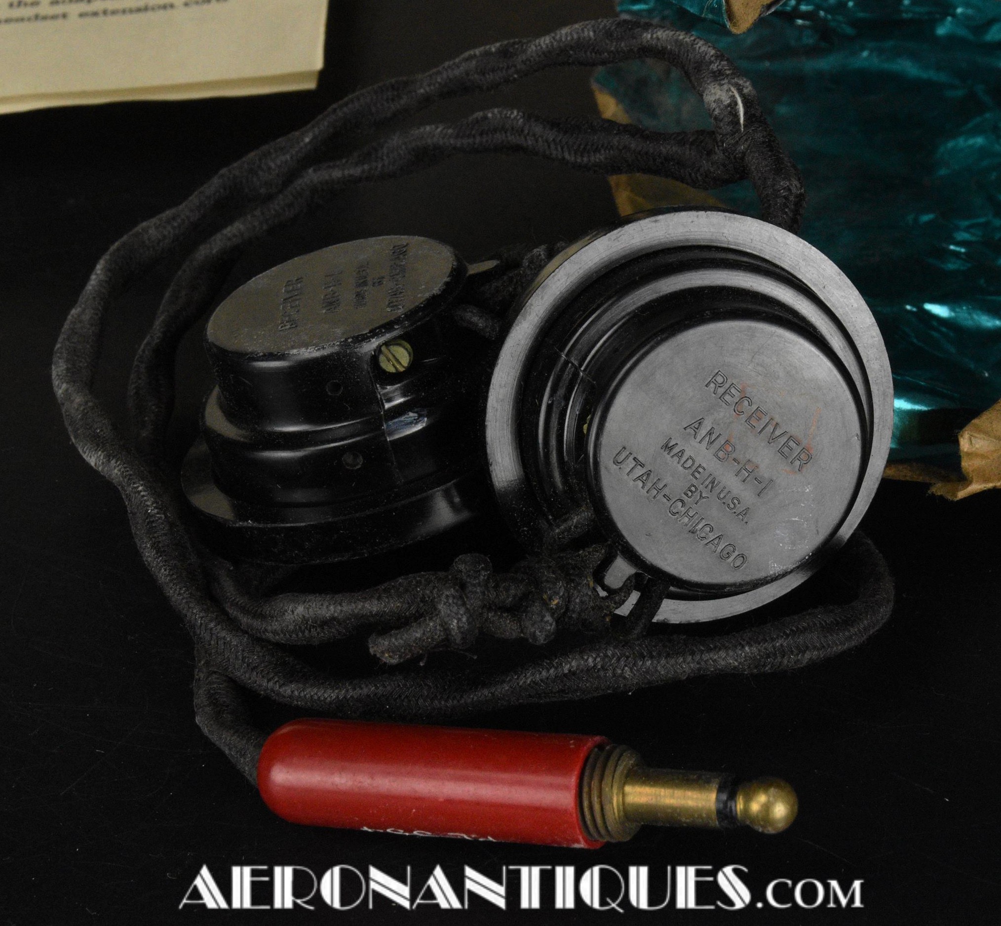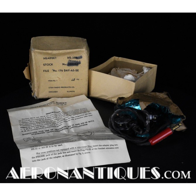 Ensemble écouteurs ANB-H-1, cordon et fiche PL-356 type HS-38 pour équiper les bonnets de vol de l'US Army Air Force type A-11, ANH-15, etc. Dans leur boîte d'origine avec notice de montage et utilisation. Fabrication UTAH RADIO PRODUCTS datée 12/44. Serre-tête, lunettes et masque à oxygène ne sont pas inclus.