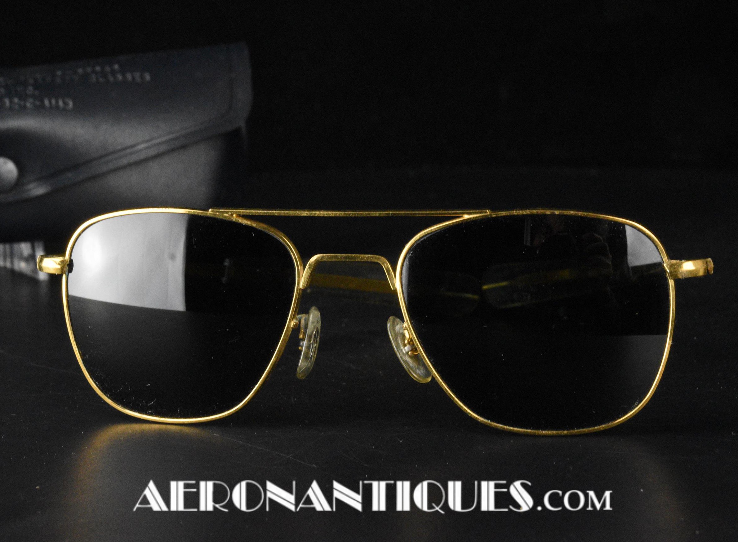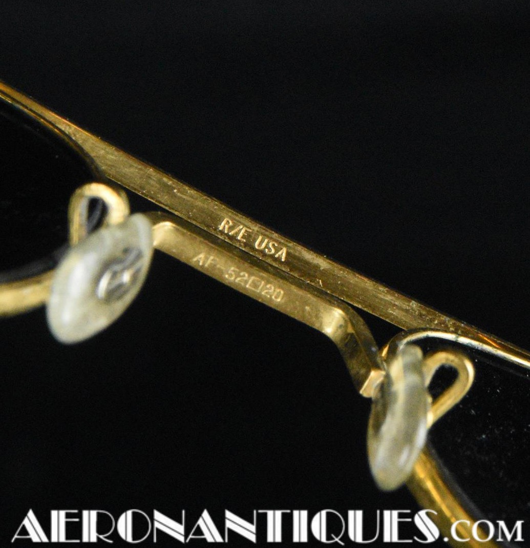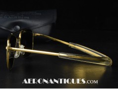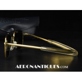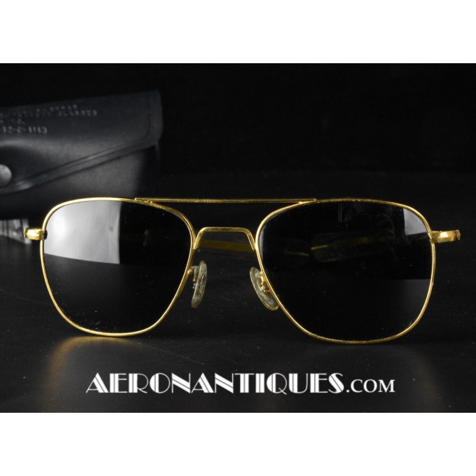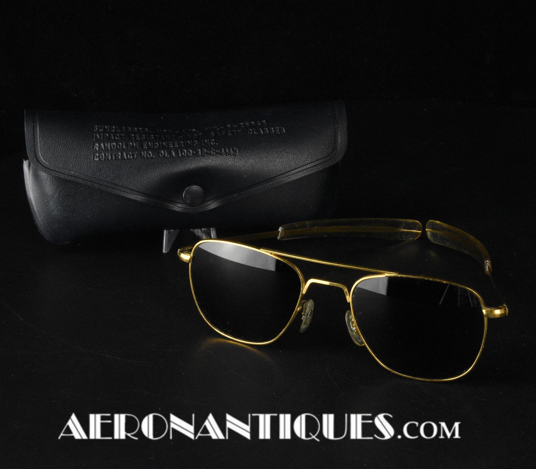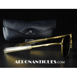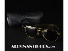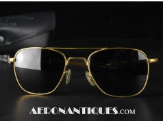 Lunettes de pilote réglementaires US Air Force ou Navy modèle HGU-4/P fabrication RANDOLPH ENGINEERING, complètes avec étui d'origine. Excellent état. Modèle 5 1/2 plaquage or par galvanoplastie. Étui daté 1992. Lunettes mythiques des pilotes depuis la Guerre du Vietnam jusqu'à Top Gun.