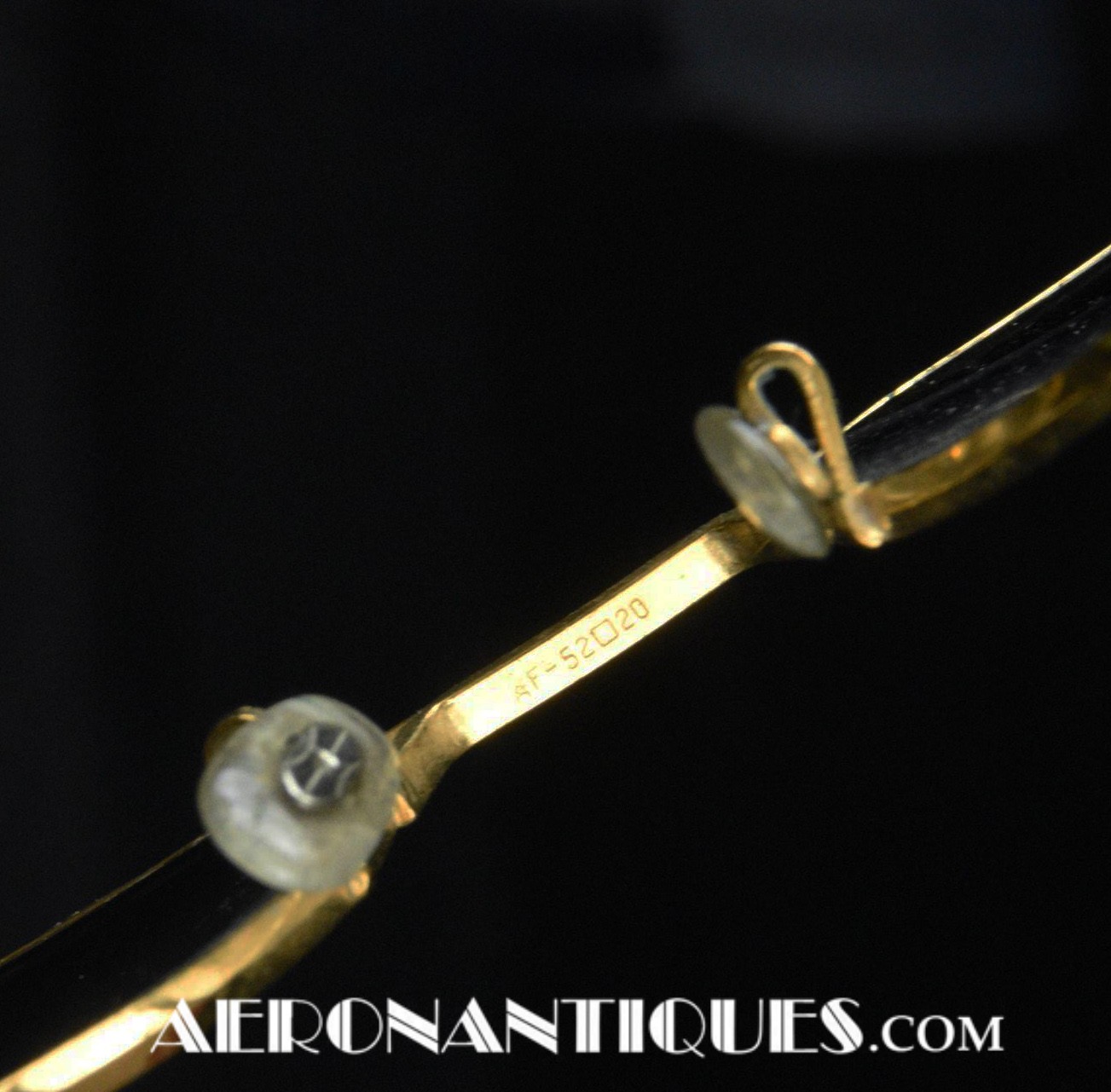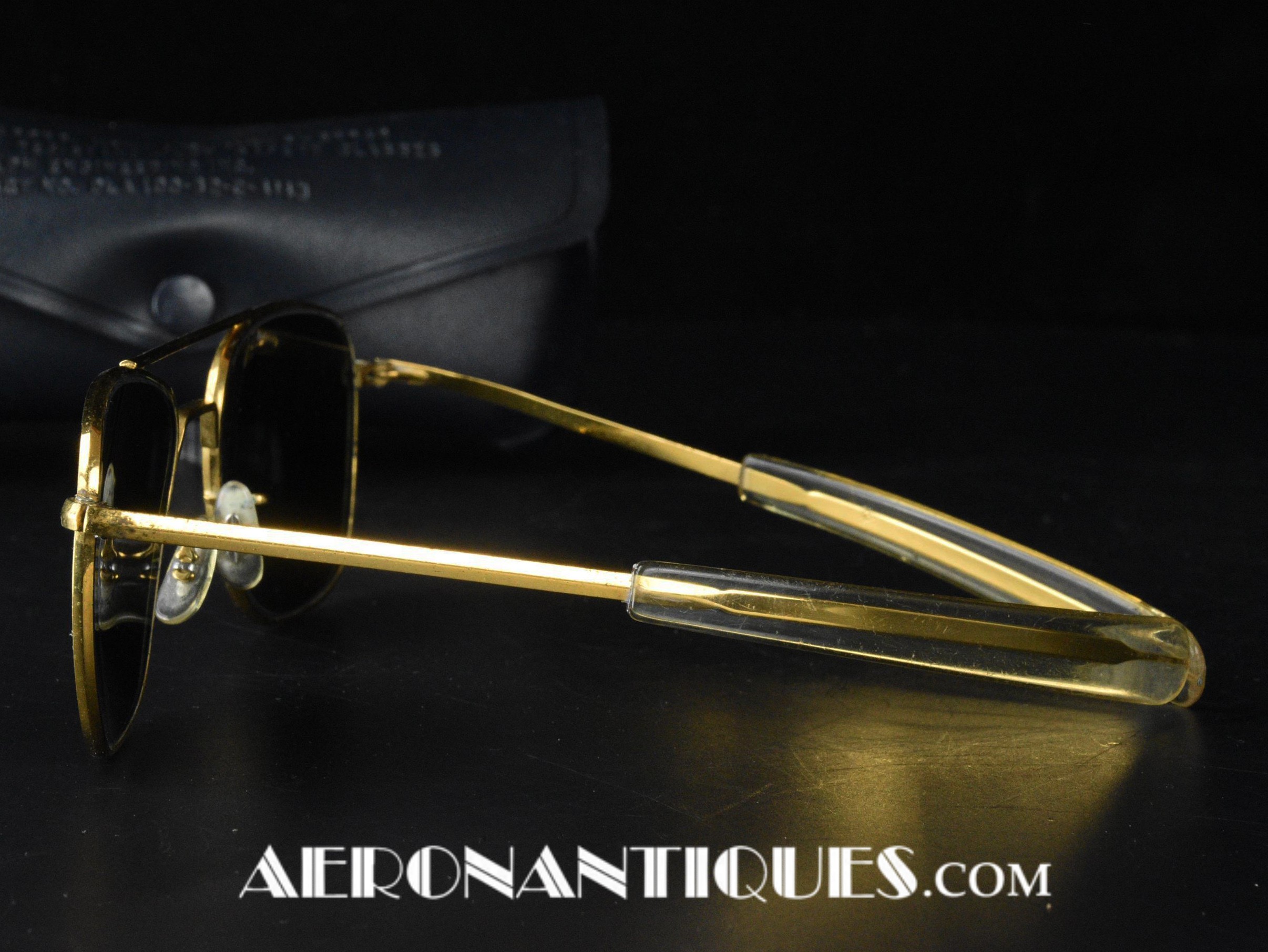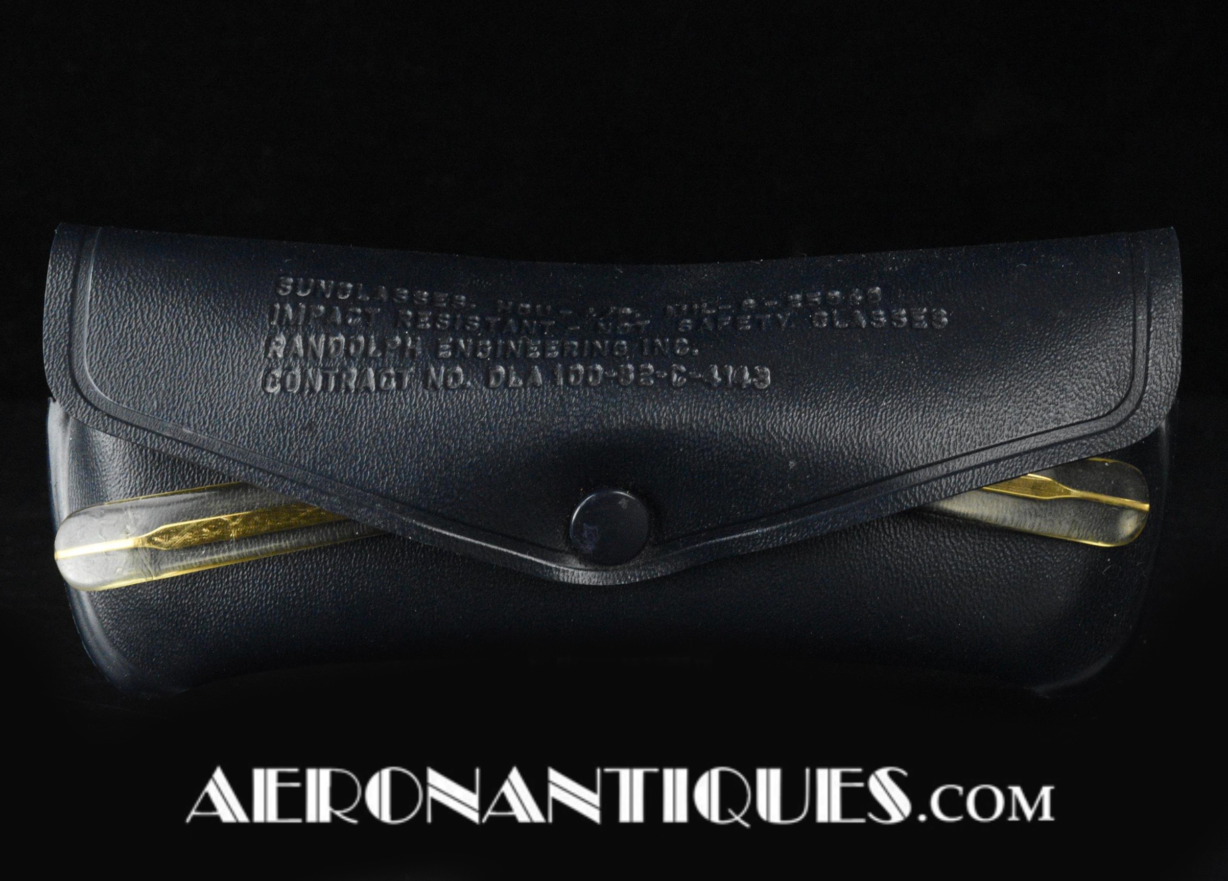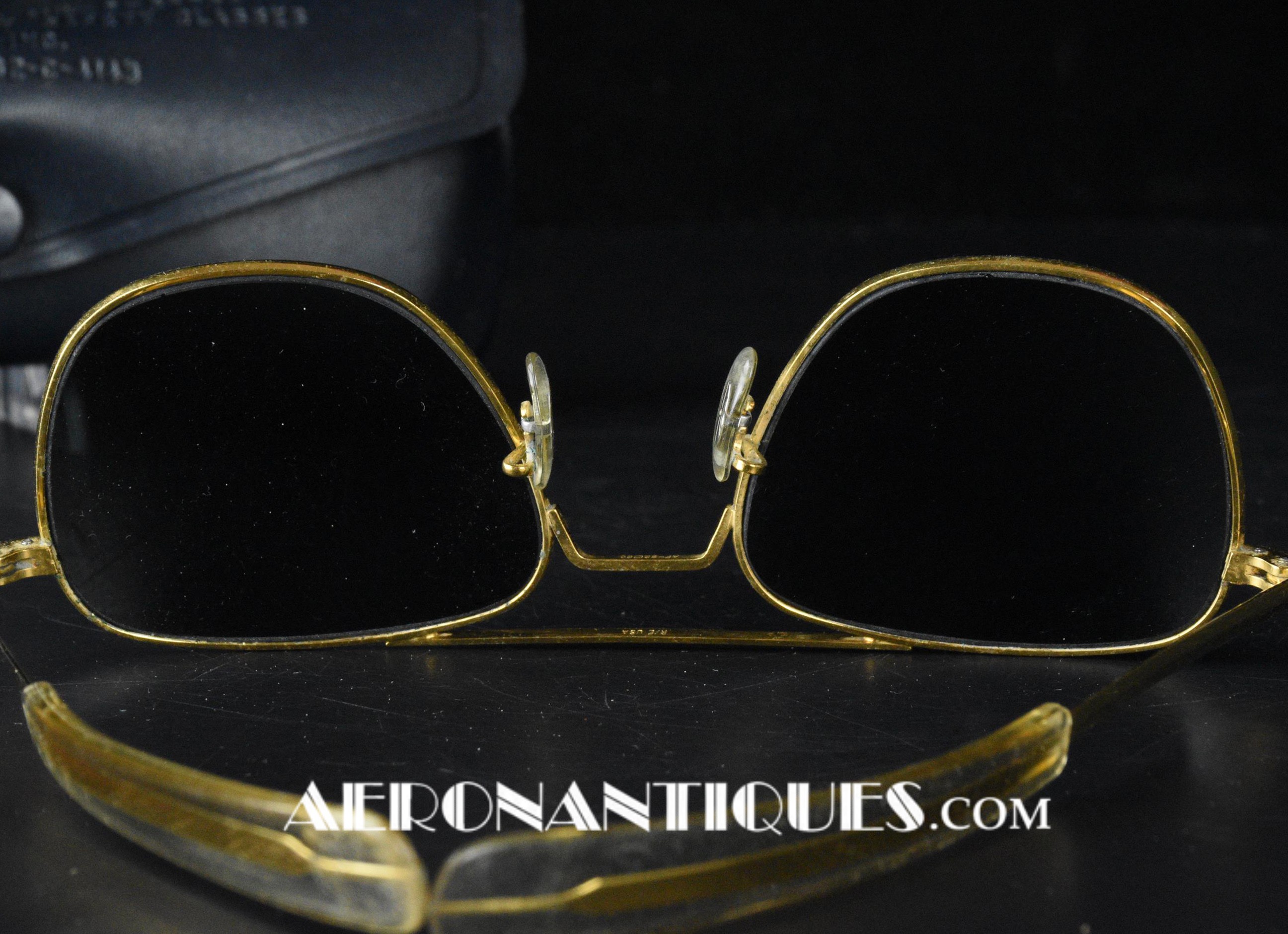 Lunettes de pilote réglementaires US Air Force ou Navy modèle HGU-4/P fabrication RANDOLPH ENGINEERING, complètes avec étui d'origine. Excellent état. Modèle 5 1/2 plaquage or par galvanoplastie. Étui daté 1992. Lunettes mythiques des pilotes depuis la Guerre du Vietnam jusqu'à Top Gun.