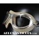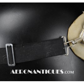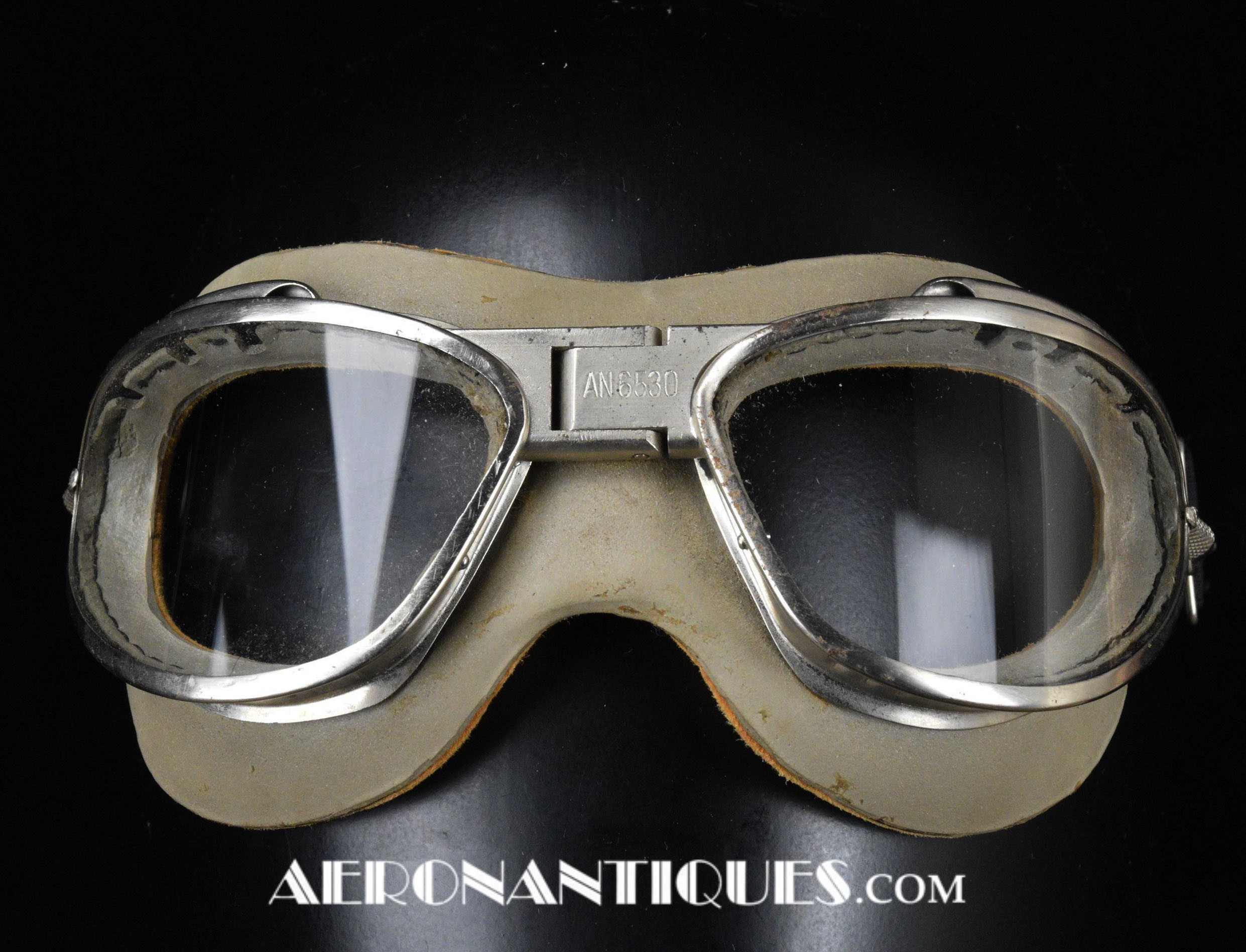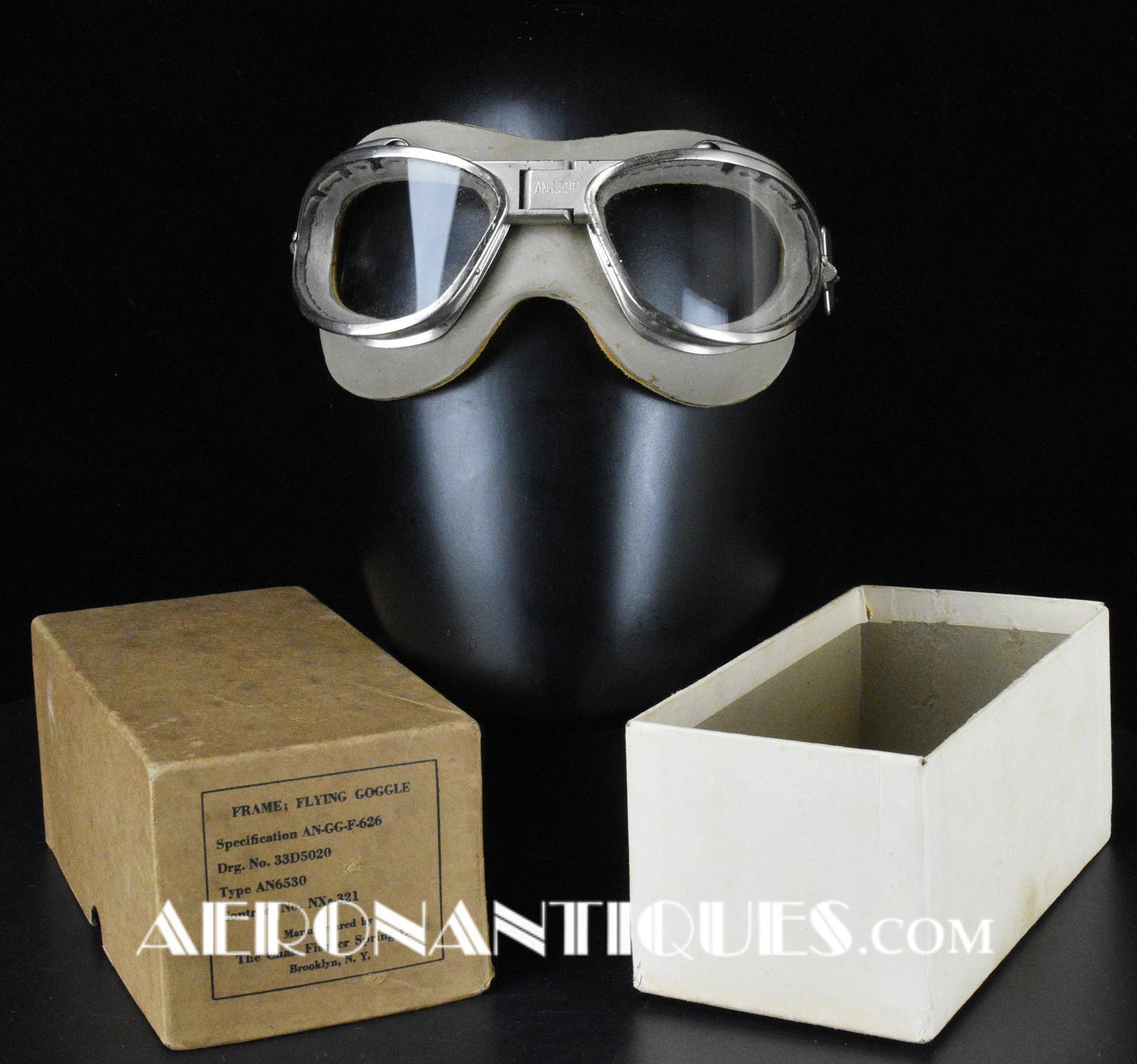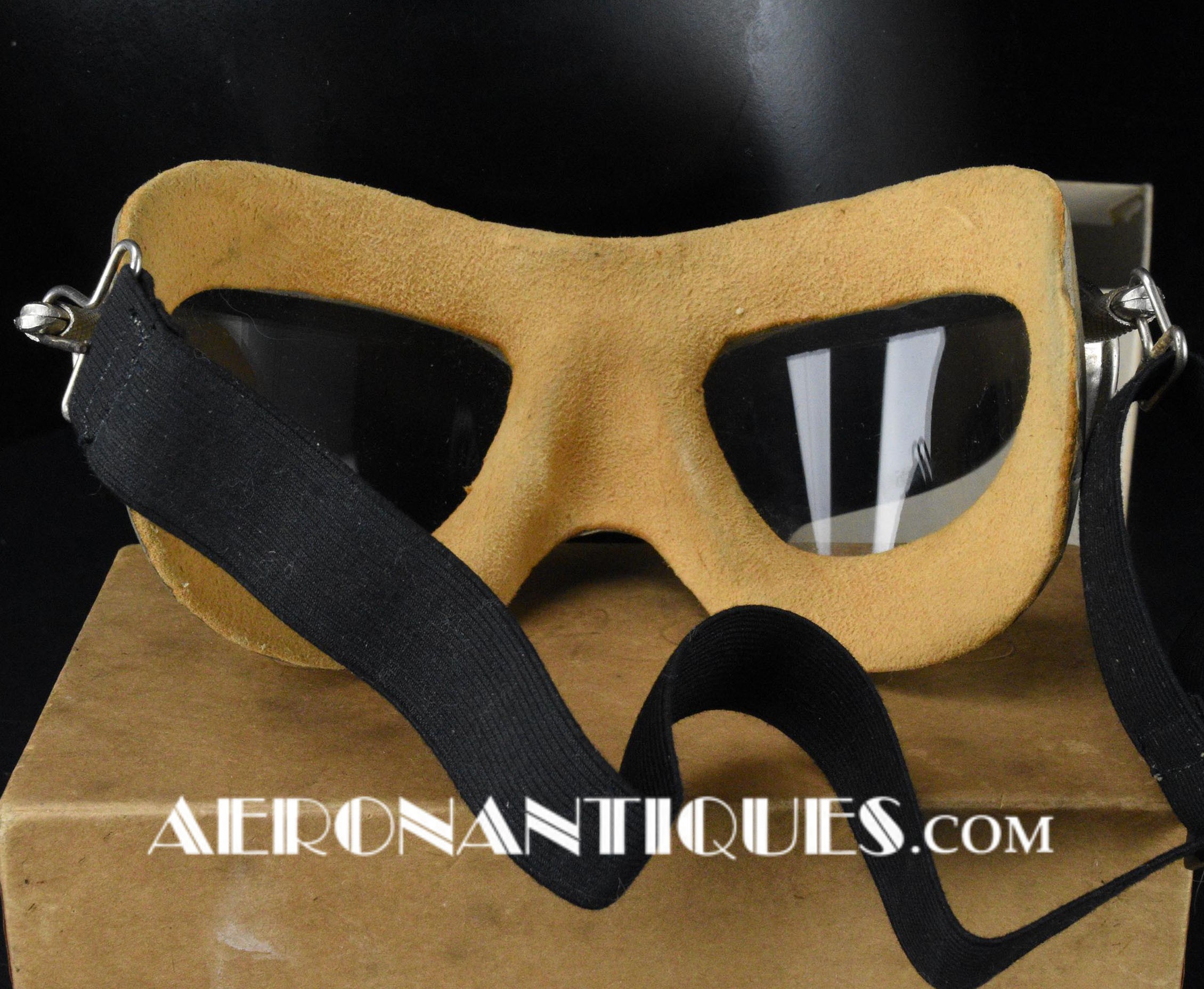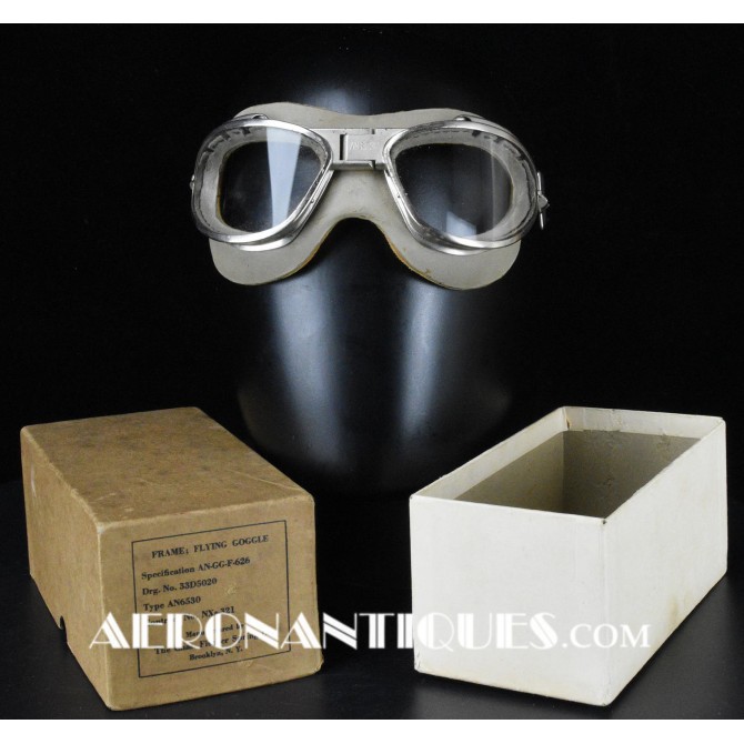 Lunettes de pilote réglementaires US Army Air Force et Navy WWII type AN-6530, deuxième modèle, fabrication CHAS. FISCHER SPRING CO., complètes avec boîte d'origine correspondante, bande élastique réglable et verres minéraux transparents. Masque caoutchouc doublé chamois en une pièce. Rare dans cet état exceptionnel.