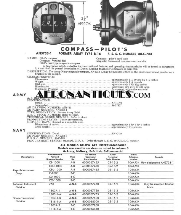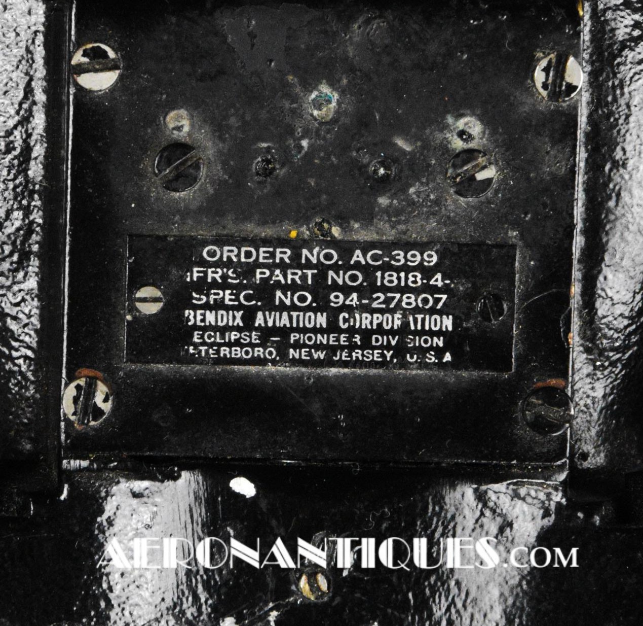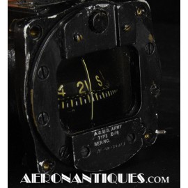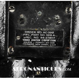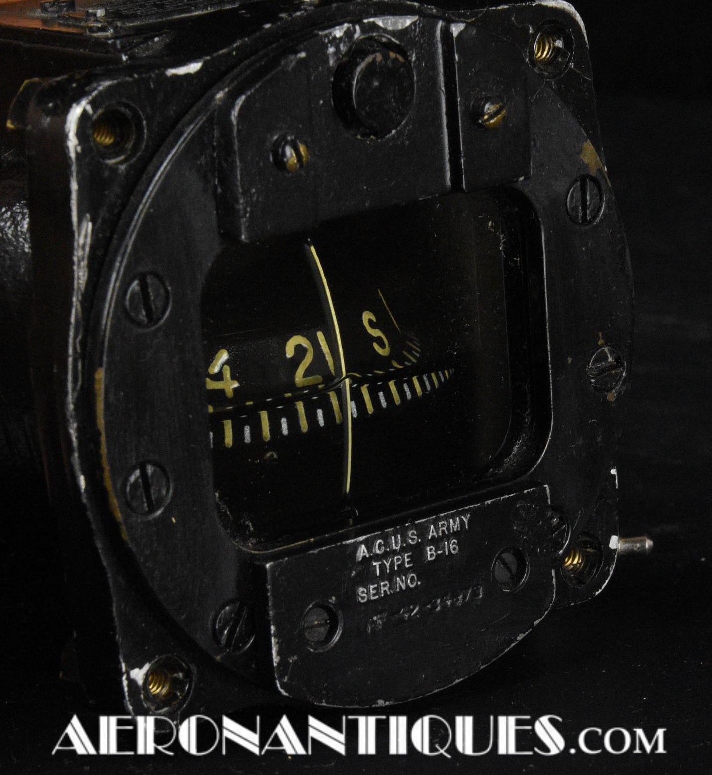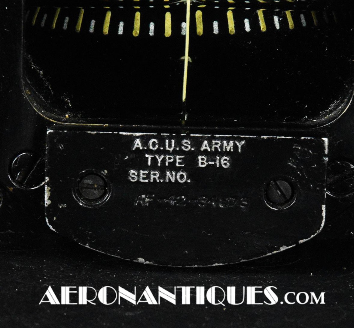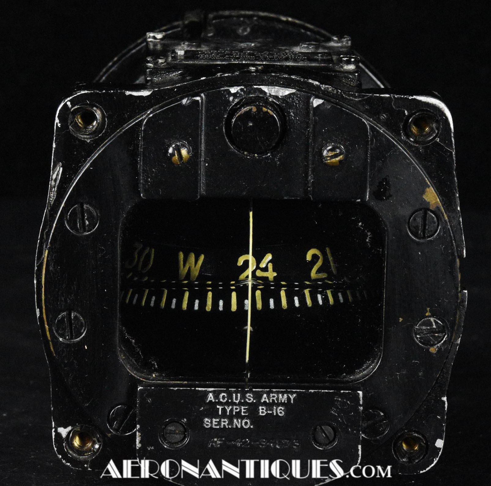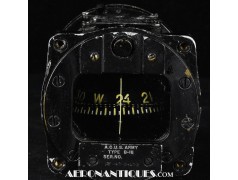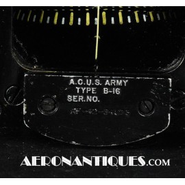 Boussole magnétique Type B-16. Datée 1942, fabrication Bendix Aviation. Ce type de boussole a équipé la majorité des appareils de l'US Army Air Force durant la Seconde Guerre Mondiale, du chasseur P-51 Mustang au Bombardier B-17 Superfortress. Diamètre 80 mm Profondeur 95 mm.