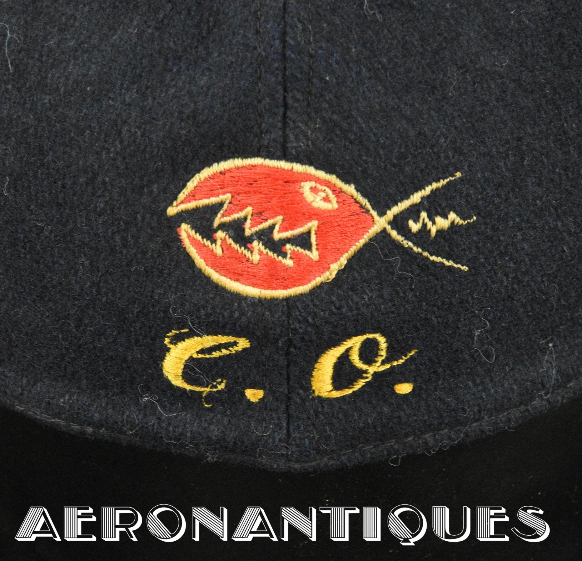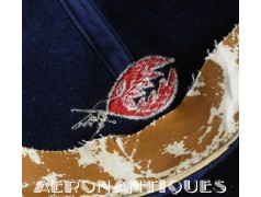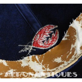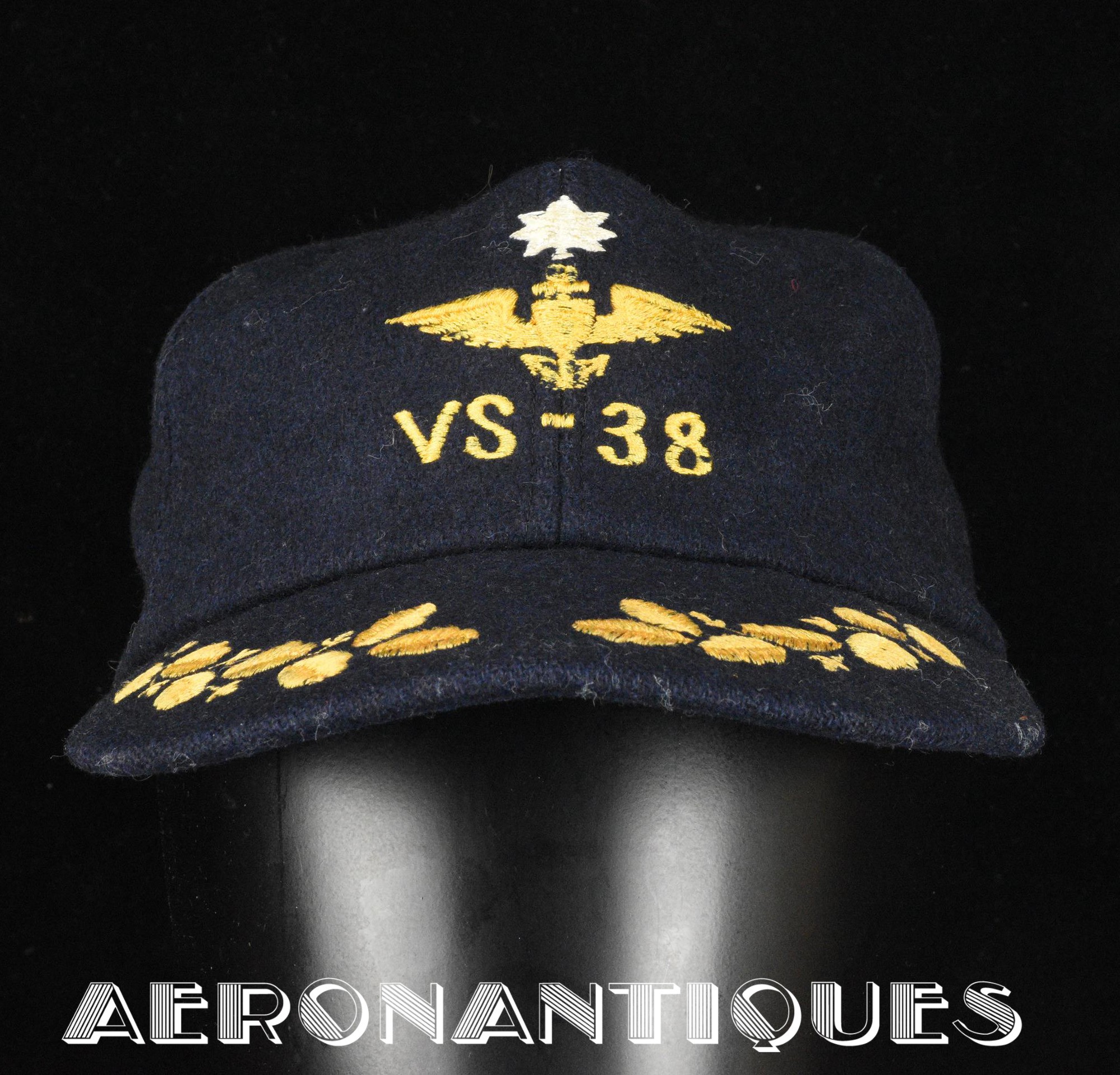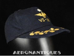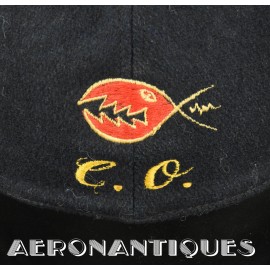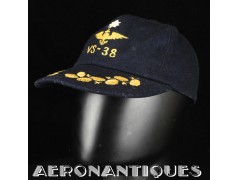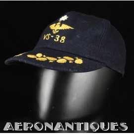 Exceptionnelle casquette de baseball du Commanding Officer du Sea Control Squadron 38 "Red Griffins" lors d'un de leurs déploiements durant la Guerre du Vietnam à bord du USS Bennington en 1968. On l'aperçoit sur une photo de groupe prise à bord du porte-avions portant cette même casquette. Fabrication Japonaise en laine bleu marine brodée. Très belle patine.