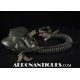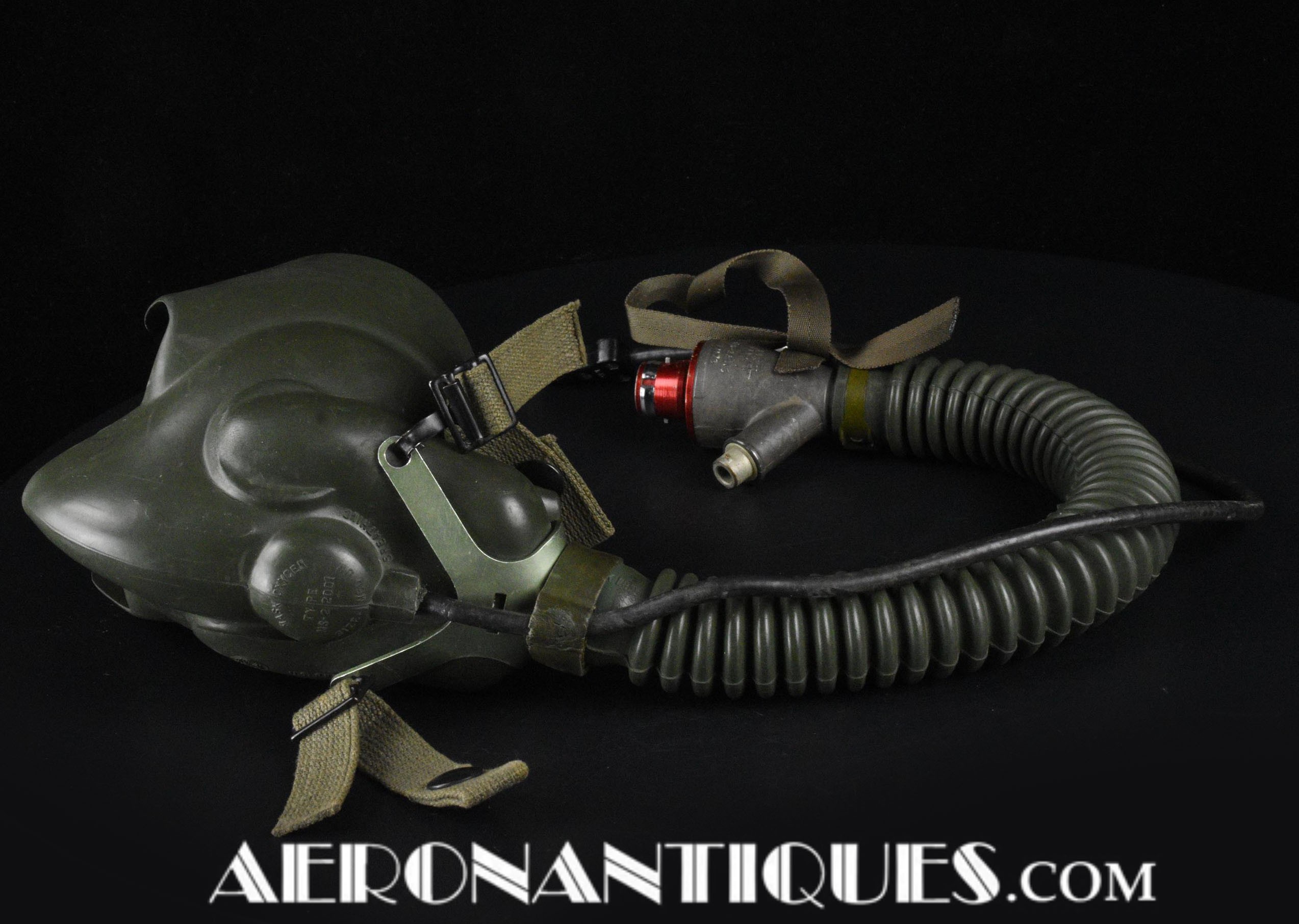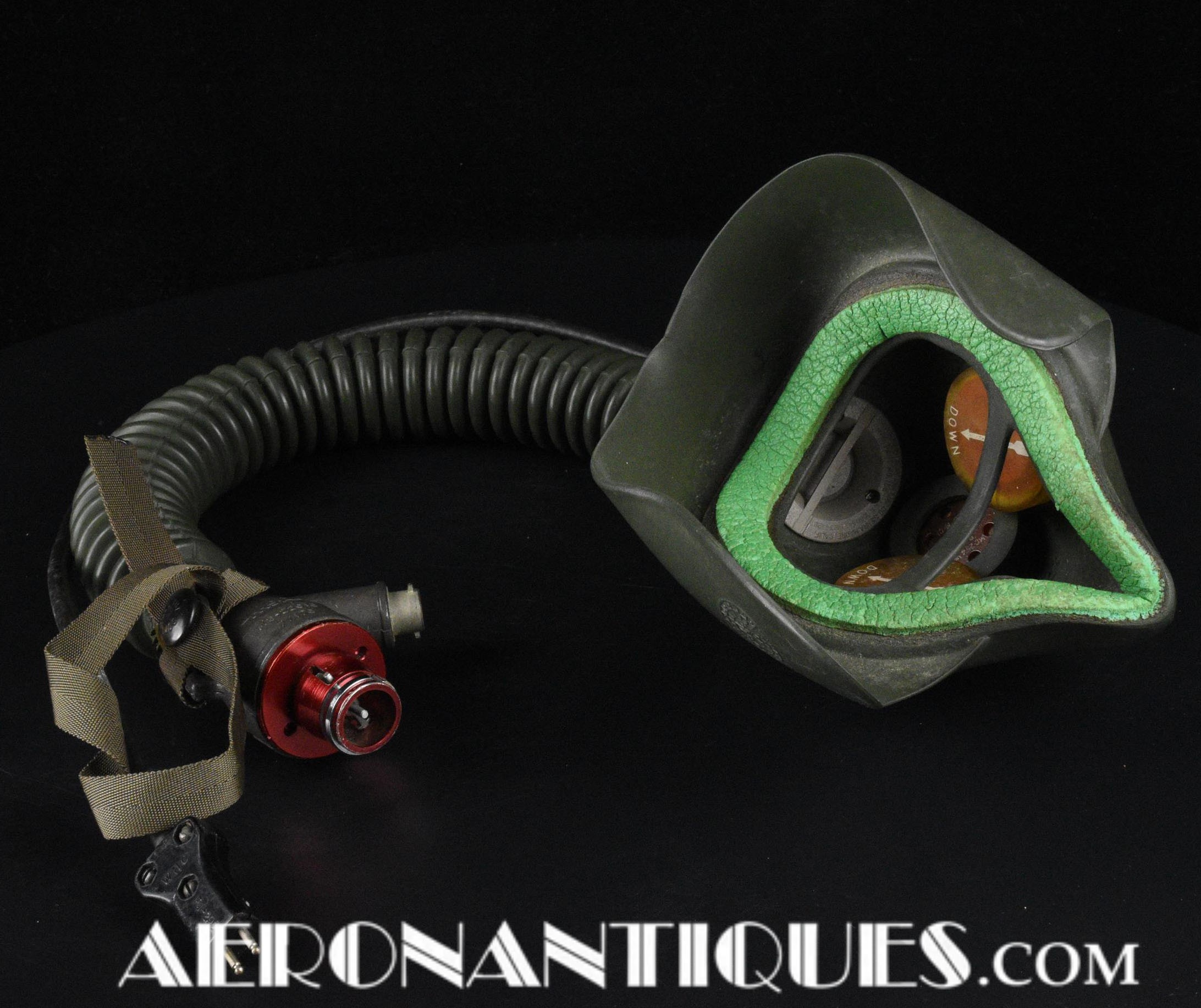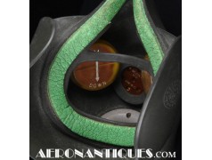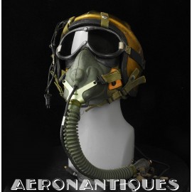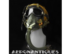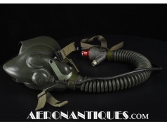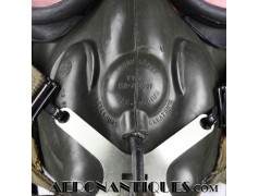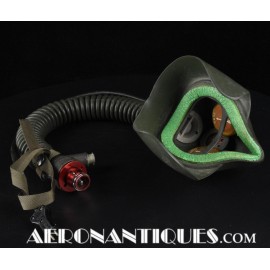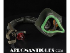 Masque à oxygène US Navy modèle MS-22001/A-13A, fabrication MSA (Mine safety Appliances) taille MEDIUM, daté 1956, complet avec microphone et connecteur MC-3. Support d'attache en "Y". Conviendrait parfaitement à un pilote de F-9 Cougar, Panther ou F-2 Banshee ou pour compléter un casque de la série H ou les premier APH-5. Pièce difficile à trouver équipée de son microphone d'origine.