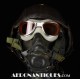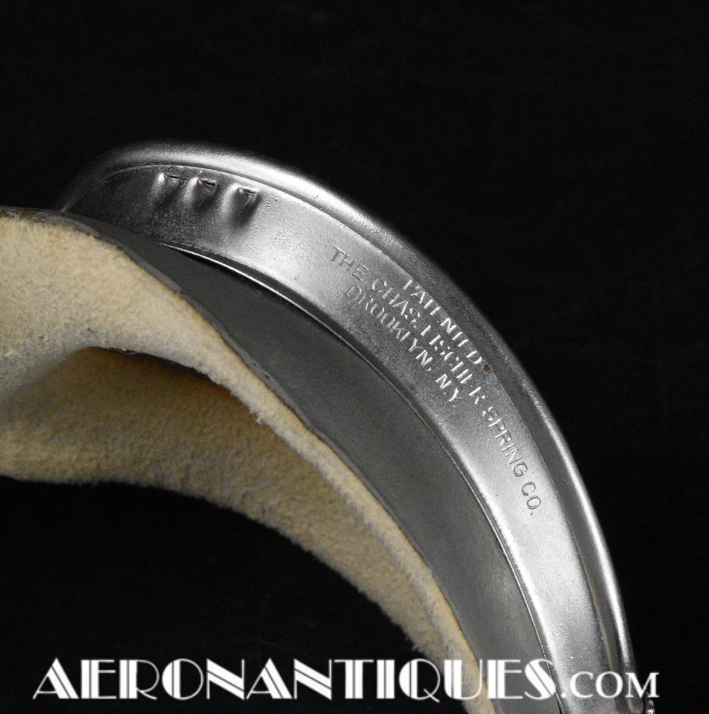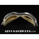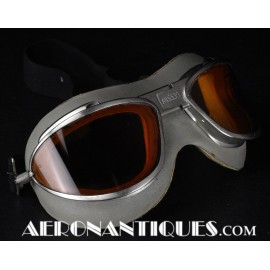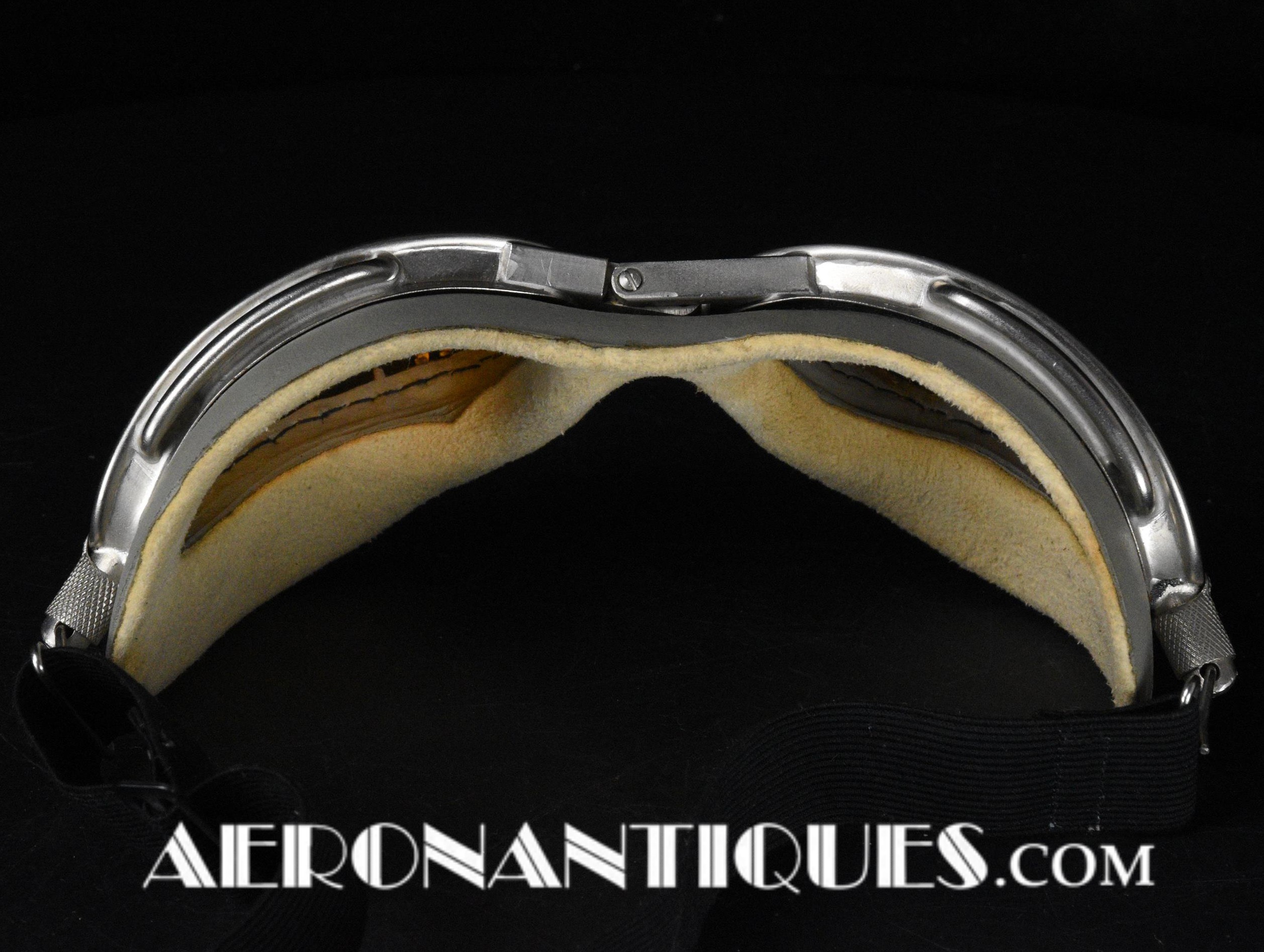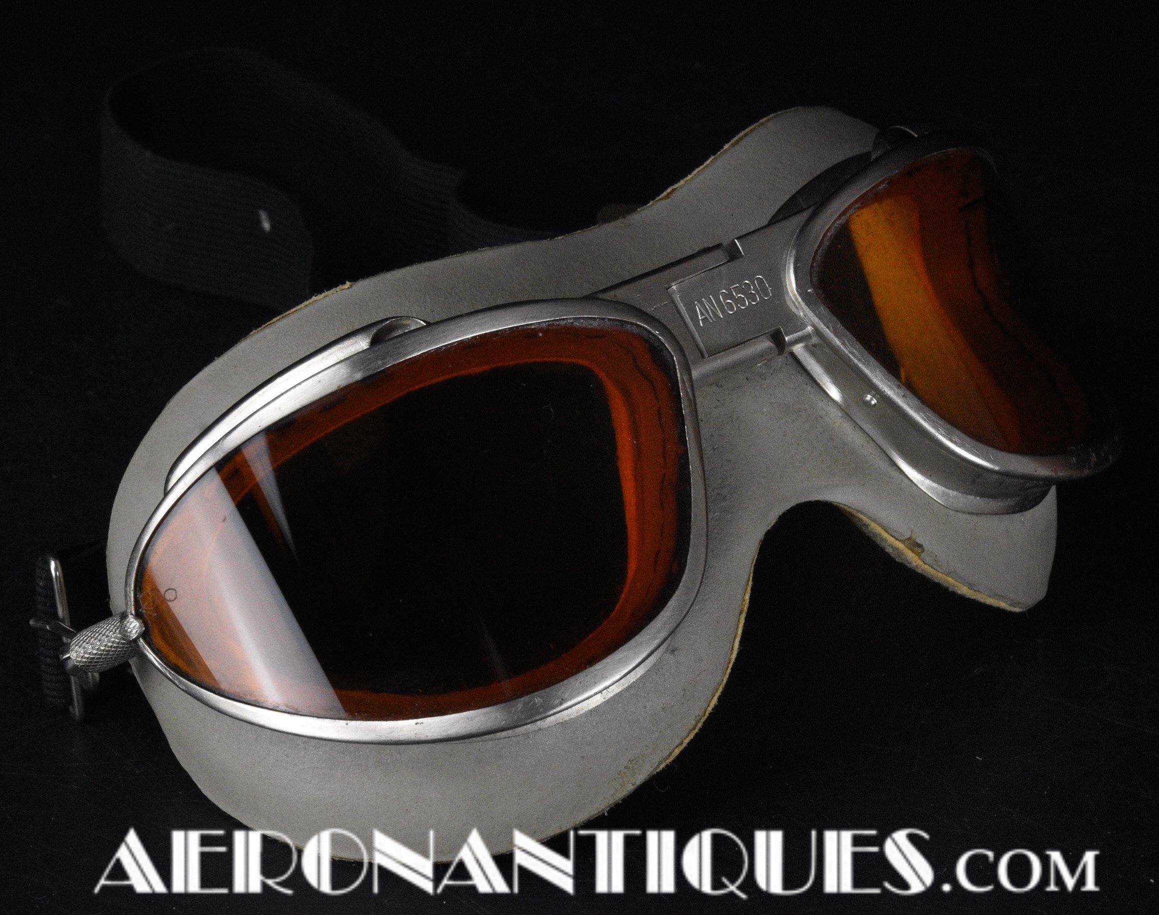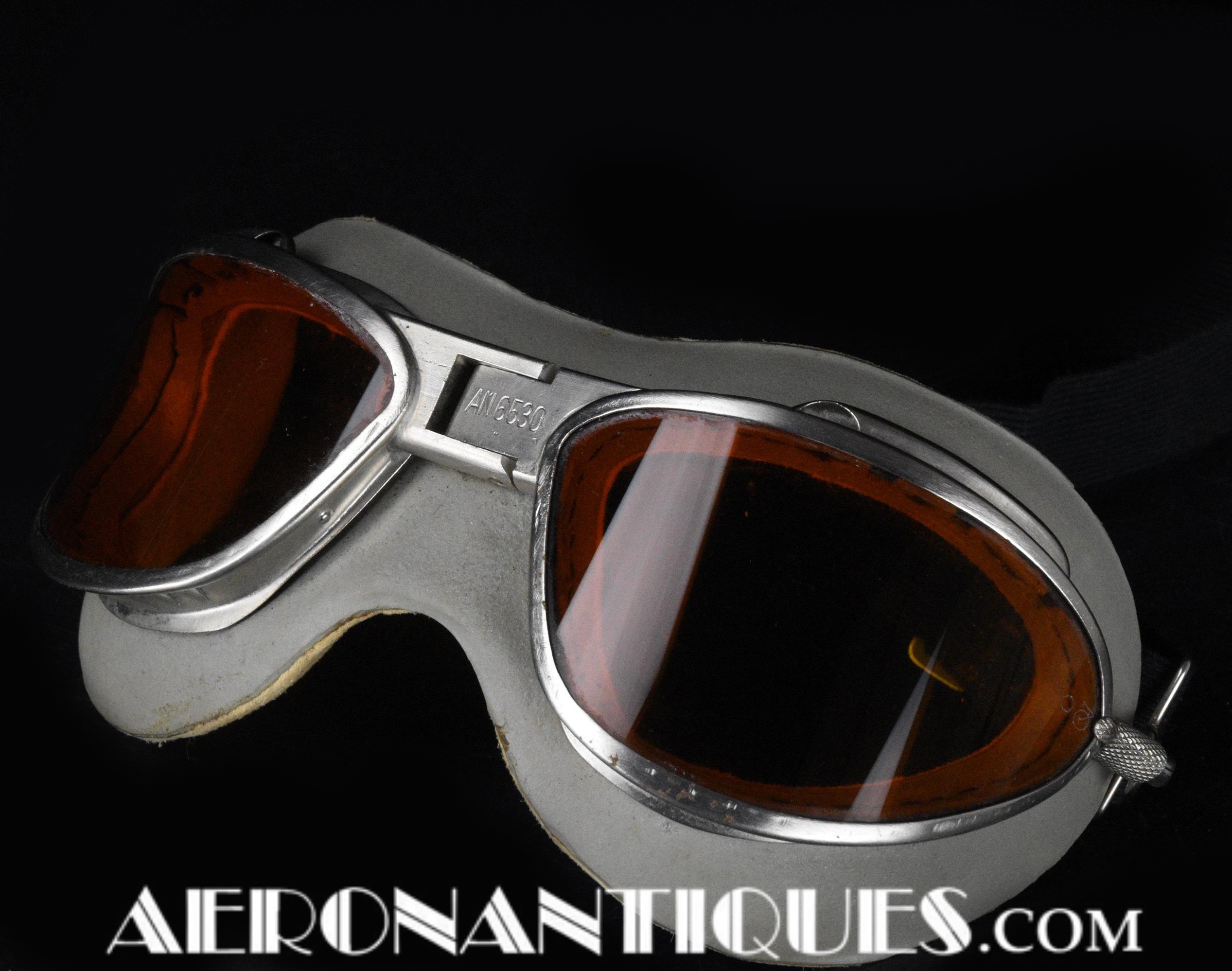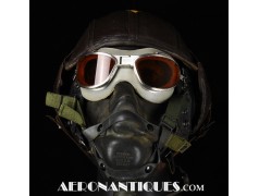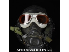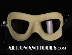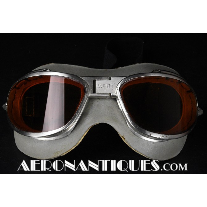 Lunettes de pilote US WWII modèle AN-6530, second modèle en une pièce, de fabrication "Charles Fischer Spring Company". Verres teintés ambrés en verre minéral. Masque caoutchouc gris doublé chamois. Bande de serrage en toile élastique noir avec boucle de réglage. Caoutchouc souple sans craquelures. État neuf.