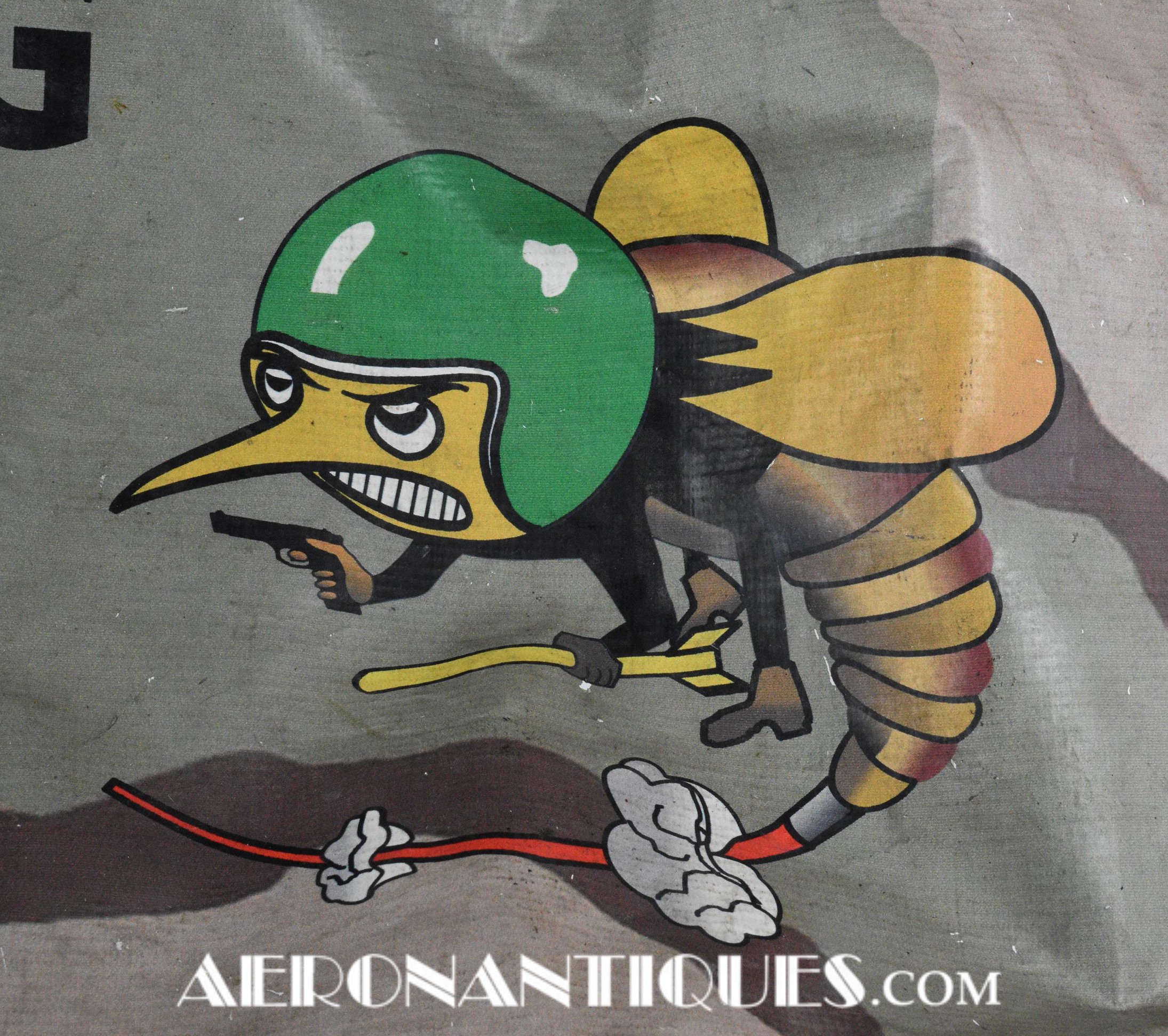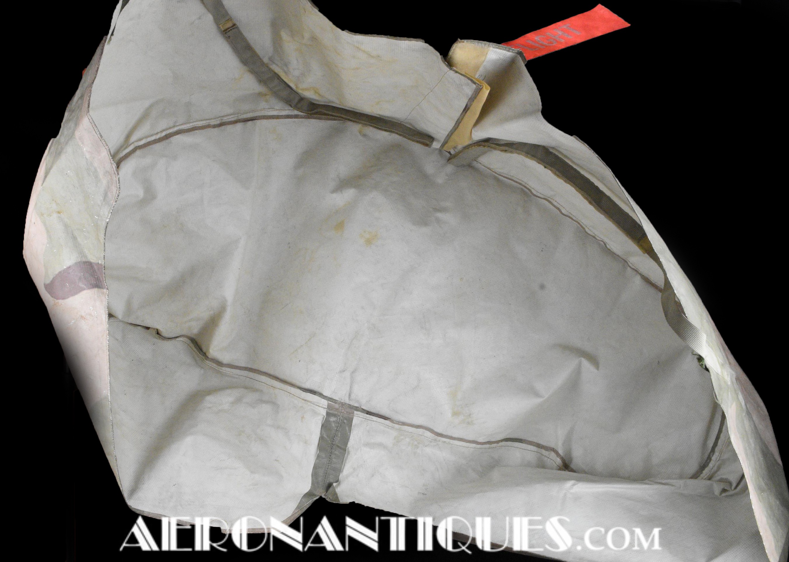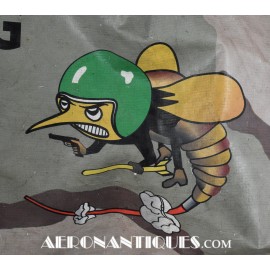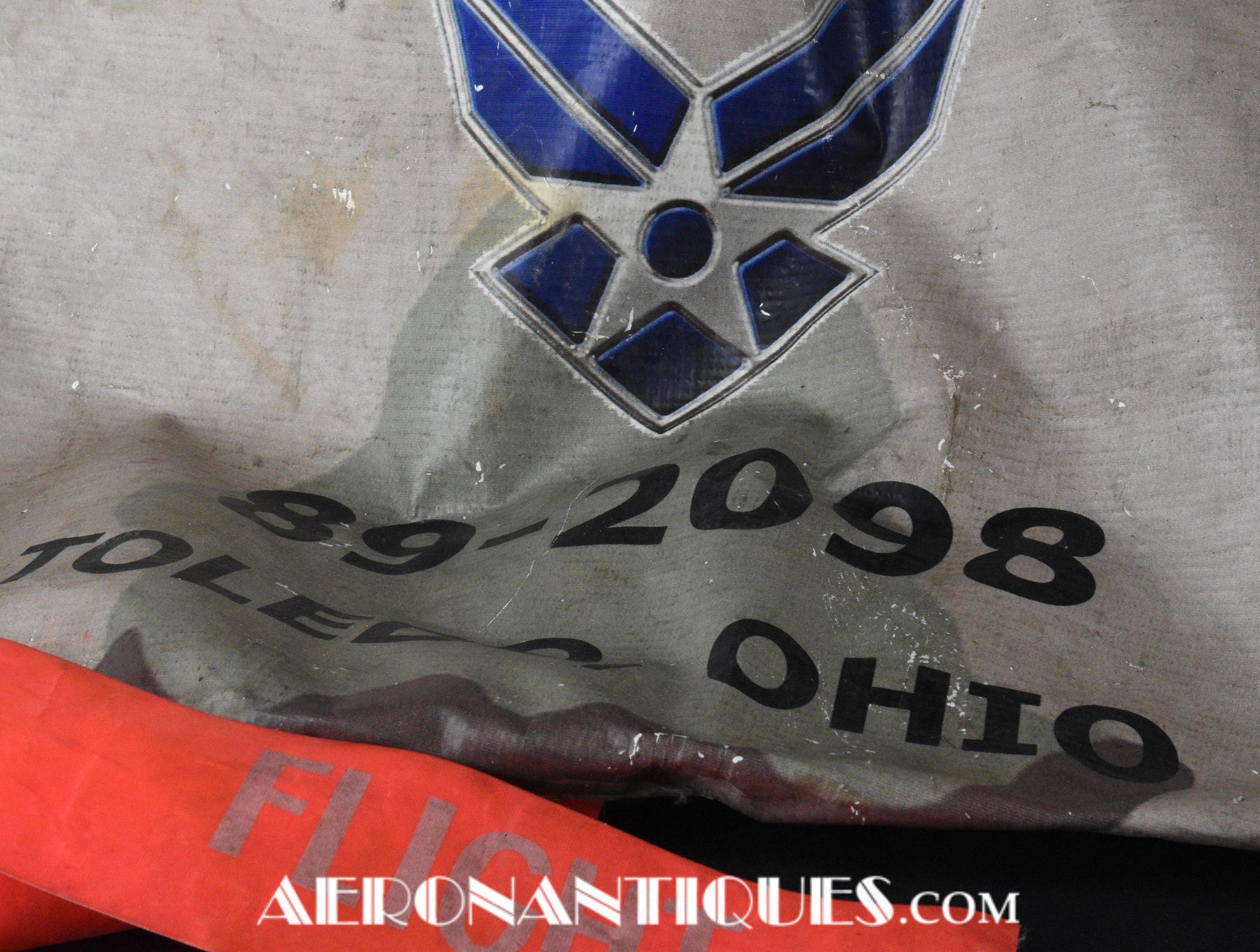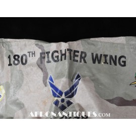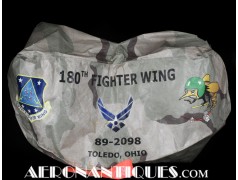 Très rare housse d'entrée d'air du General Dynamics F-16C Block 42F Fighting Falcon 89-2098 du 112th Fighter Squadron, 180th Fighter Wing de la Ohio Air National Guard. Version camouflée utilisée pendant leurs différents  déploiements en Irak de 1996 à 2008. Complète avec ses sangles et son ruban de sécurité. Dimensions: 128 cm X 50 cm.