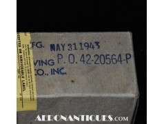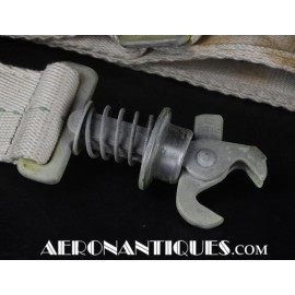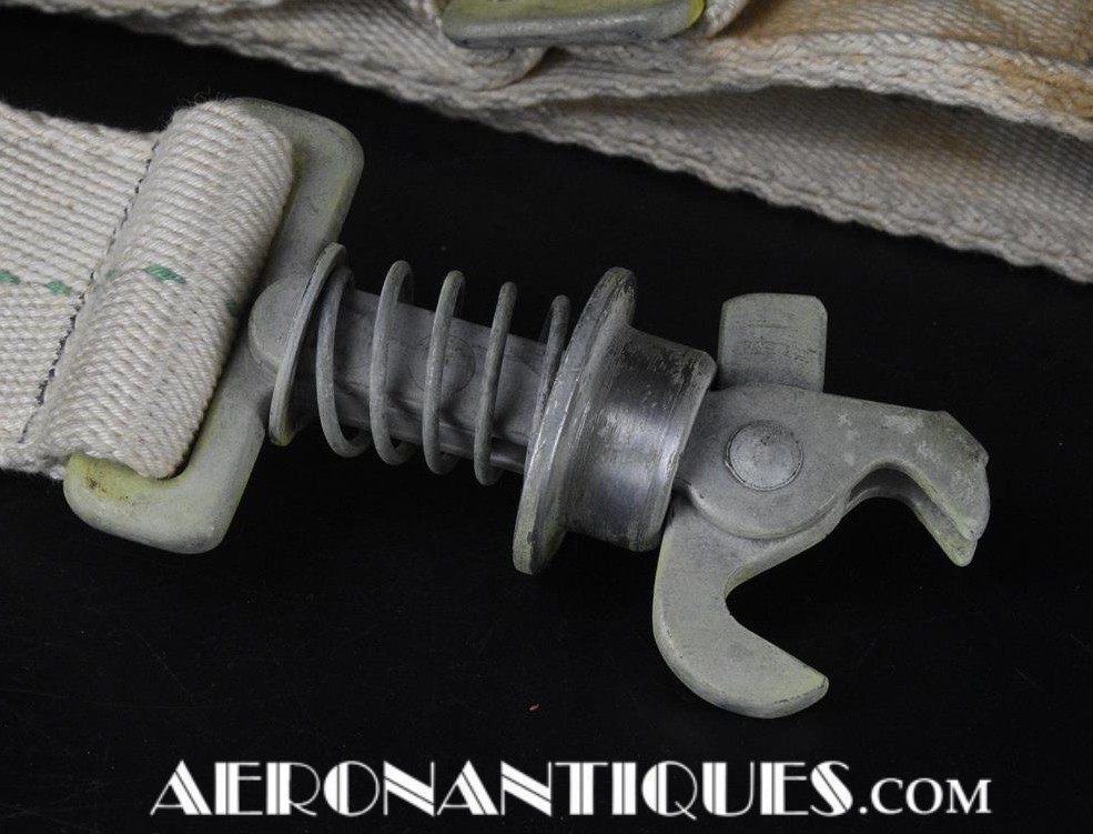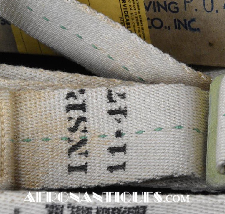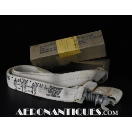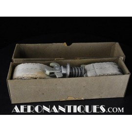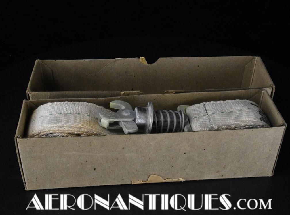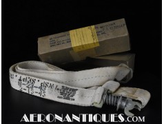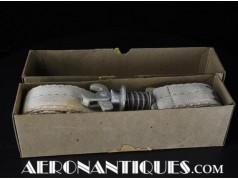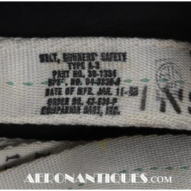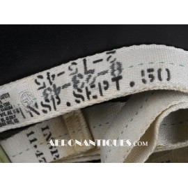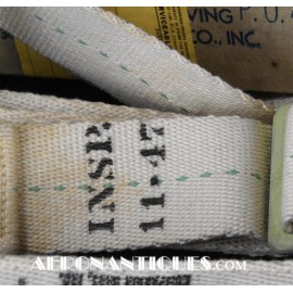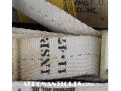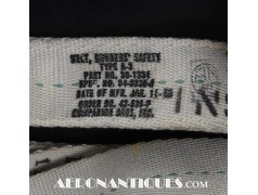 Ceinture de sécurité pour mitrailleur de bombardiers US Army Air Force type A-3. Neuve de stock en boîte d'origine. Datée 1943 avec plusieurs tampons d'inspection post WWII. Elle permettait aux mitrailleurs de sabords une certaine stabilité en position debout ainsi que la sécurisation du parachute lorsqu'il n'était pas monté sur le harnais QAC.