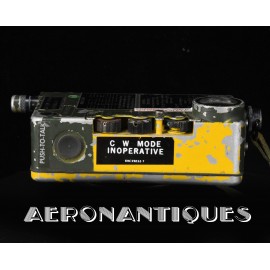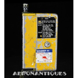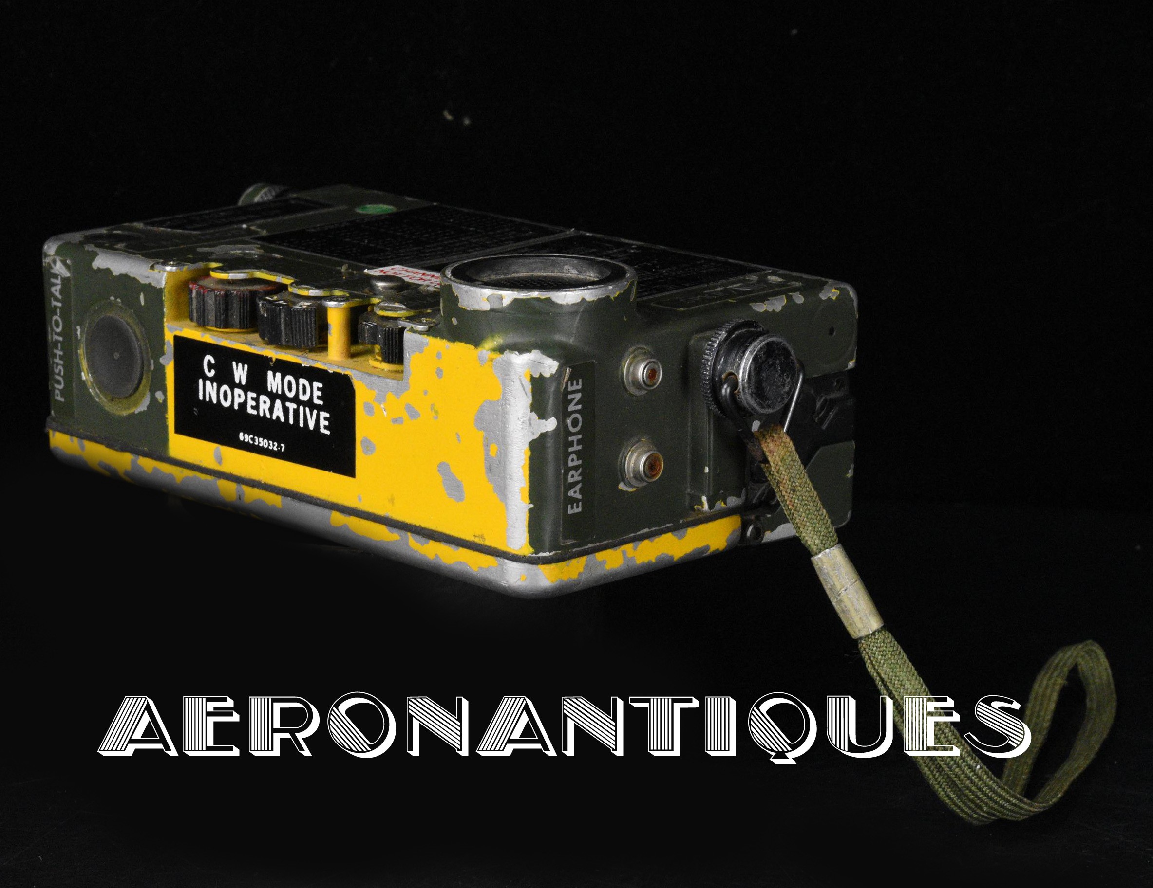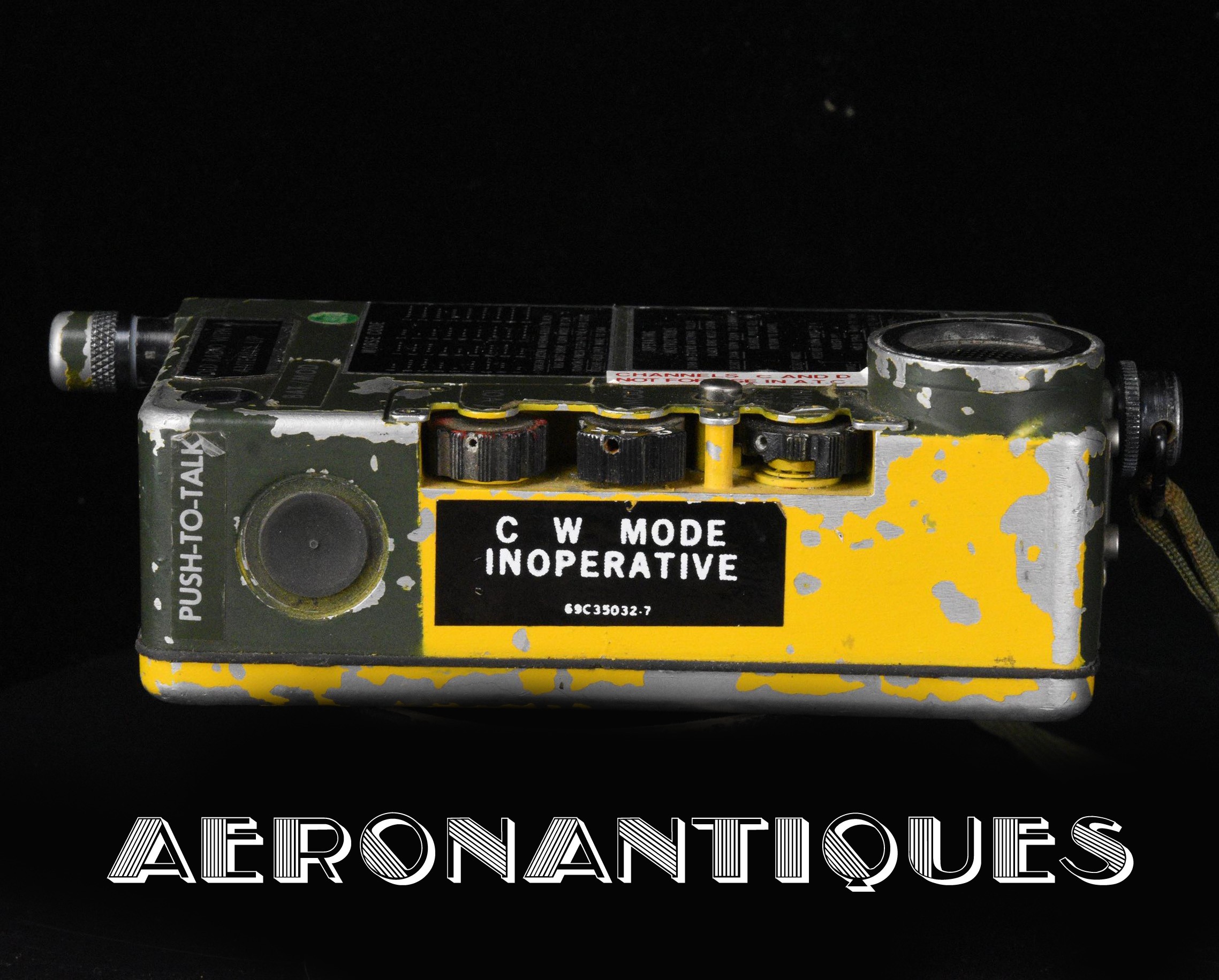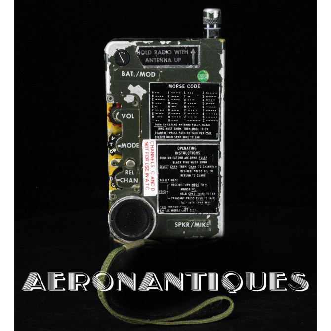 Radio de survie pour pilotes de l'US Air Force modèle URC-64T. Antenne rétractable. Avec sa rare batterie. Cette radio équipait les gilets de survie SRU-21 des pilotes de l'USAF et certaines unités des Forces Spéciales pendant la Guerre  du Vietnam. Ce modèle a été modifié dans les années 80 pour être utilisés dans les centres d'entraînement de l'US Air Force.