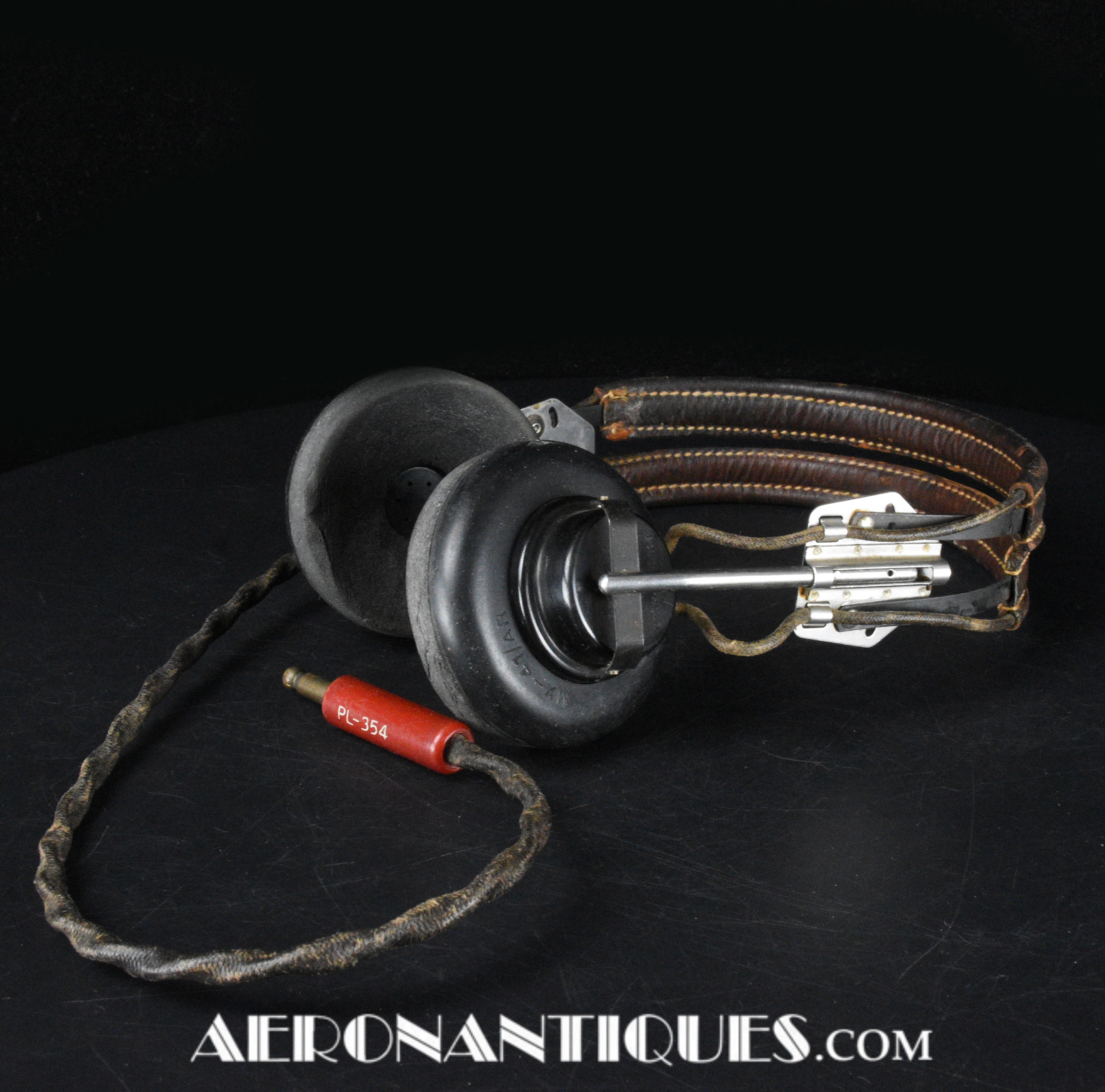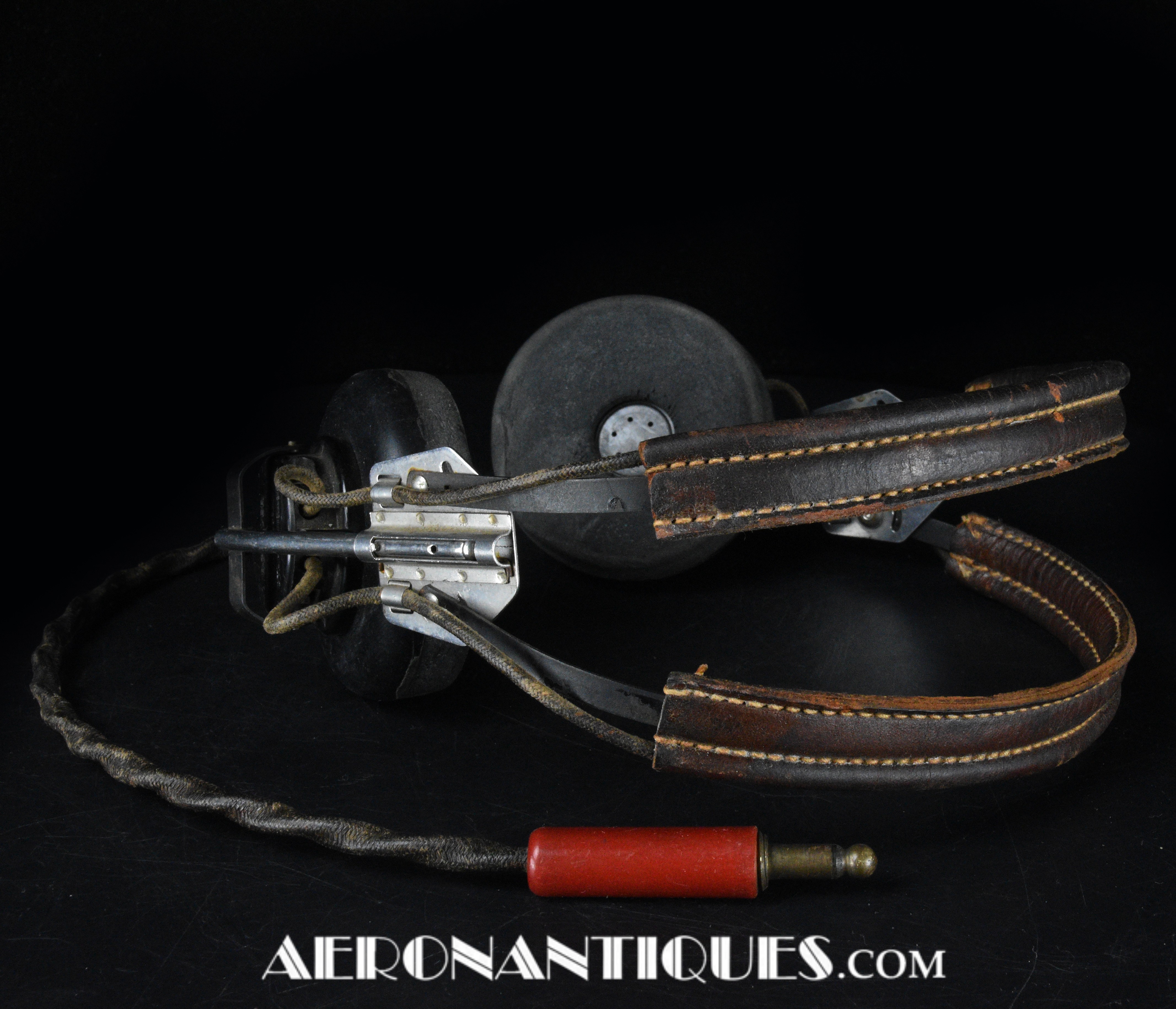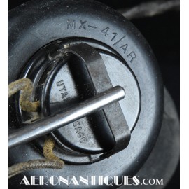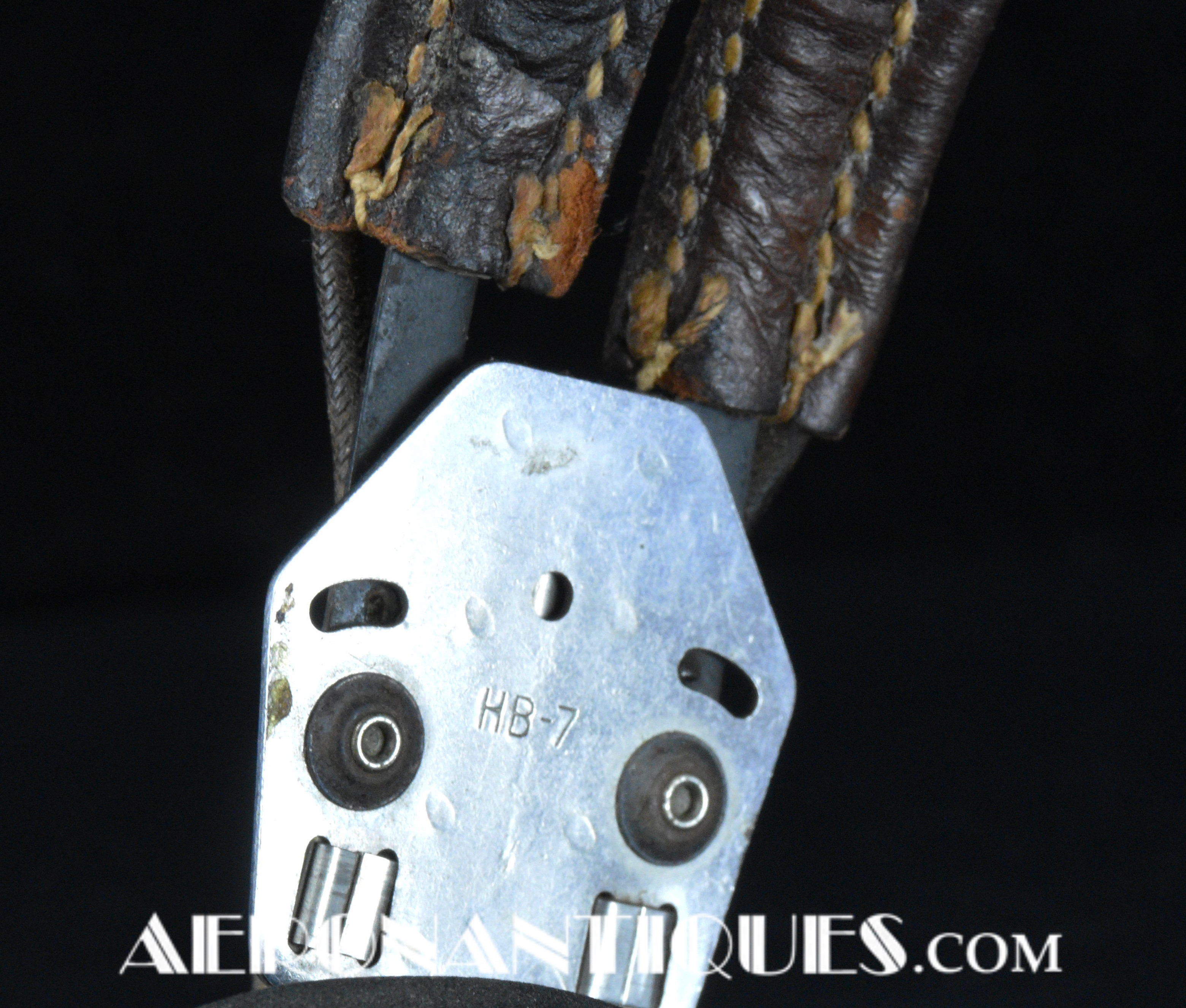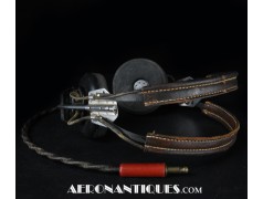 Écouteurs HS-3 (1943-1944) pour équipages de bombardiers ou appareils de transport de troupes. Il est composé d'un serre-tête HB-7 gainée de cuir, de caoutchoucs MX-41/AR et d'écouteurs bakélite type AN-B-H-1 fabrication "UTAH CHICAGO". Fiche type PL-354. Parfait pour présenter une casquette 50 missions, B-1/B-2 ou un serre-tête type A-9/B-6.