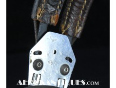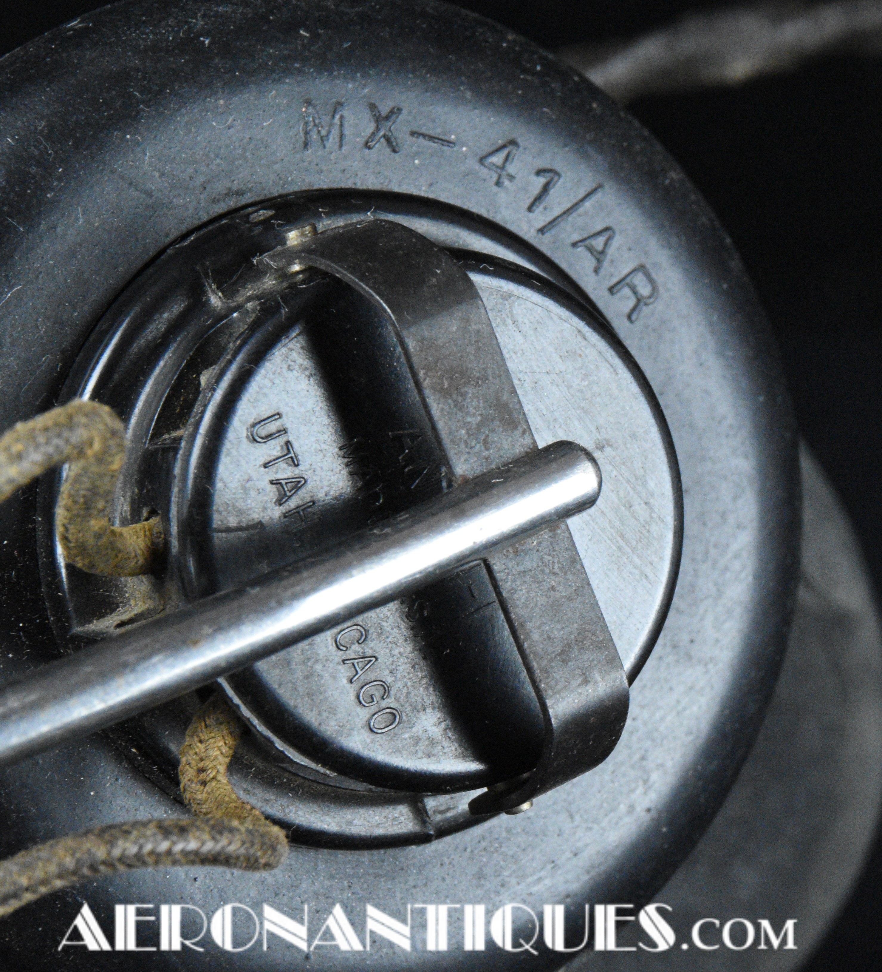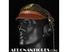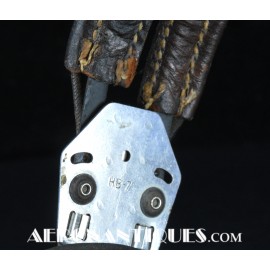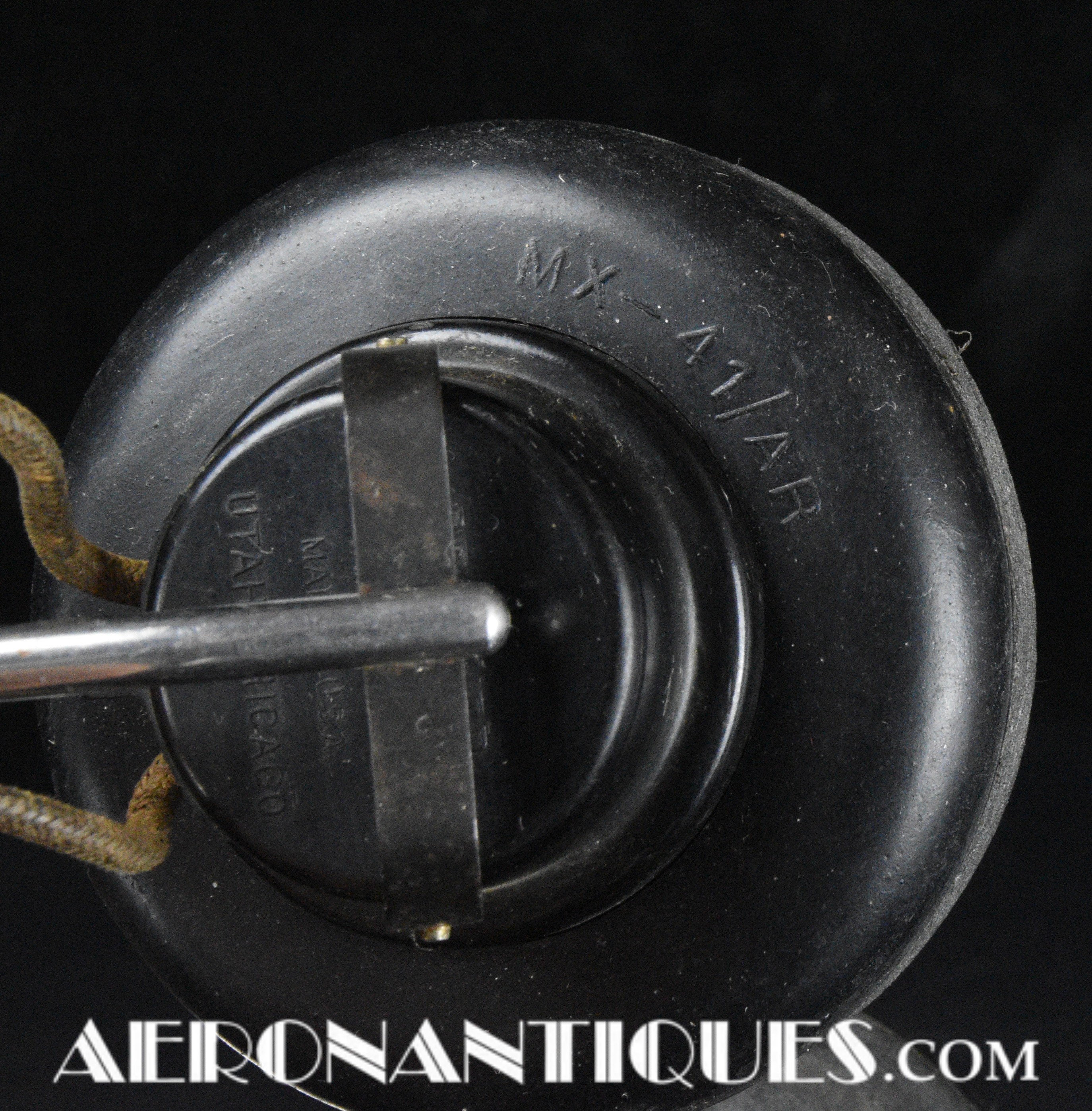 Écouteurs HS-3 (1943-1944) pour équipages de bombardiers ou appareils de transport de troupes. Il est composé d'un serre-tête HB-7 gainée de cuir, de caoutchoucs MX-41/AR et d'écouteurs bakélite type AN-B-H-1 fabrication "UTAH CHICAGO". Fiche type PL-354. Parfait pour présenter une casquette 50 missions, B-1/B-2 ou un serre-tête type A-9/B-6.