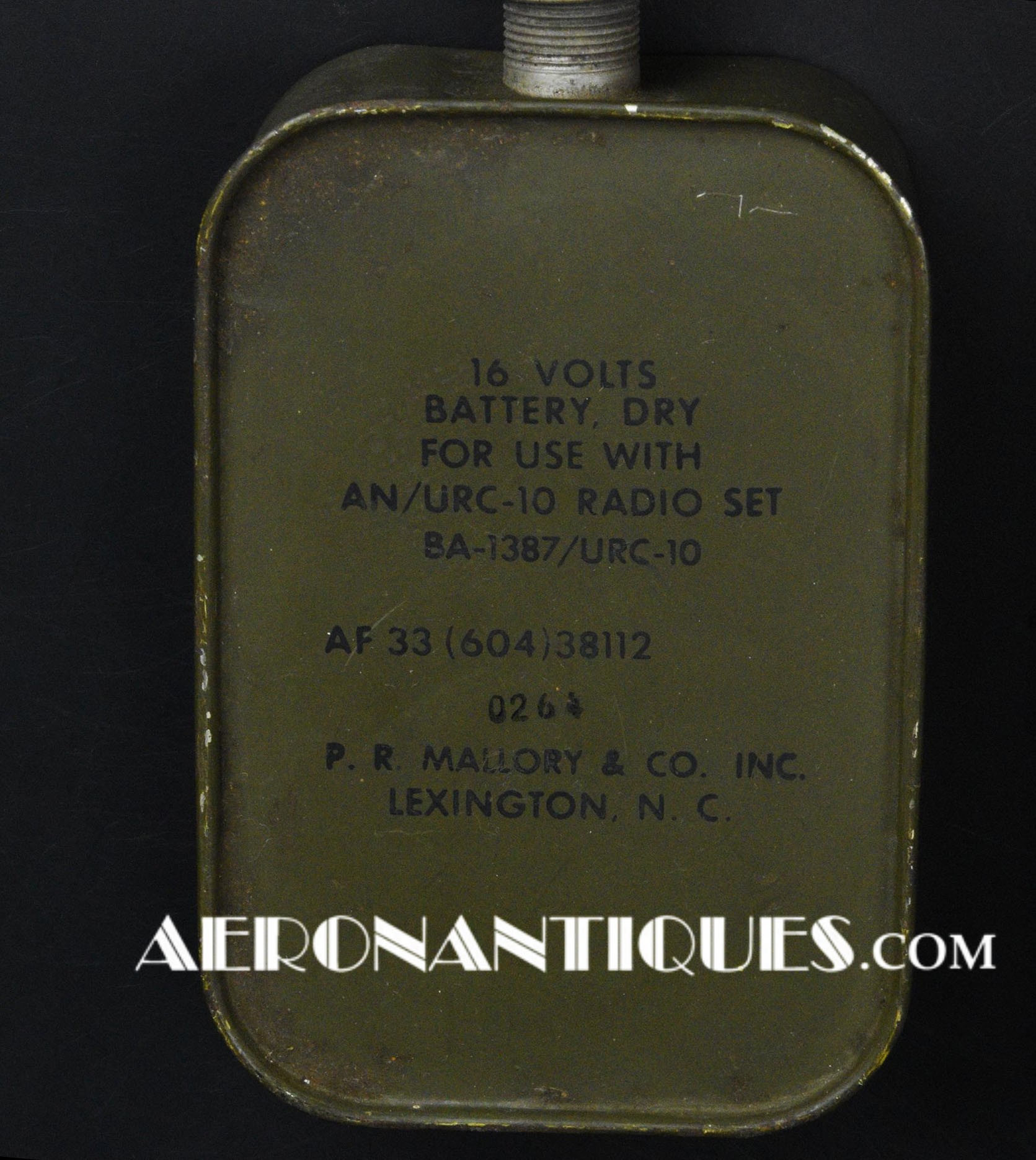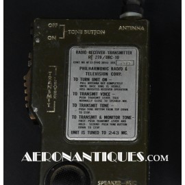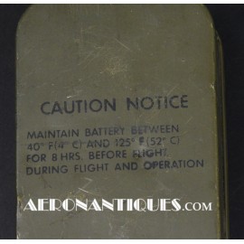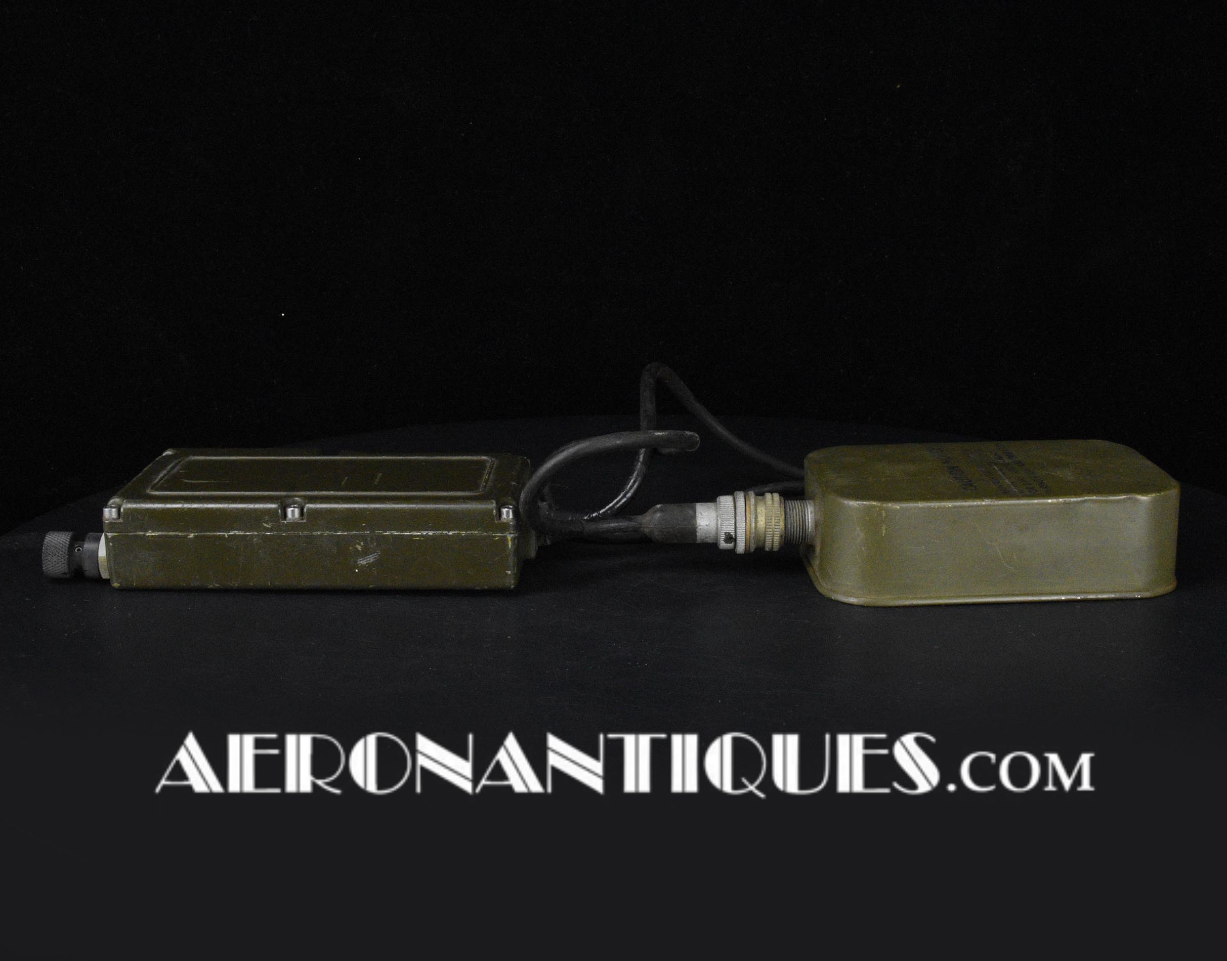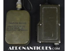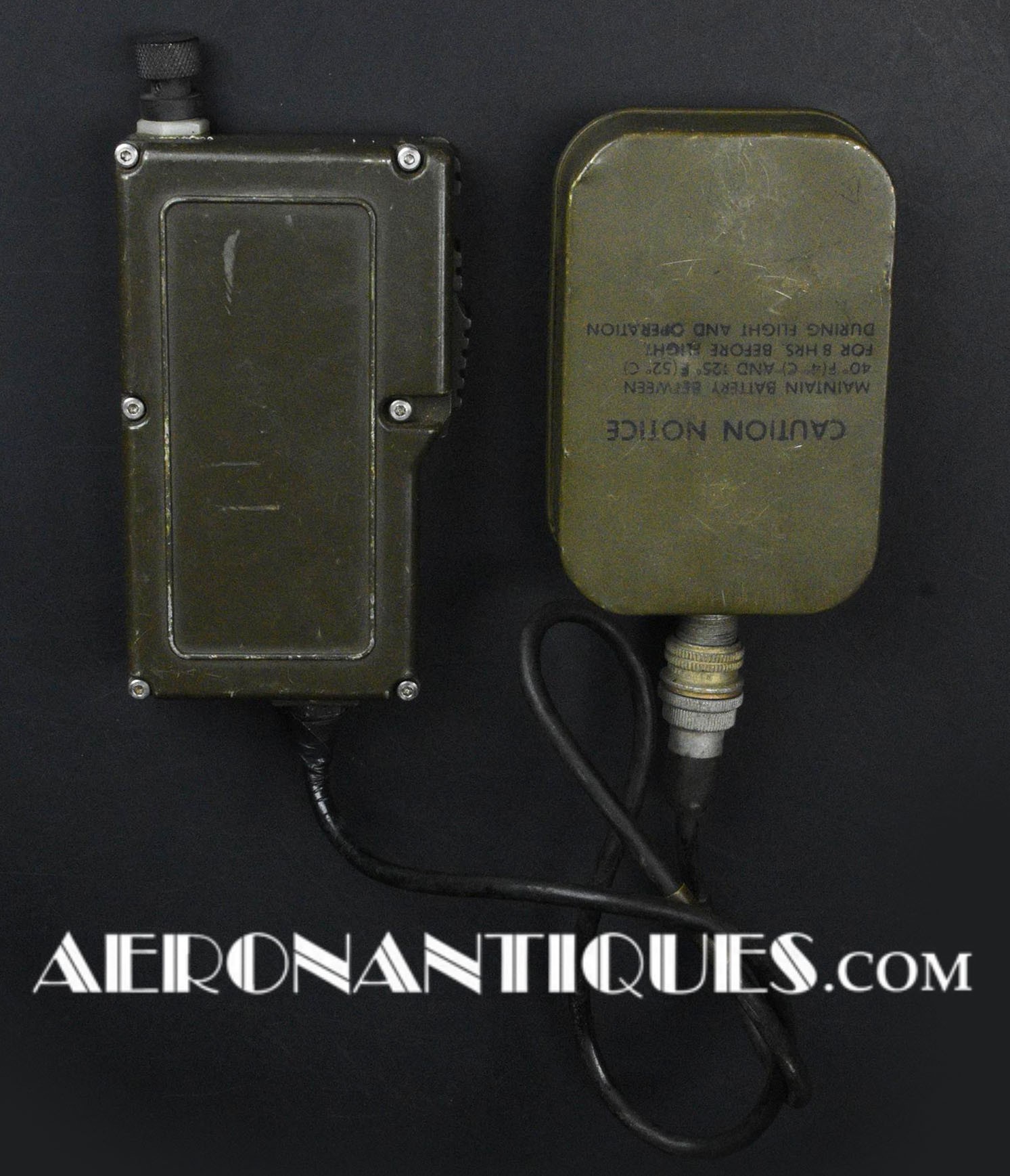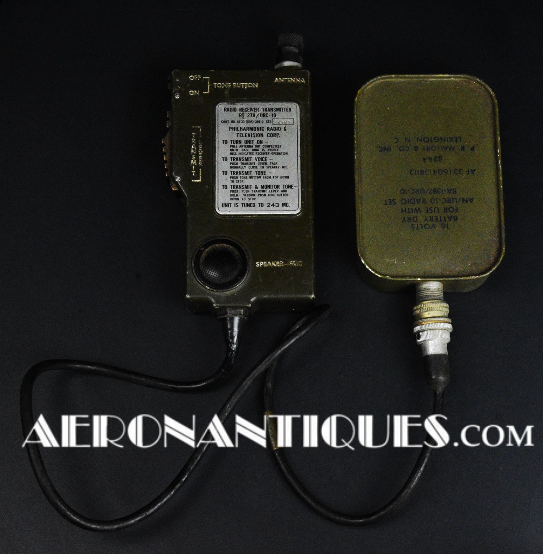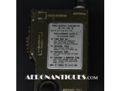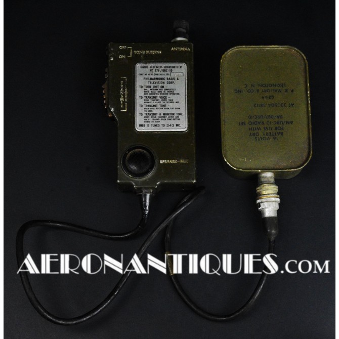 Radio de survie pour pilotes de l'US Air Force modèle URC-10/RT-278. Antenne rétractable. Période 1965/68. Complète avec sa rare batterie auxiliaire. Développée parallèlement au modèle RT-10 et remplaçante des très lourdes URC-4/11/14, cette radio équipait les gilets de survie SRU-21 et les kits de siège éjectable des pilotes de l'US Air force et certaines unités des Forces Spéciales pendant la Guerre du Vietnam.