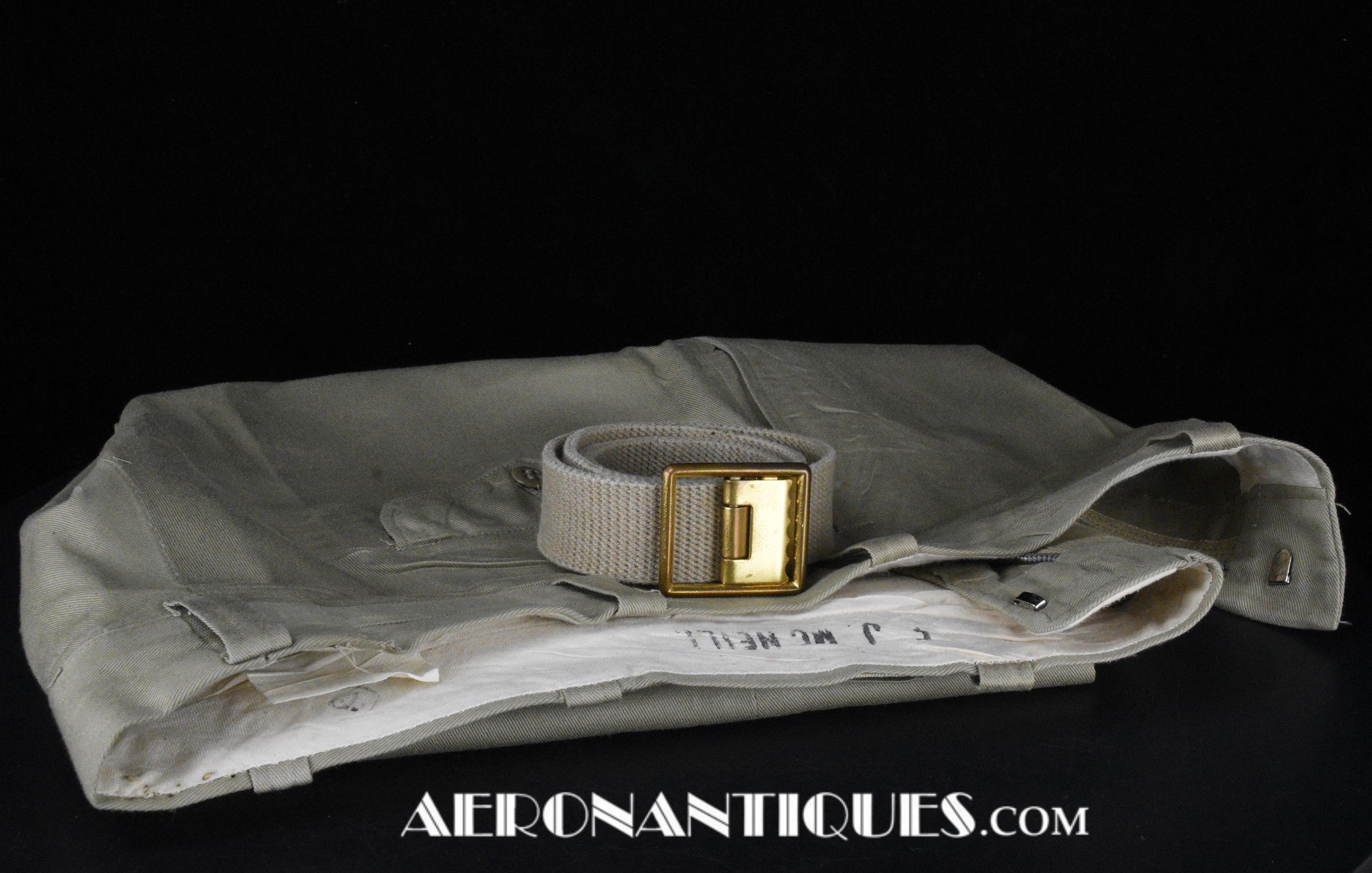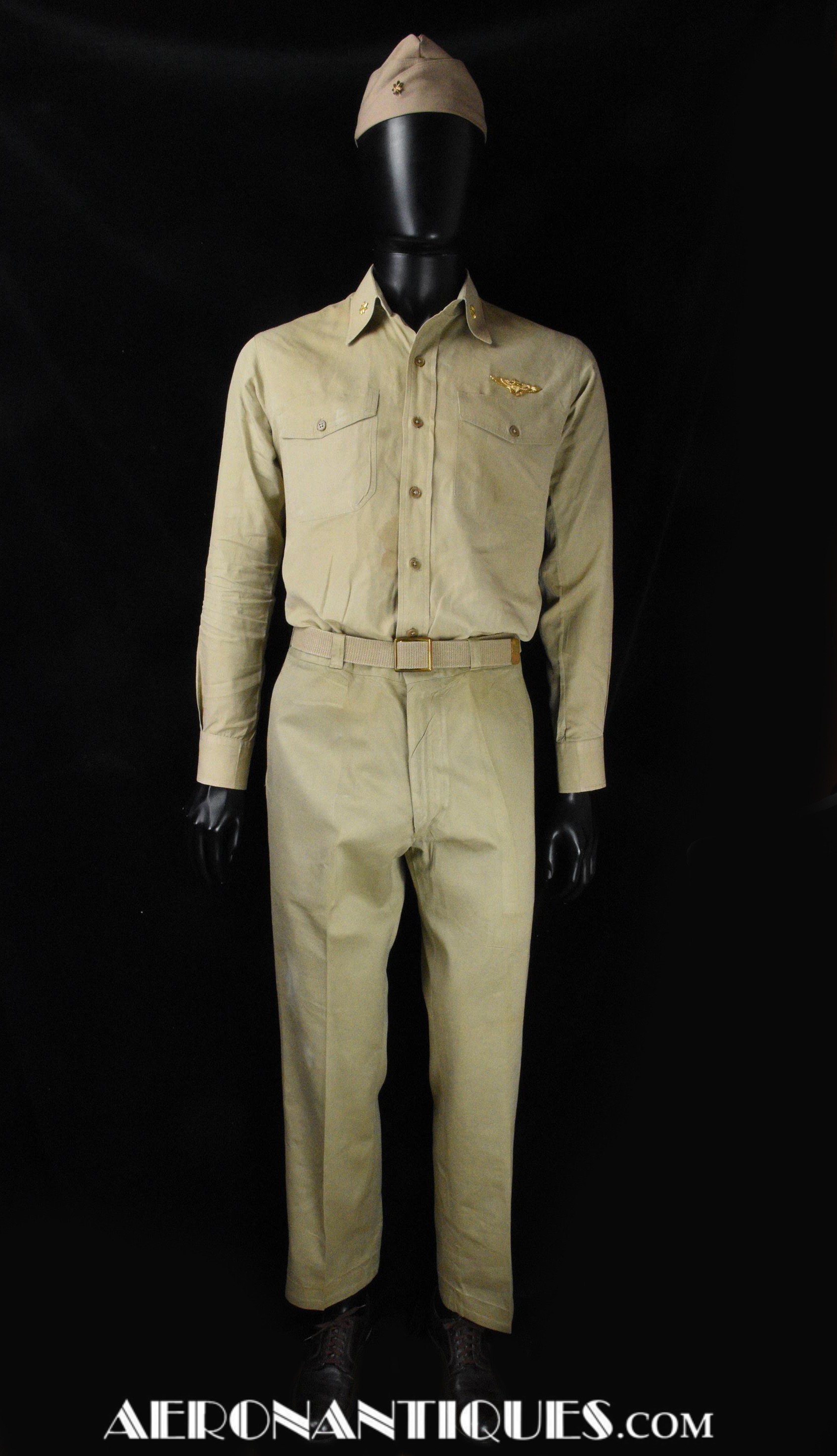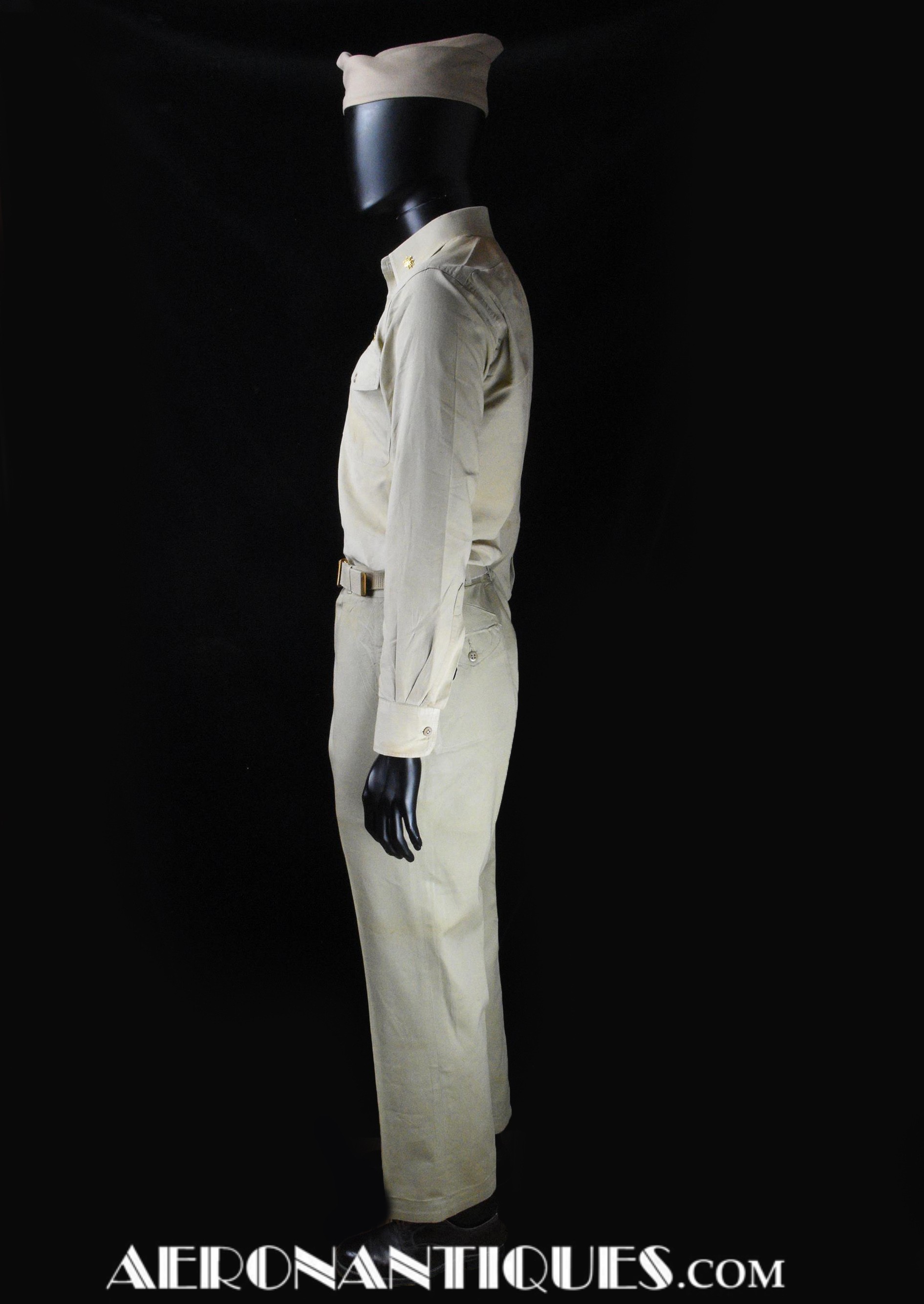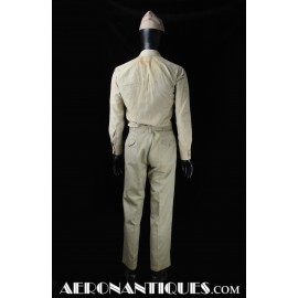 Tenue de service été originale d'un pilote Lcdr US Navy ou Major US Marine Corps incluant calot, chemise, ceinture, pantalon et chaussures. Période années 60 mais utilisable pour de la reconstitution ou une imitation du Major Boyington dans les Têtes Brûlées. Grades de Major/Lcdr sur la chemise et le calot, brevet aéronaval grand modèle sur la chemise. Calot fabrication BANCROFT. Quelques taches de café sur la chemise.Chaussures réglementaires avec semelle et talons d'origine.