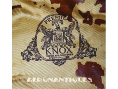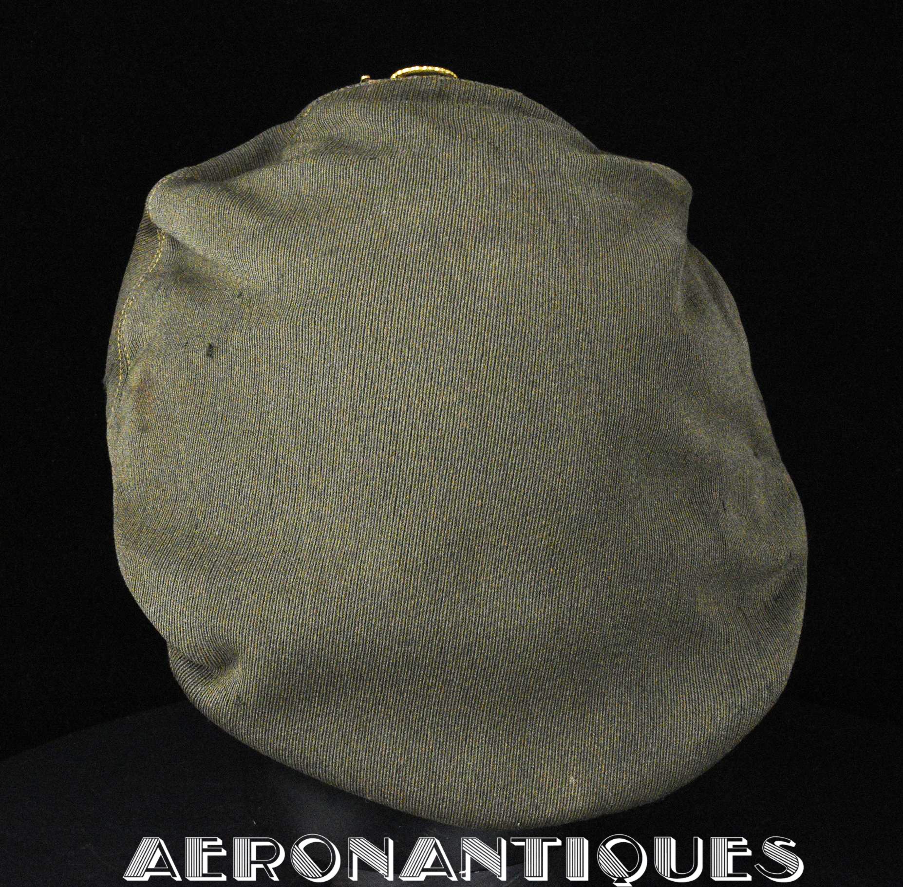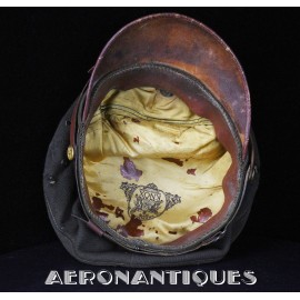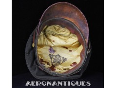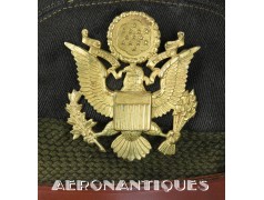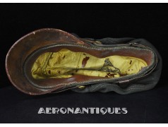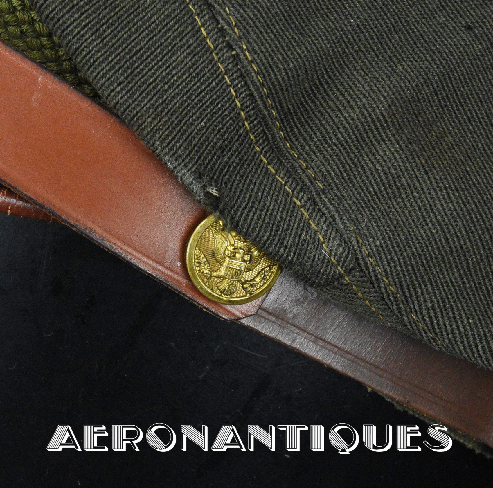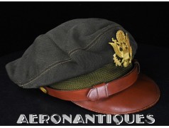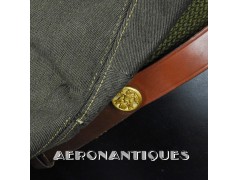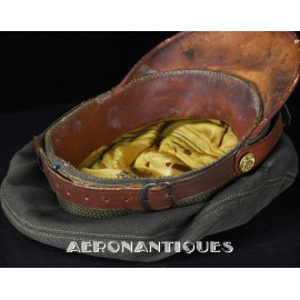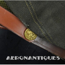 Très belle casquette 50 missions officier pilote US Army Air Force WWII. Véritable fabrication légère par la firme KNOX à New-York. Coiffe en twill de laine OD#7, visière en cuir et armature souples, jugulaire montée sur boutons en laiton doré à motifs d'aigle moulé. Aigle en laiton doré. Seconde jugulaire type cavalerie. Taille 56/57cm. Usure et quelques accrocs. Très belle patine. Lunettes et écouteurs non inclus.