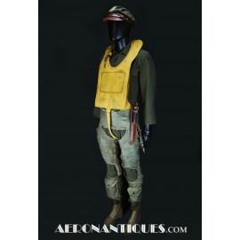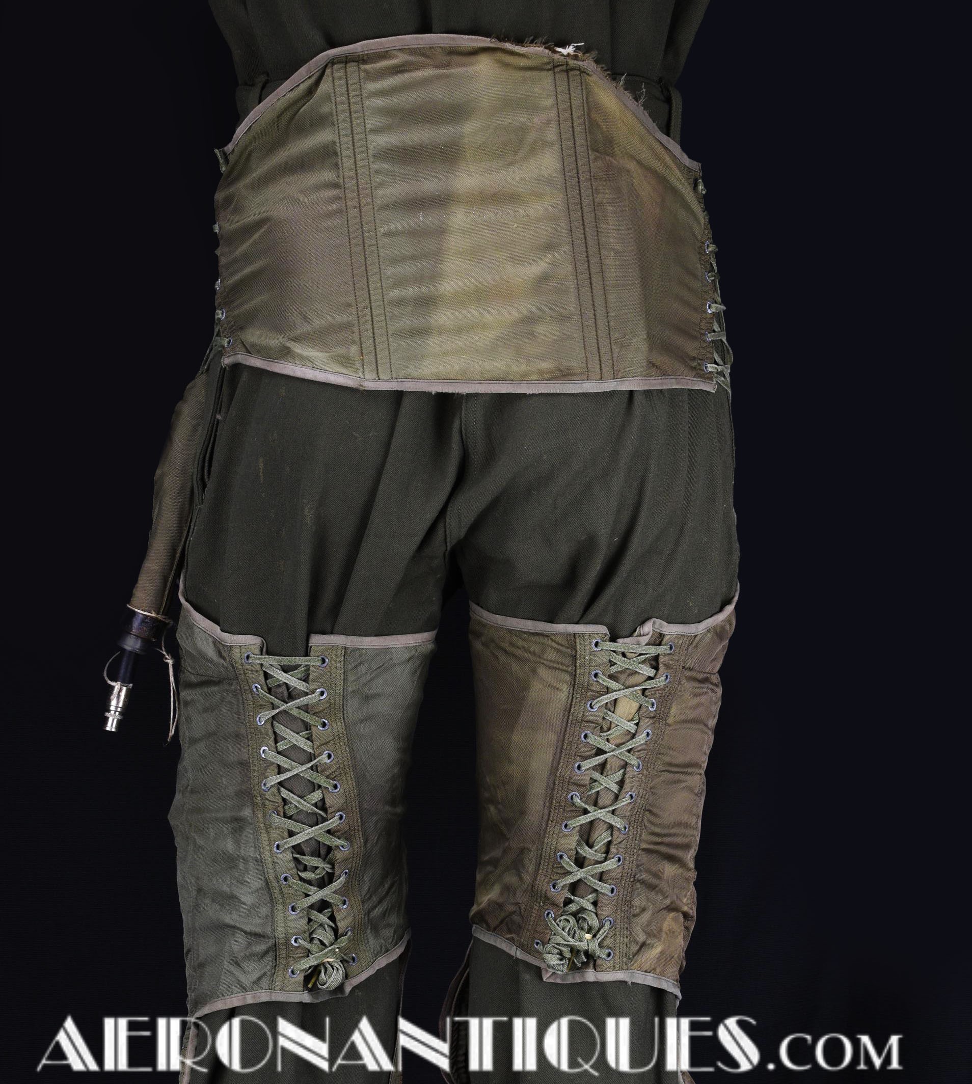 Pantalon de vol anti-G US ARMY AIR FORCE modèle G-3A en nylon natté OD#3, tuyau d'arrivée d'air fixe avec dispositif de gonflage de secours en cas d'amerrissage forcé. Taille LARGE-SHORT. Fabrication BERGER BROS de 1945. Complet avec toutes les fermetures à glissière en état de fonctionnement. Il s'agit du troisième modèle de pantalon anti-G adopté à partir de Mars 1945 par les pilotes de chasse volant sur Mustang P-51 ou P-47 Thunderbolt.