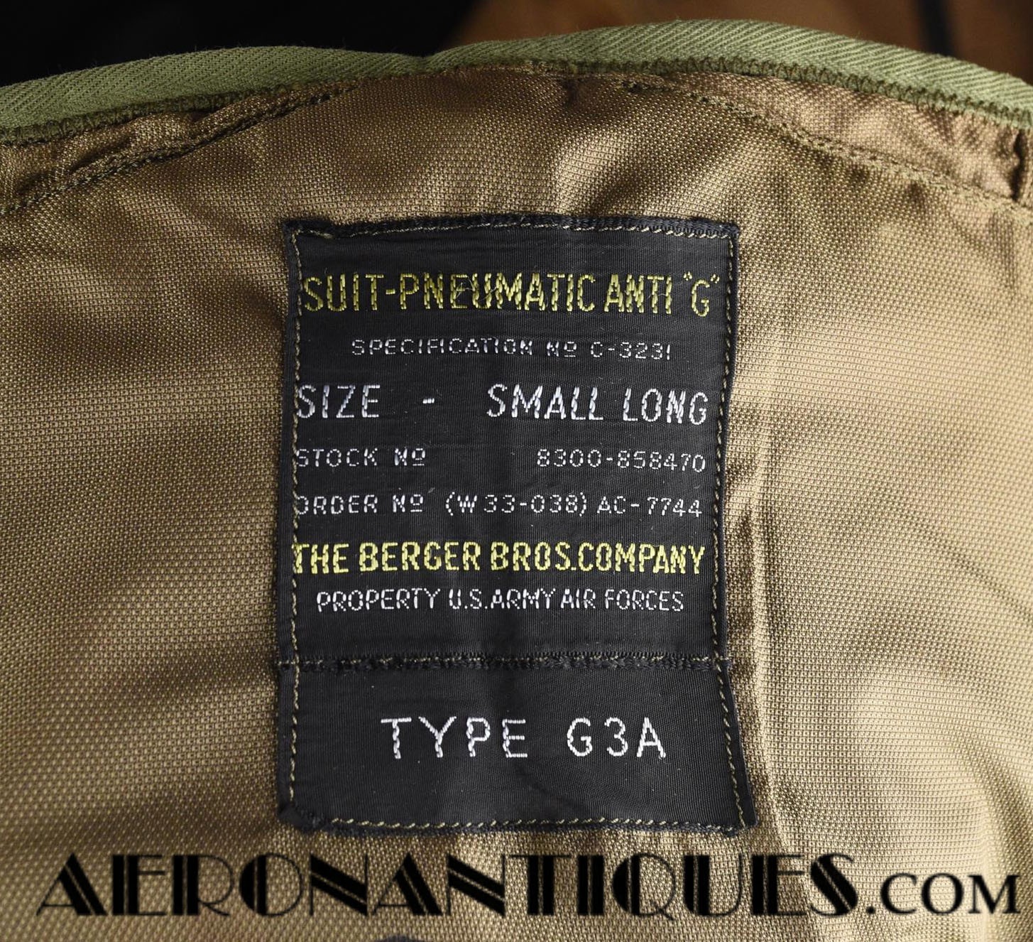 Pantalon de vol anti-G US ARMY AIR FORCE modèle G-3A en nylon natté OD#3, tuyau d'arrivée d'air fixe. Taille SMALL-LONG. Fabrication BERGER BROS de 1945. Complet avec toutes les fermetures à glissière en état de fonctionnement. Il s'agit du troisième modèle de pantalon anti-G adopté à partir de Mars 1945 par les pilotes de chasse volant sur Mustang P-51 ou P-47 Thunderbolt.