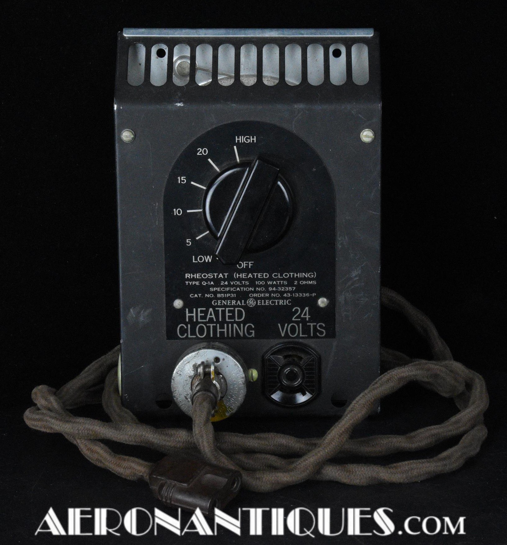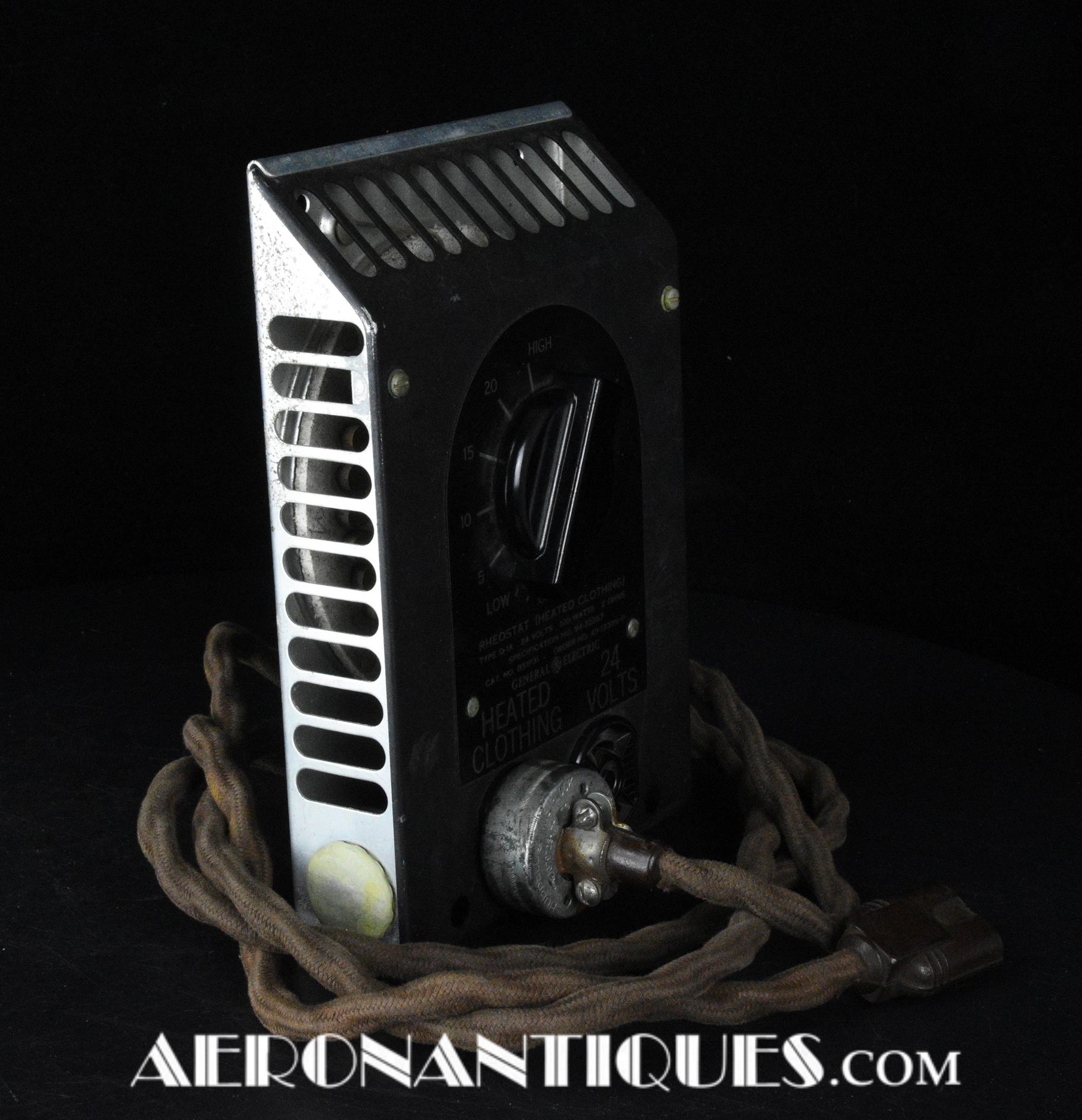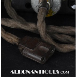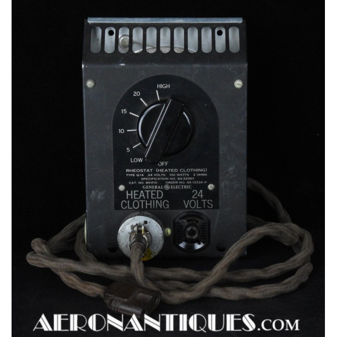 Rhéostat pour combinaisons de vol électrique chauffantes (modèle F-1, F-2). Fabrication Américaine par General Electric. Contrat de 1943. Il est accompagné du très rare cordon permettant de faire la liaison entre l'ensemble chauffant et le module de réglage. Excellent état.