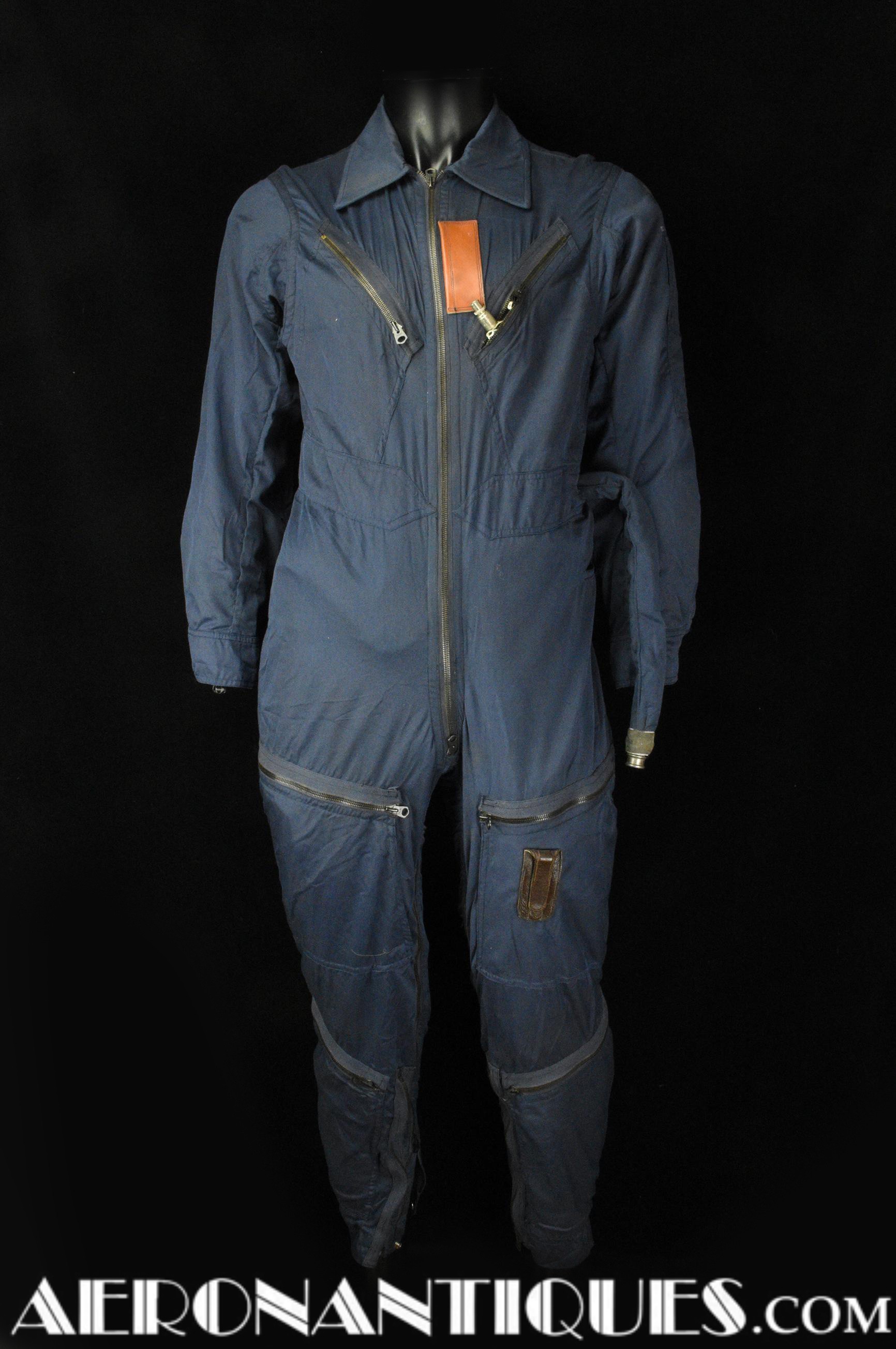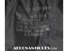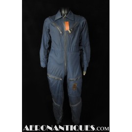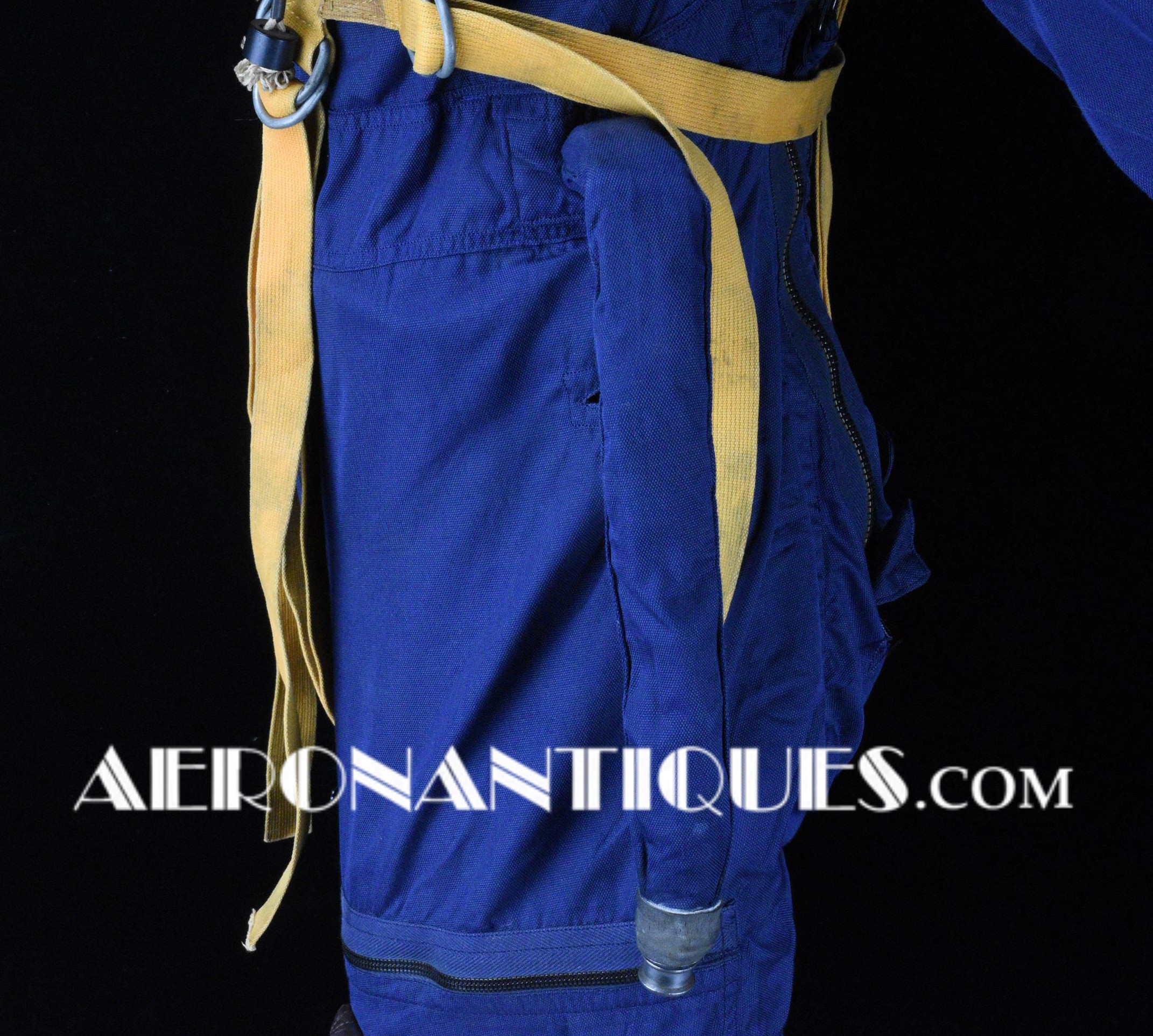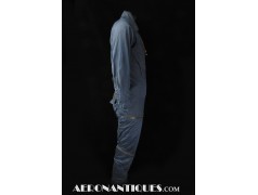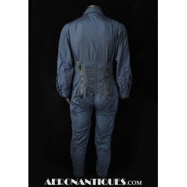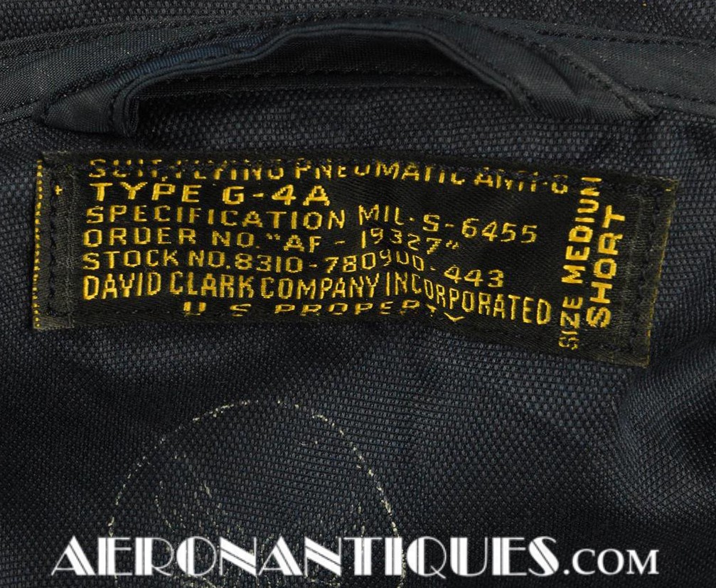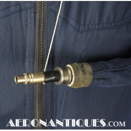 Combinaison de vol anti-G type G-4A US Air Force avec dispositif pneumatique intégré permettant d'éviter la perte de connaissance des pilotes de chasse lors de manœuvres à facteur de charge élevé. Mélange de coton et nylon natté bleu USAF. Taille MEDIUM SHORT. Toutes les fermetures à glissière sont intactes et fonctionnelles. Durite d'alimentation non coupée avec dispositif permettant de boucher l'arrivée d'air et transformer la combinaison en bouée de sauvetage. Egalement incluse la housse de transport d'origine estampillée aux spécifications du modèle. Fabrication DAVID CLARK. Mise en service en 1948 et remplacée à partir du milieu des années 50 par la combinaison MB-2. Les accessoires de présentation ne sont pas inclus.