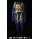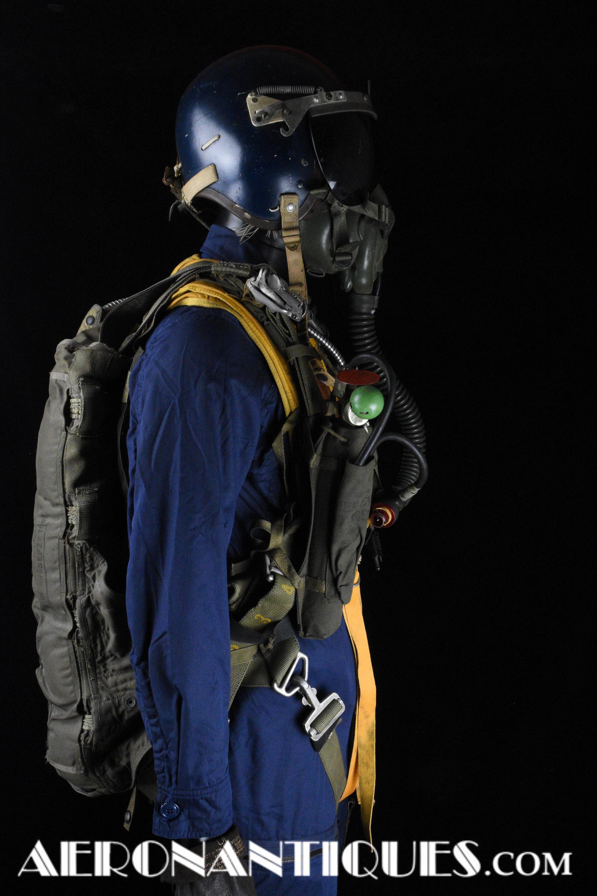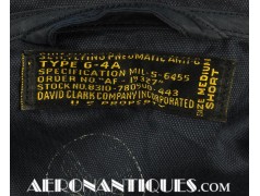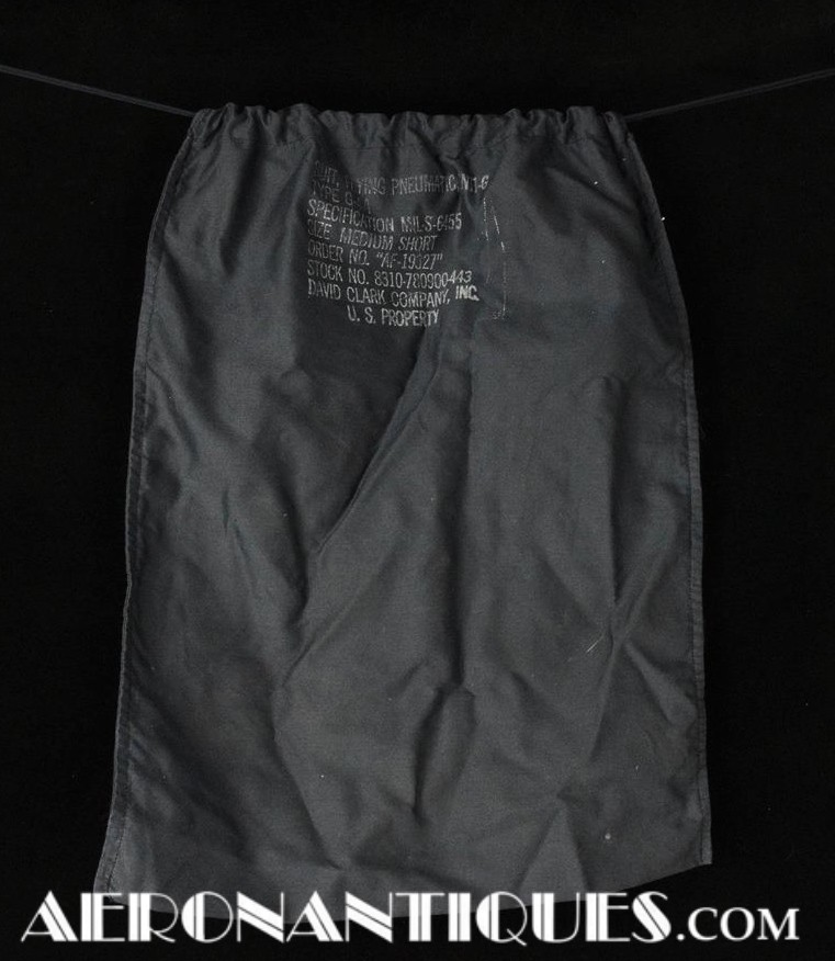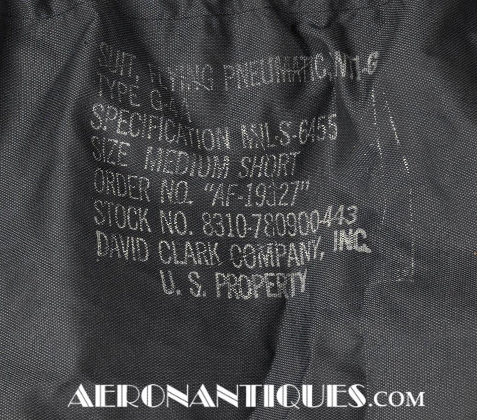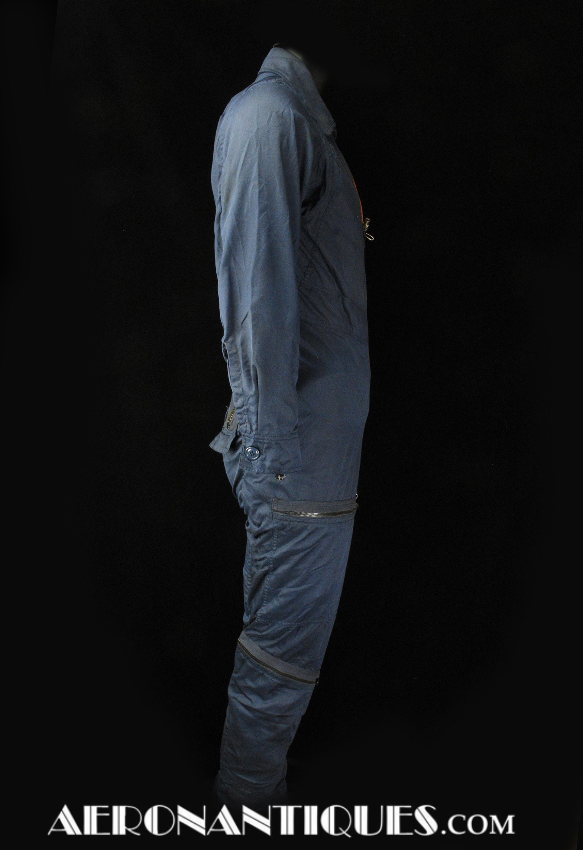 Combinaison de vol anti-G type G-4A US Air Force avec dispositif pneumatique intégré permettant d'éviter la perte de connaissance des pilotes de chasse lors de manœuvres à facteur de charge élevé. Mélange de coton et nylon natté bleu USAF. Taille MEDIUM SHORT. Toutes les fermetures à glissière sont intactes et fonctionnelles. Durite d'alimentation non coupée avec dispositif permettant de boucher l'arrivée d'air et transformer la combinaison en bouée de sauvetage. Egalement incluse la housse de transport d'origine estampillée aux spécifications du modèle. Fabrication DAVID CLARK. Mise en service en 1948 et remplacée à partir du milieu des années 50 par la combinaison MB-2. Les accessoires de présentation ne sont pas inclus.