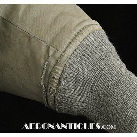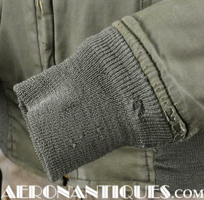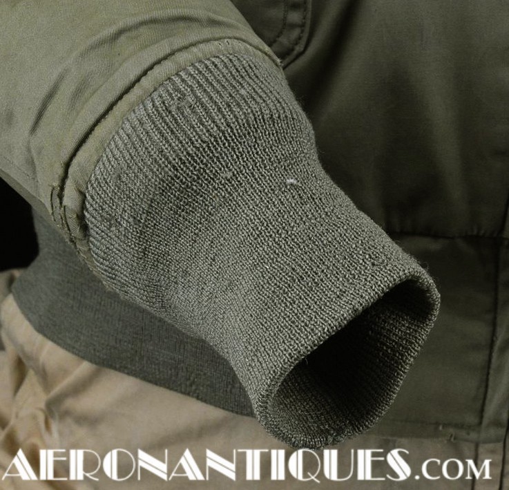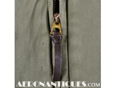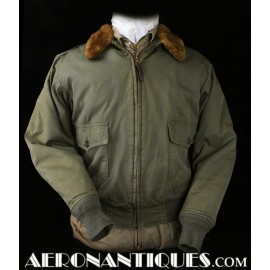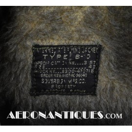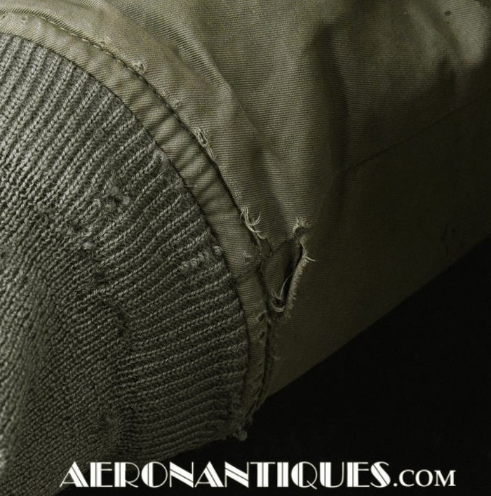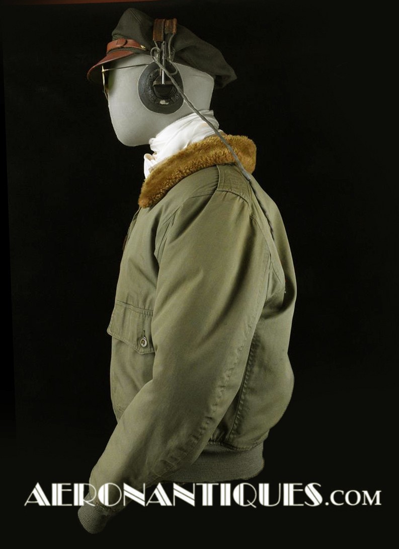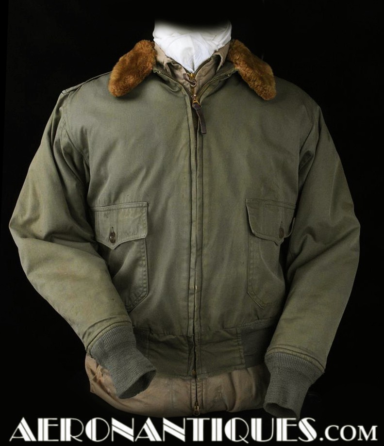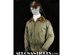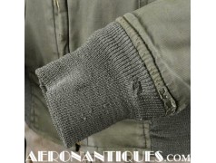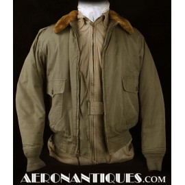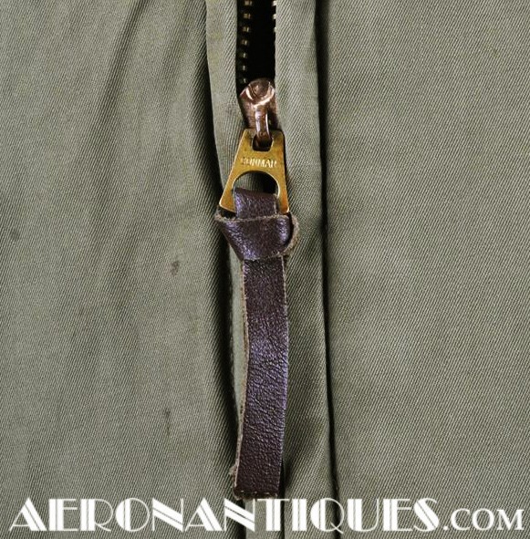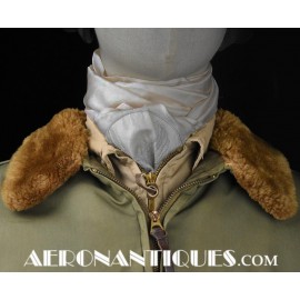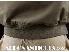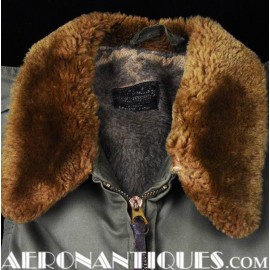 Blouson de vol type B-10 de l'US Army Air Force, circa 1943. En coton OD n° 3 avec doublure en laine et alpaga. Col en mouton doré. Fabrication SOVEREIGN MFG CO. Taille 42. Fermeture à glissière CONMAR d'origine en excellent état de fonctionnement avec sa tirette en cuir. Tricotines d'origine en très bel état malgré quelques réparations. Usure et réparations à l'intérieur des manches. Blouson de vol emblématique de la Seconde Guerre mondiale, conçu à l'origine pour être porté avec le pantalon A-9, destiné aux pilotes de chasse et de bombardier, mais également à leurs équipages. Il sera remplacé mi-1944 par le modèle B-15. la pièce idéale pour finaliser un mannequin de pilote de P-47 Thunderbolt ou P-51 Mustang ou un membre d'équipage de bombardier.