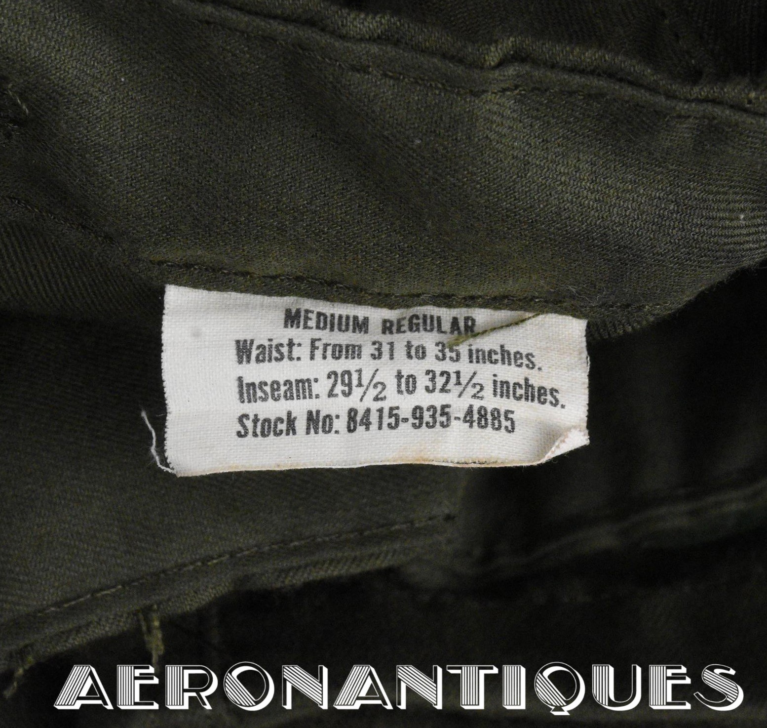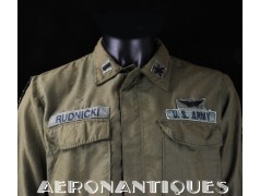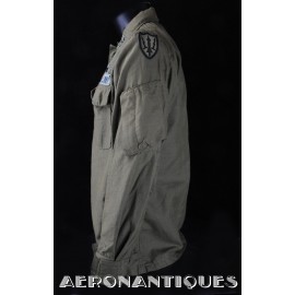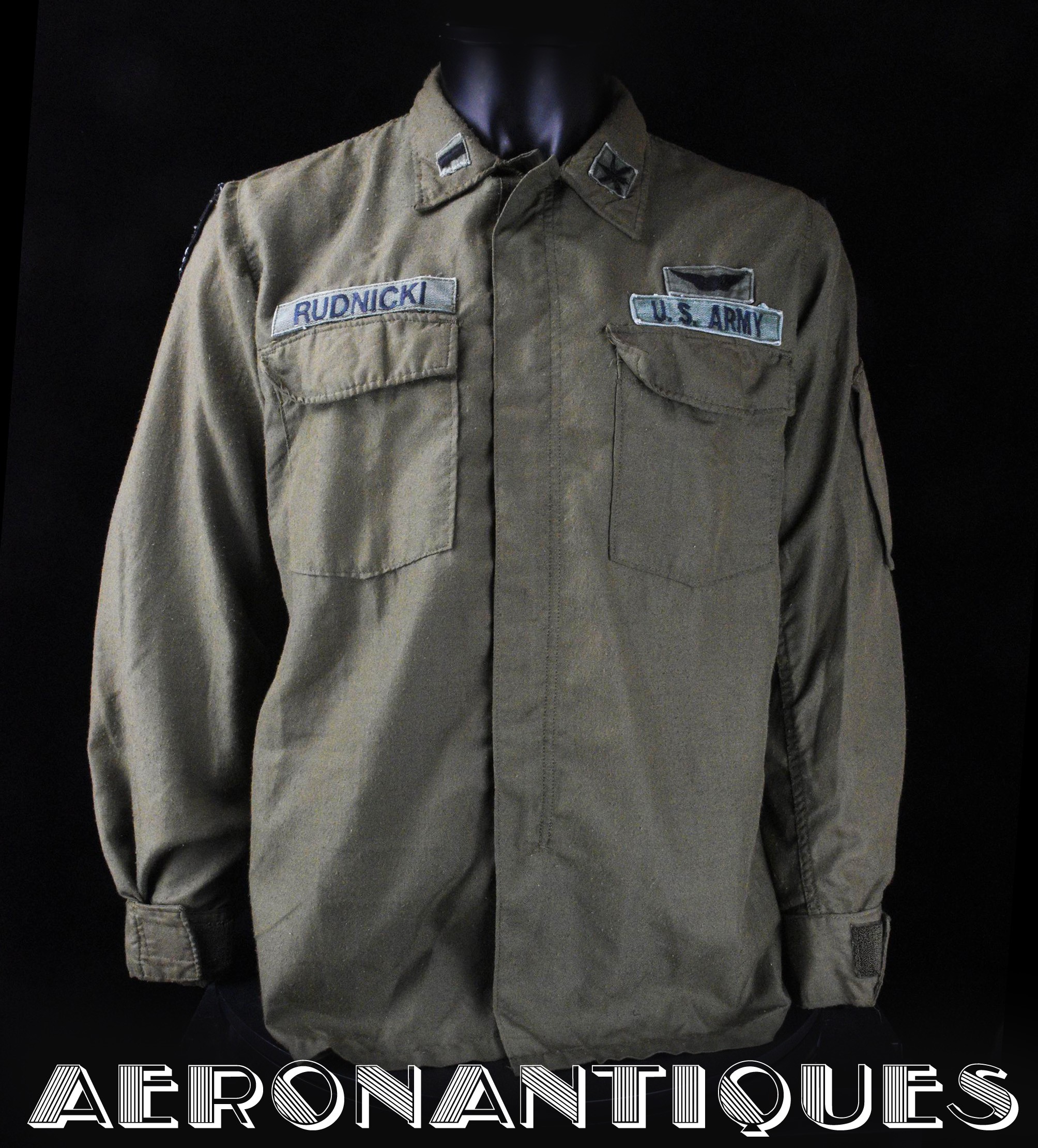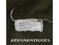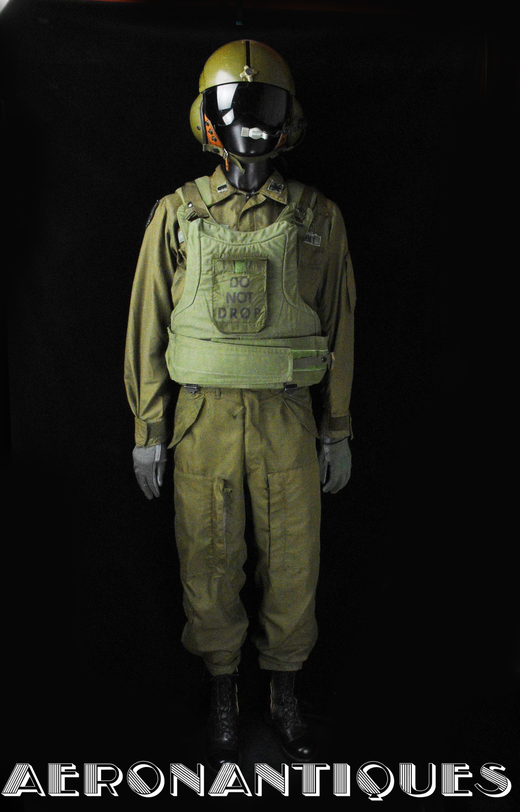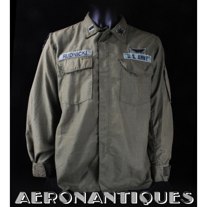 Ensemble chemise et pantalon de vol de pilote d'hélicoptère de l'aéromobile en matériau retardateur de flamme type Nomex. Daté 1971. Taille Medium Regular. Brevet de pilote de l'US Army, bande patronymique et bande US ARMY brodés de fabrication réglementaire, patches de la 1st Aviation Brigade sur l'épaule droite et ARADCOM (Army Air Defense Command) sur l'épaule gauche. Grade de 1st Lt et insigne générique Artillerie en coton brodé sur les pointes de col. Casque, ceinturon et gilet ne sont pas inclus. Comme toutes les unités de l'US Army, le Army Air Defense Command a dû fournir des hommes qui ont été affectés à divers unités dont la 1st Aviation brigade pour pallier le manque d'effectif dû à l'allongement inattendu de la guerre et le sentiment pacifiste grandissant au début des années 70 décourageant la source du volontariat.