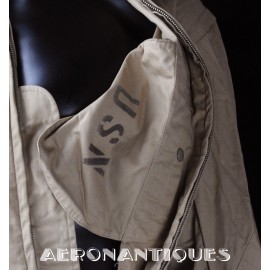 Combinaison de pilote US Marine Corps ou US Navy modèle M-426A. Modèle précoce sans la poche poitrine. Taille 42M. Fabrication ROYAL AIRSUIT INC. Tampon U.S.N sur la doublure de poche intérieure. Excellent état, sans déchirures ni réparations. Toutes le fermetures à glissière sont fonctionnelles (manches et jambes).