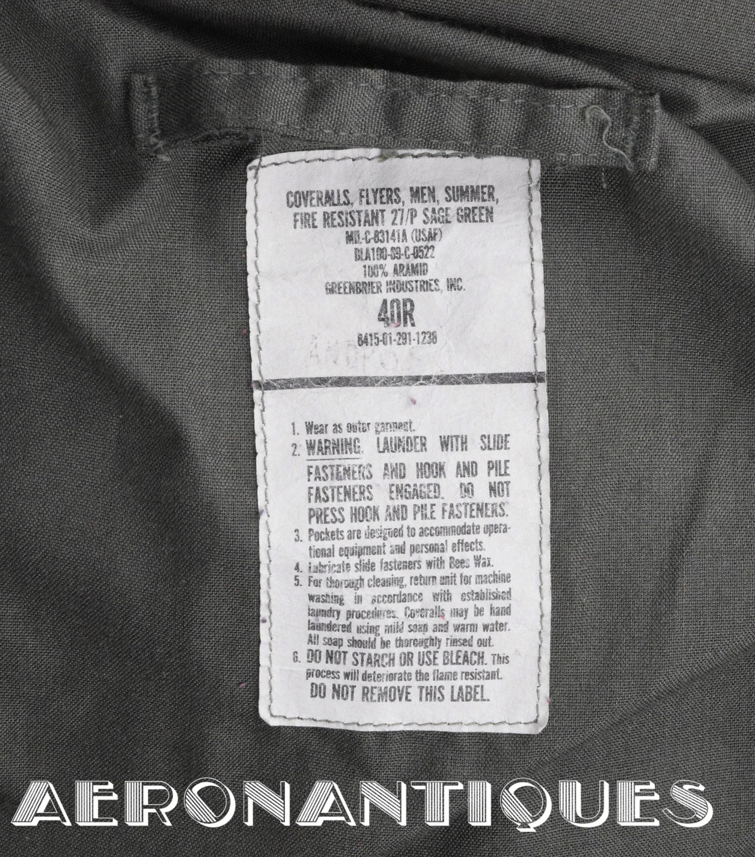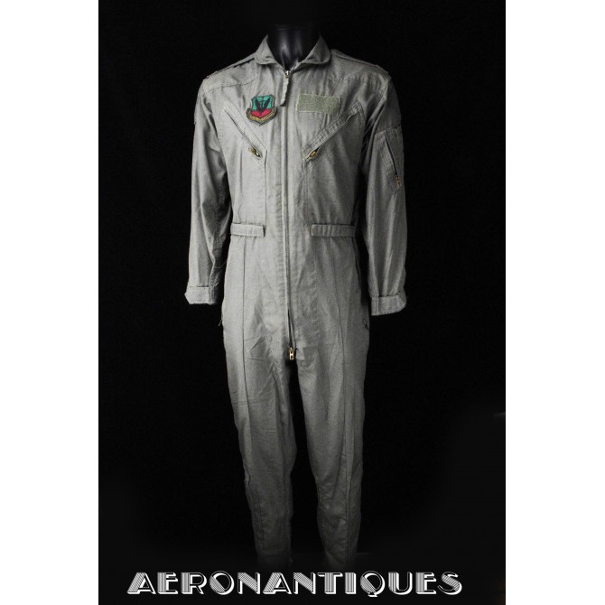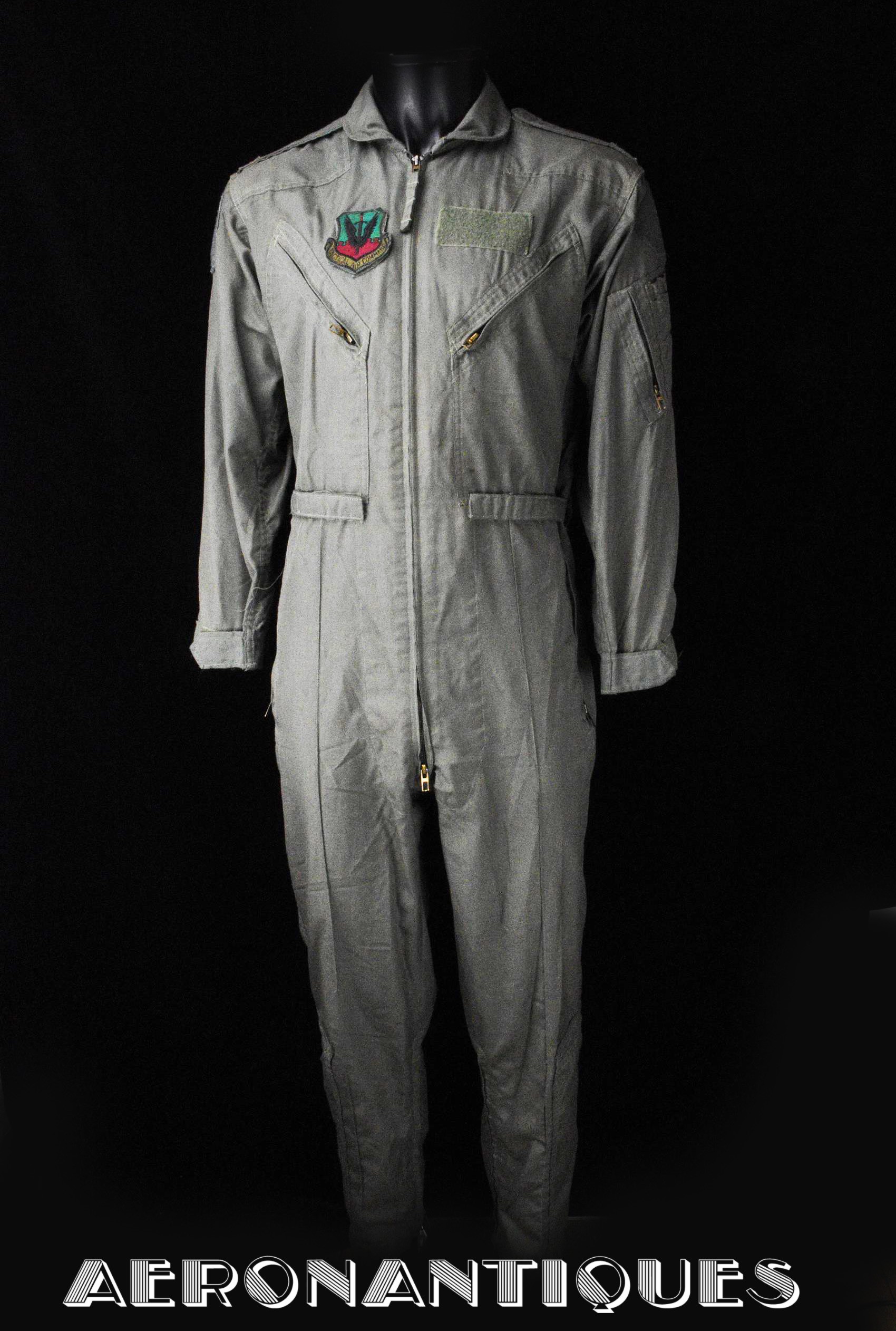Combinaison de vol en tissu ignifugé NOMEX type CWU-27. Taille 40R. Datée 1989. Patch du TACTICAL AIR COMMAND sur la poitrine droite. Grades de Major sur les pattes d'épaule. Excellent état sans taches ni déchirures. Toutes les fermetures à glissière sont en état de fonctionnement.