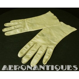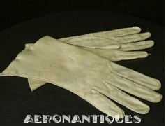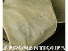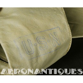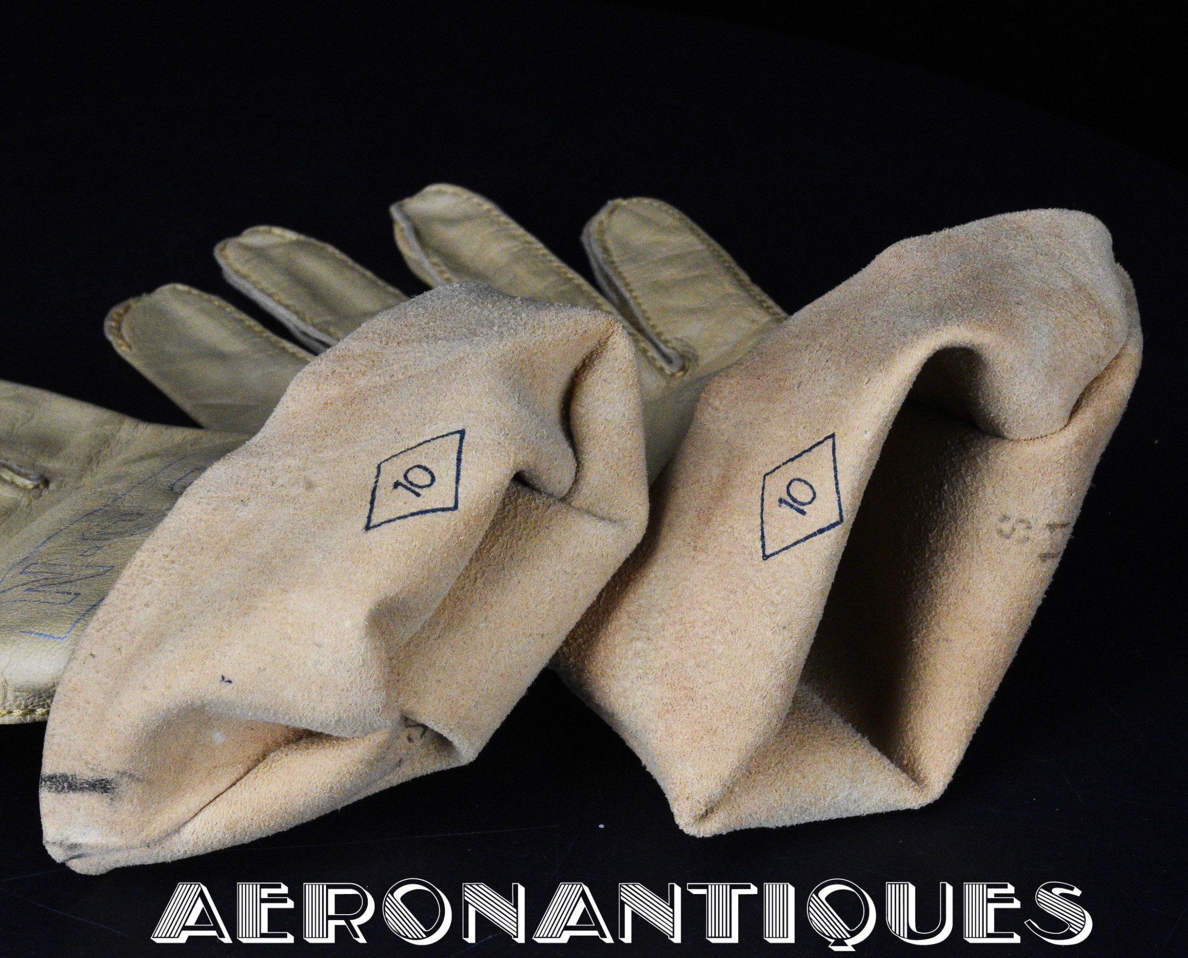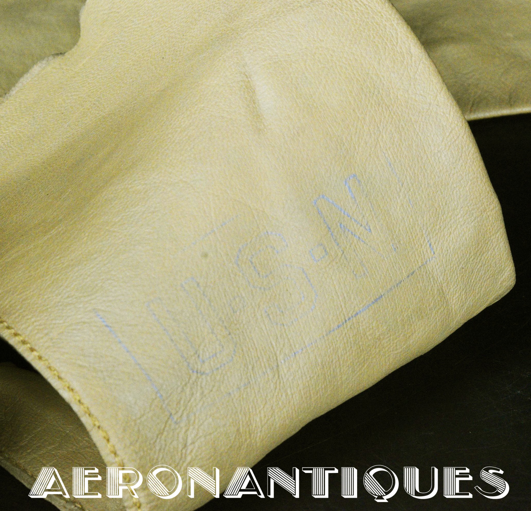 Paire de gants de vole de pilote de l'US Navy en cuir naturel non doublé, modèle été. Fabrication Deuxième Guerre Mondiale. Estampillés "U.S.N" en lettres argent dans un cartouche (qui disparaîtra par la suite sur les modèles après-guerre). Taille 10. Neufs de stock.