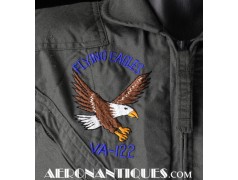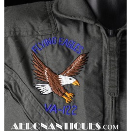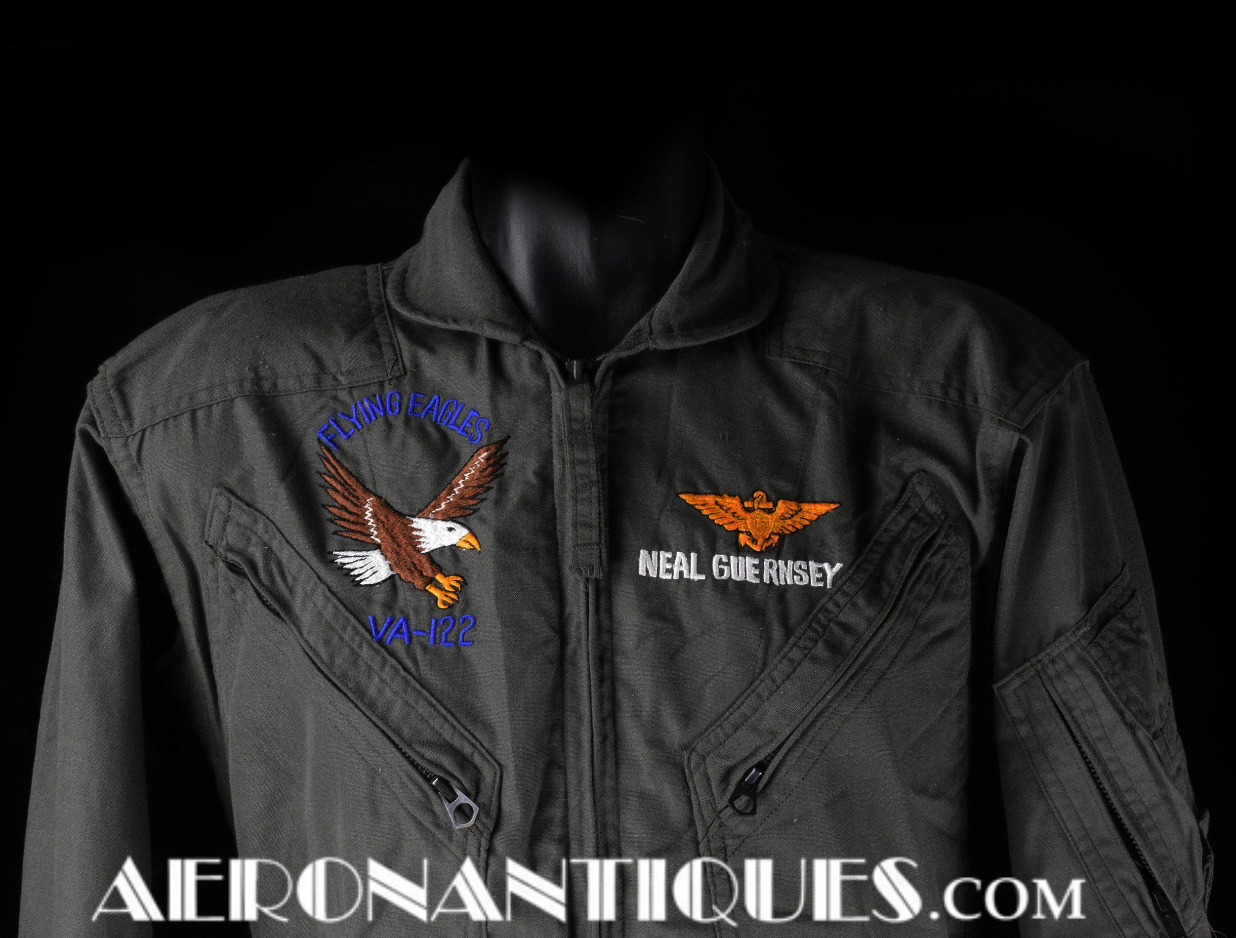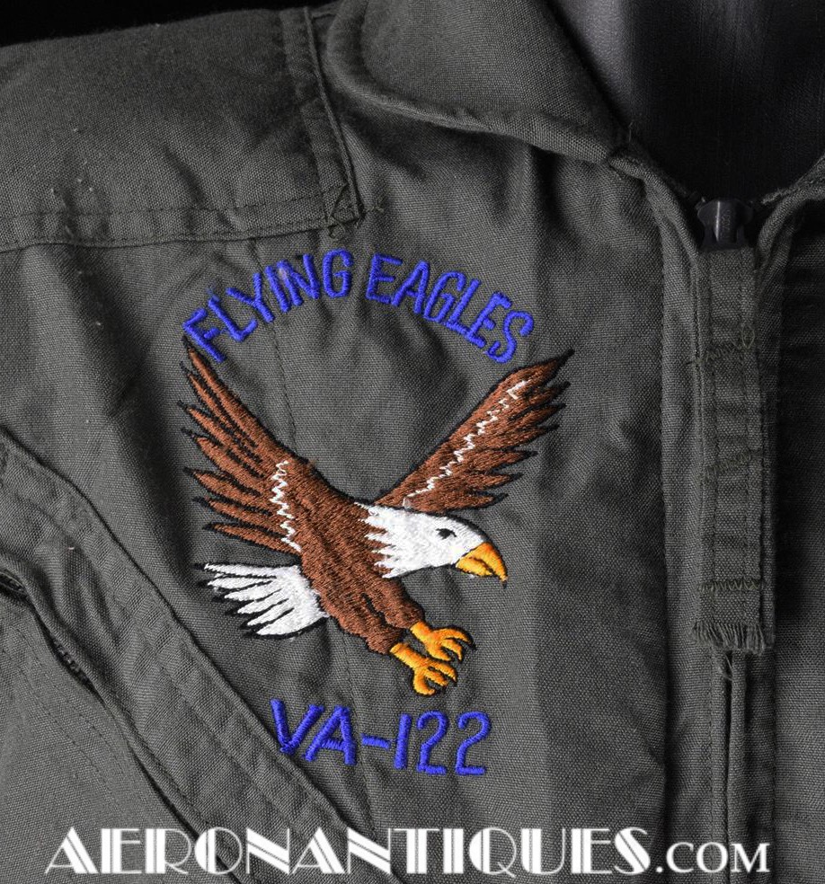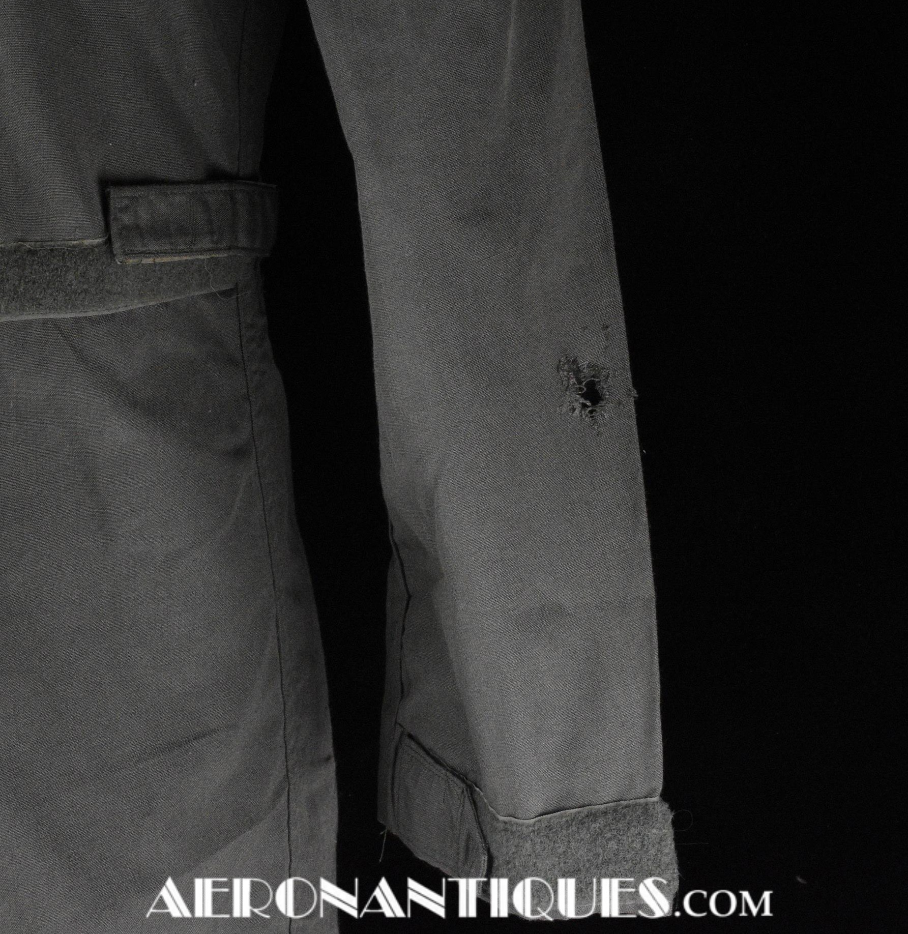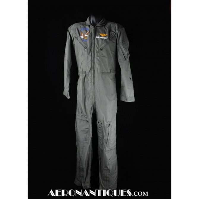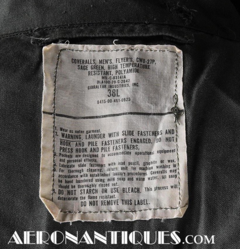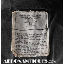 Combinaison de vol en tissu ignifugé NOMEX type CWU-27. Taille 38L. Datée 1979. Attribuée à un instructeur sur A-7s Corsair II avec la VA-122 à la Naval Air Station Lemoore dans les années 80. Accrocs visibles sur les photos. Toutes les fermetures à glissière sont en état de fonctionnement.